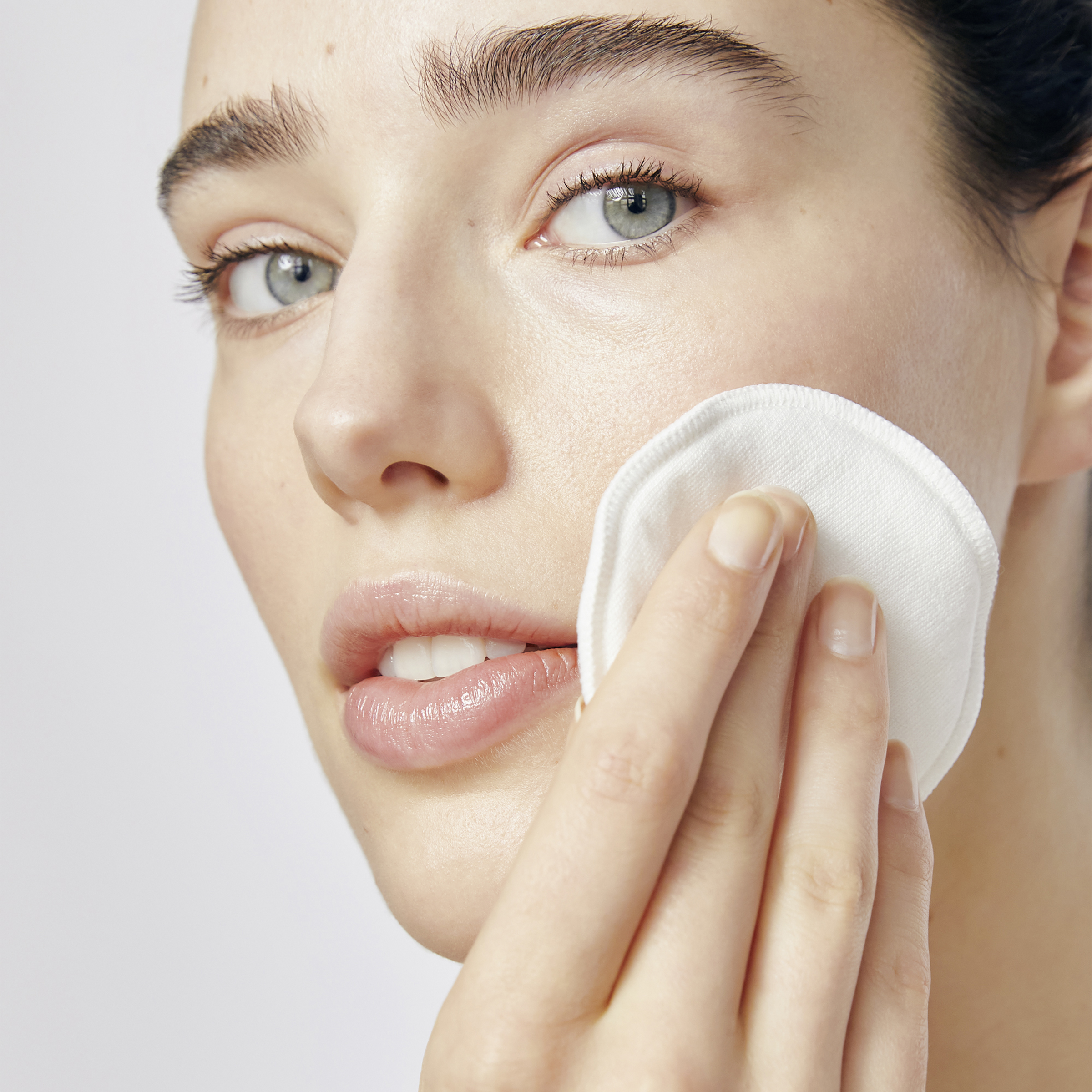 Reinigen Sie Ihr Gesicht. Tränken Sie ein Wattepad mit dem Gesichtswasser und streichen Sie damit sanft über Gesicht, Hals und Dekolleté. Dabei die Augenpartie aussparen.