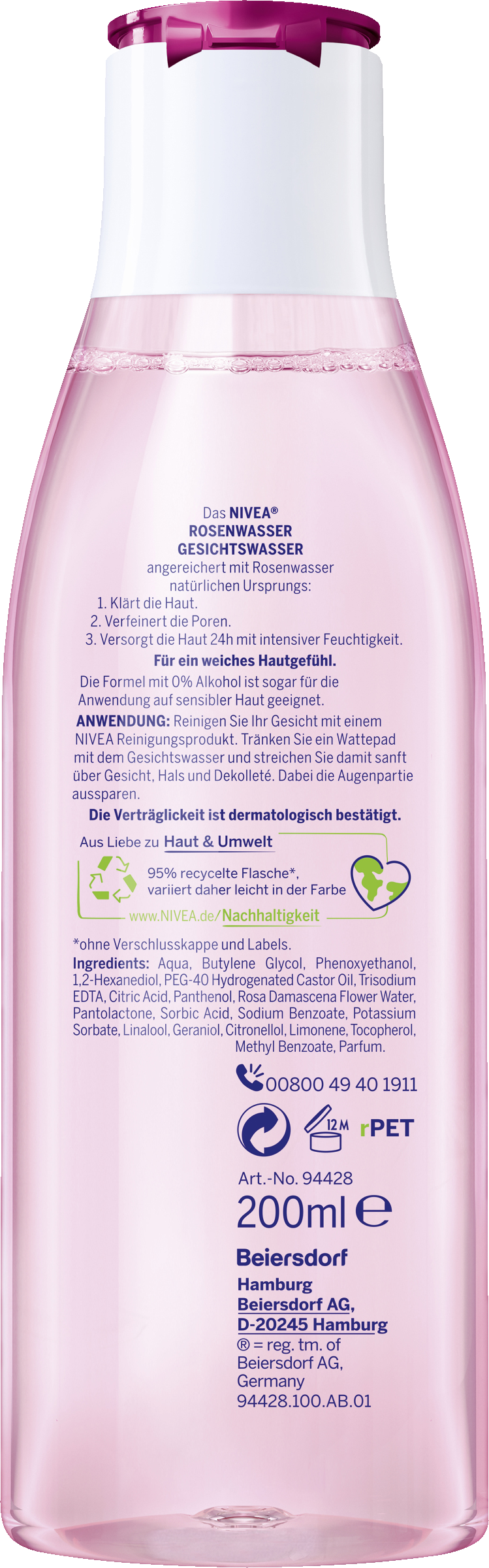 Das NIVEA Rosenwasser Gesichtswasser mit Rosenwasser natürlichen Ursprungs klärt die Haut und verfeinert die Poren. Dank der Formel mit 0% Alkohol ist das Gesichtswasser für alle Hauttypen inklusive sensibler Haut geeignet. Die Hautverträglichkeit ist dermatologisch getestet. Es versorgt die Haut 24h mit intensiver Feuchtigkeit und sorgt für ein weiches Hautgefühl. Nach Reinigung des Gesichts mit einem Waschgel anwenden. Dazu ein Wattepad mit dem Gesichtswasser tränken und sanft über die Haut streichen. Anwendbar für Gesicht, Hals und Dekolleté. Dabei die Augenpartie aussparen. Ansschließend eine Tagespflege auftragen.