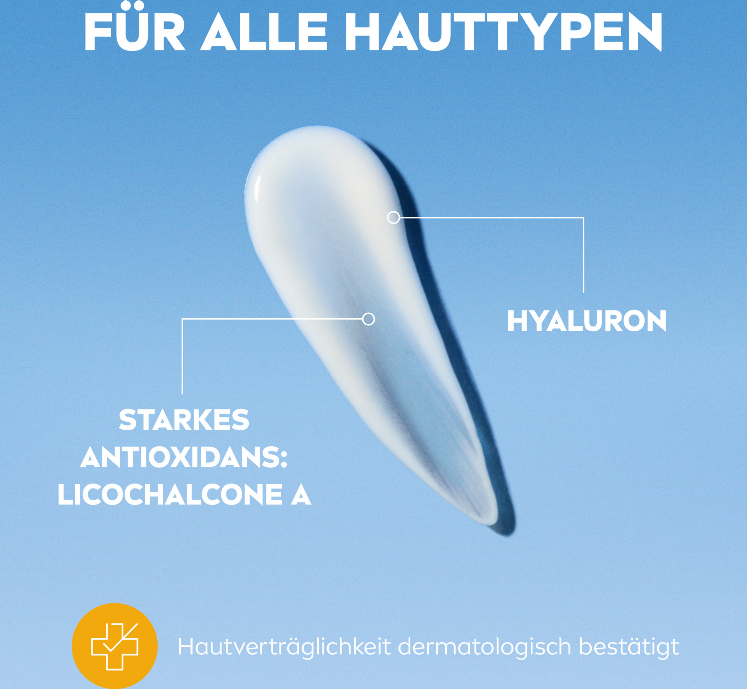Sie ist angereichert mit zwei Arten von Hyaluron sowie Licochalcone A, einem starken Antioxidans. Während die Formel mit langkettigem Hyaluron die oberen Hautschichten mit Feuchtigkeit versorgt, dringt das kurzkettige Hyaluron tiefer in die Haut ein und stimuliert ihre natürliche Hyaluronproduktion (in vitro). Zusätzlich aktiviert Licochalcone A den hauteigenen Abwehrmechanismus und schützt die Hautzellen vor oxidativem Stress.