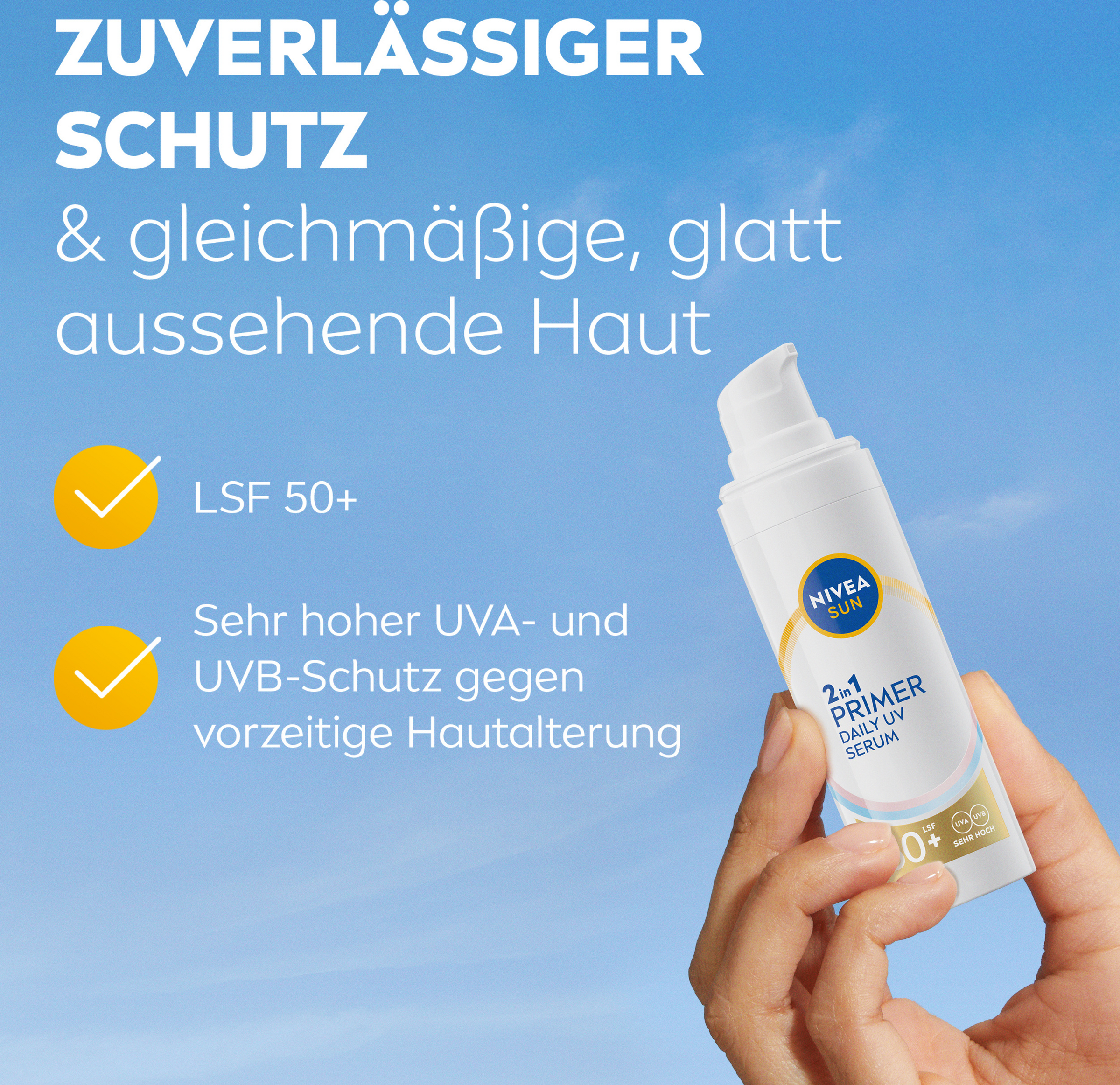 NIVEA SUN 2in1 Primer Daily UV Serum LSF 50+ wurde speziell entwickelt, um die Gesichtshaut in Sekundenschnelle zu schützen und zu glätten. Dieser innovative, leichte Sonnenschutz schützt die gesunde Haut vor UVA/UVB-Strahlen und vor den Auswirkungen des hochenergetischen sichtbaren Lichts, wie z.B. vorzeitige Hautalterung.
