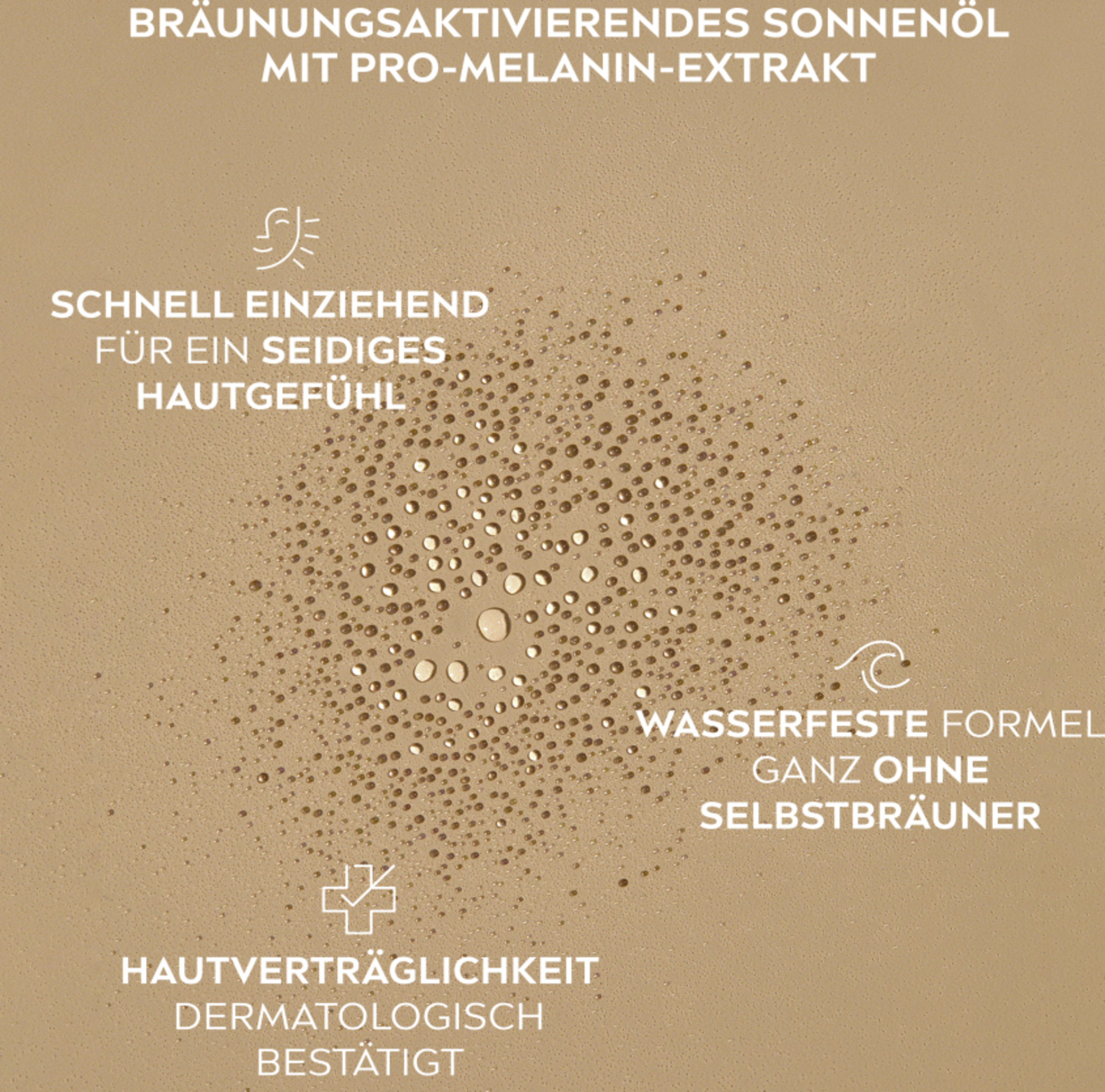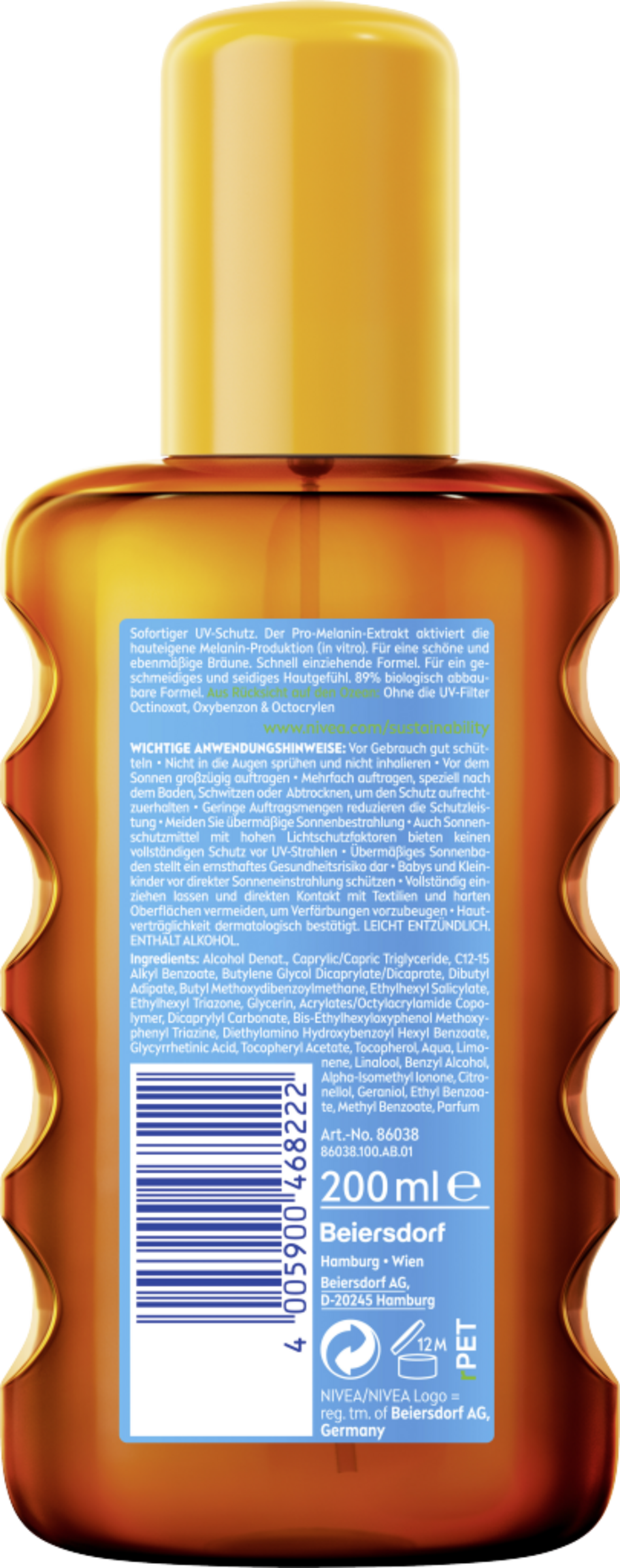 Das NIVEA SUN Schutz & Bräune Sonnenöl mit LSF 30 bietet sofortigen und hochwirksamen UVA- & UVB-Schutz gegen Sonnenbrand und vorzeitige Hautalterung. Die Formel mit Pro-Melanin-Extrakt aktiviert die hauteigene Melanin-Produktion und unterstützt damit den natürlichen Bräunungsprozess für eine ebenmäßige und gesund aussehende Bräune - ganz ohne Selbstbräuner. Die wasserfeste Formel zieht schnell ein für ein geschmeidiges und seidiges Hautgefühl. Hautverträglichkeit dermatologisch bestätigt.