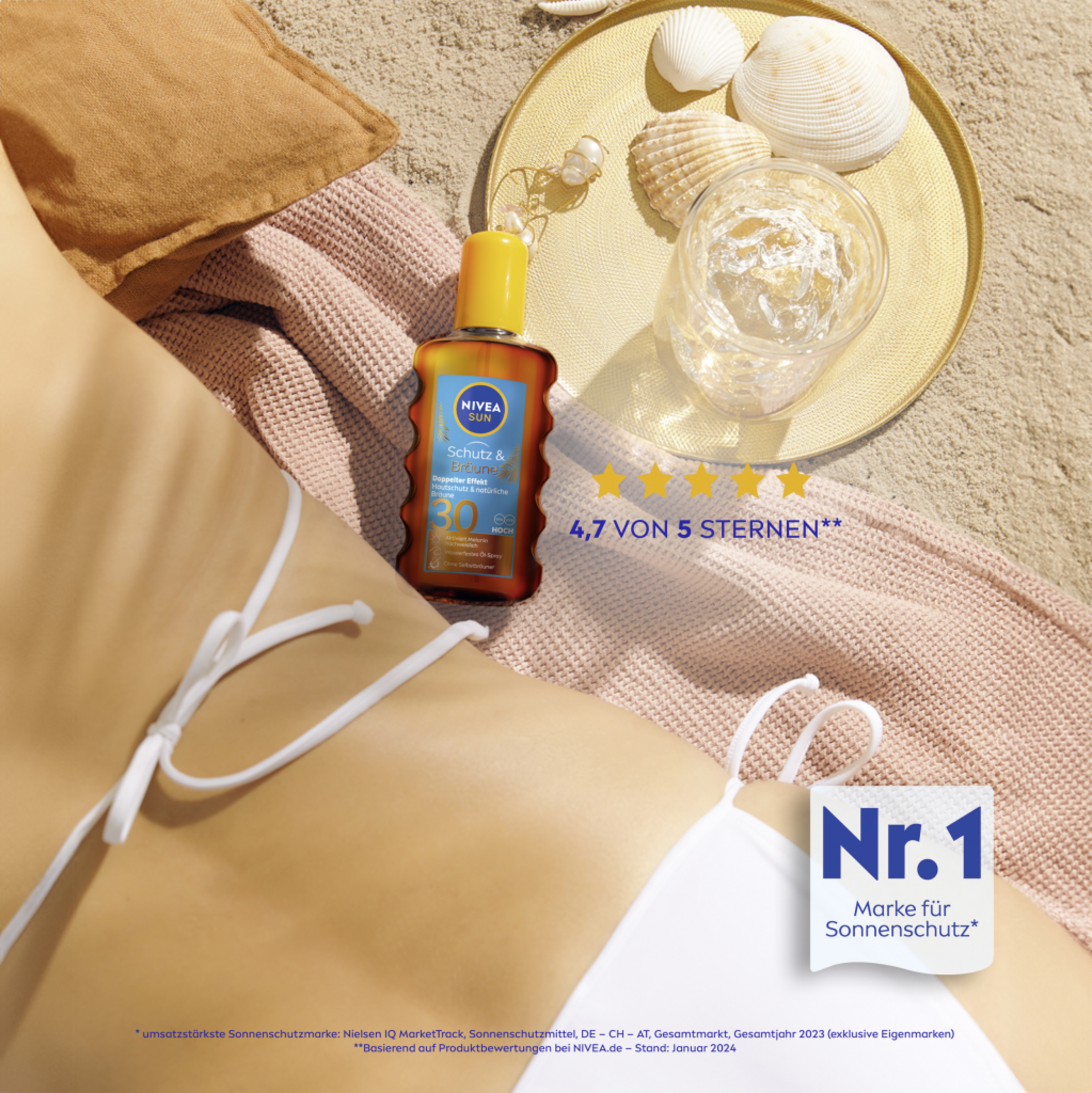 NIVEA hat sich als Ziel gesetzt, die Auswirkungen auf die Umwelt zu minimieren. Deshalb ist das NIVEA SUN Schutz & Bräune Sonnenöl, aus Rücksicht auf den Ozean, frei von den umweltschädlichen UV-Filtern Octinoxat und Oxybenzon. Für eine langanhaltende, schöne Bräune – ganz ohne Selbstbräuner: NIVEA SUN Schutz & Bräune Sonnenöl mit LSF 30.