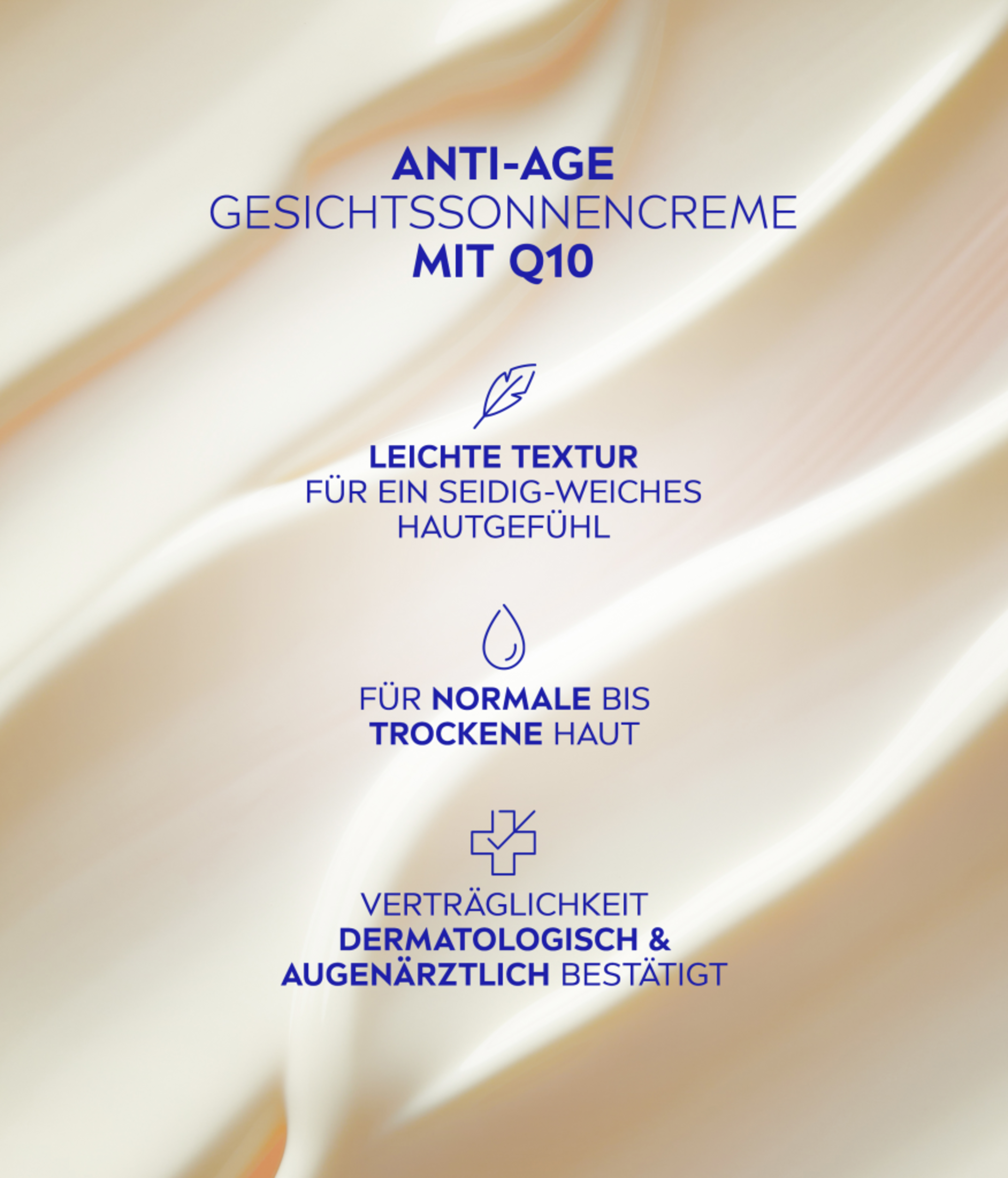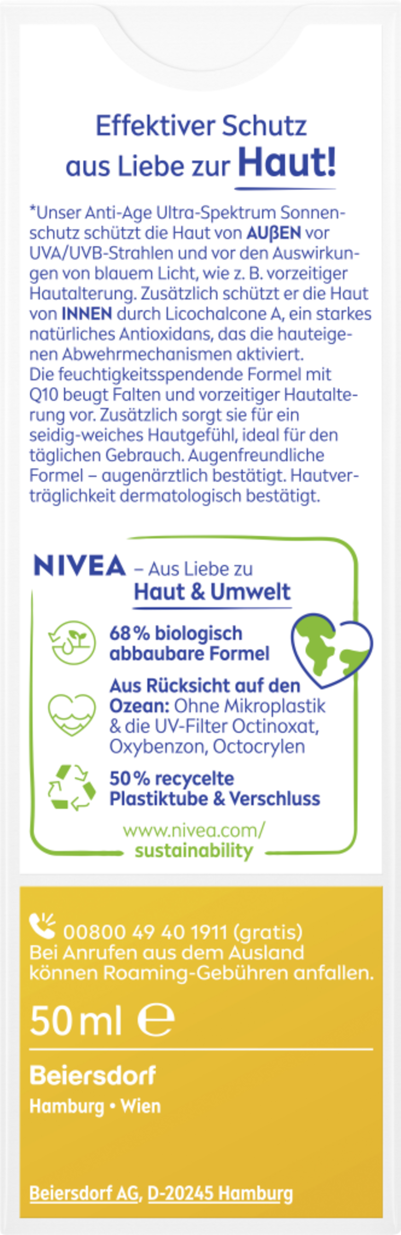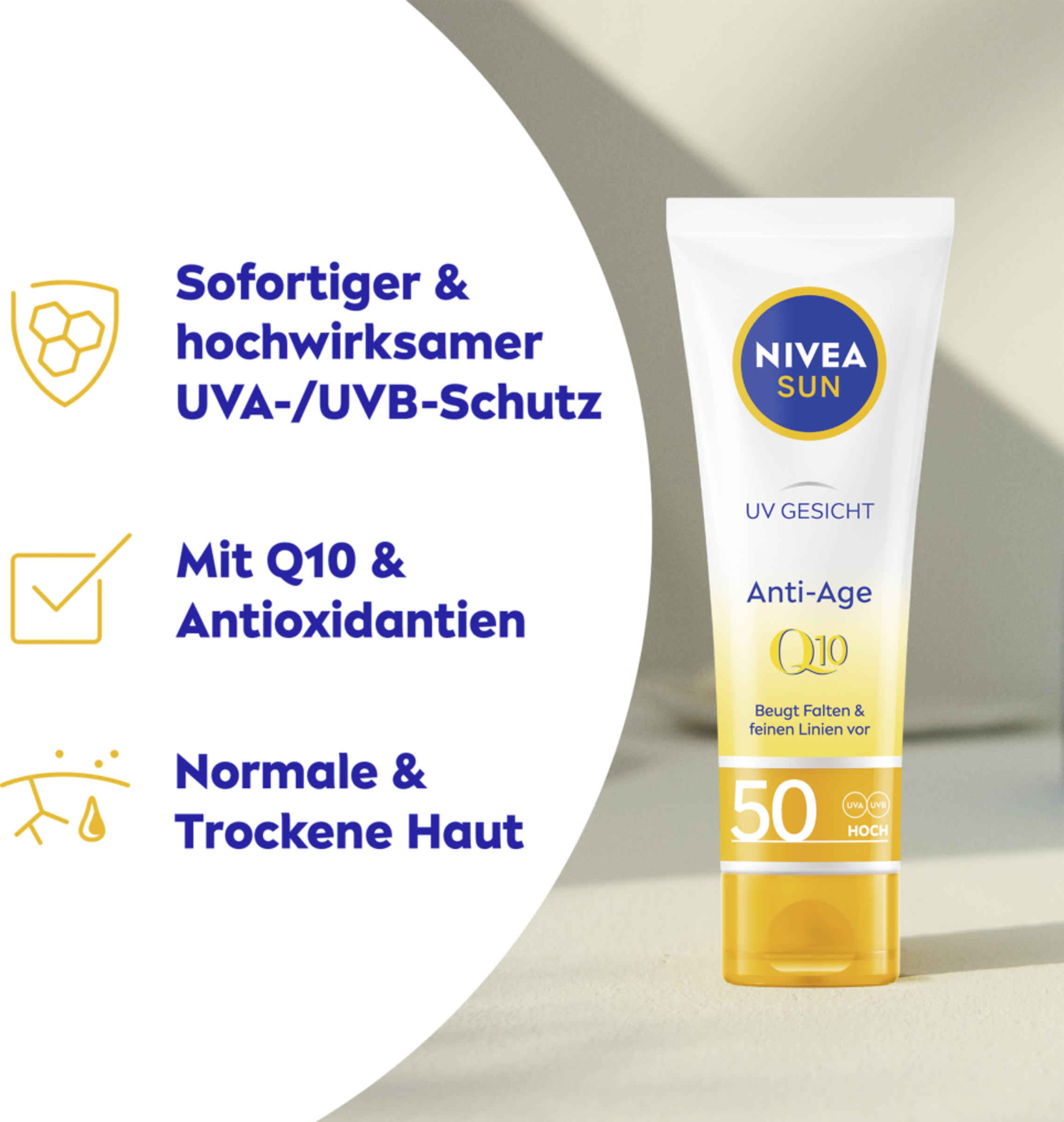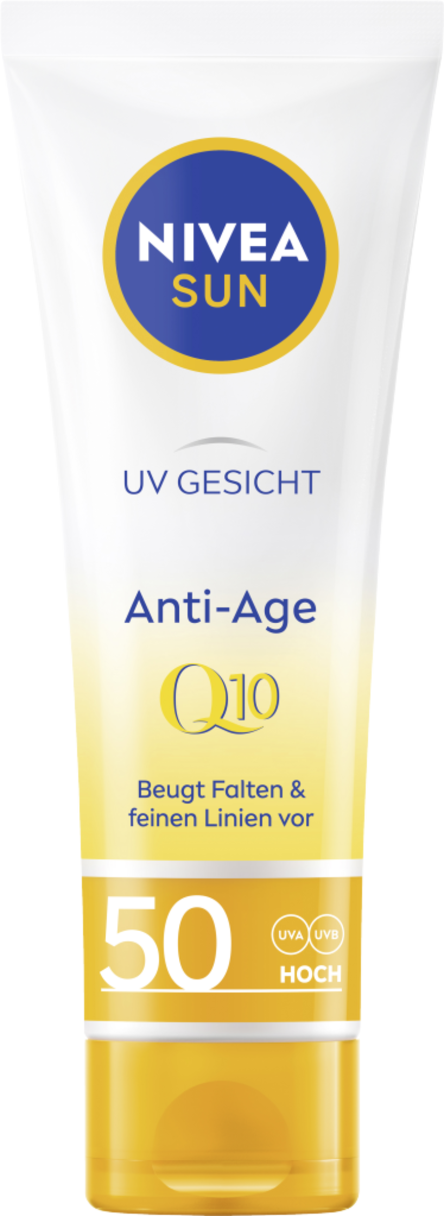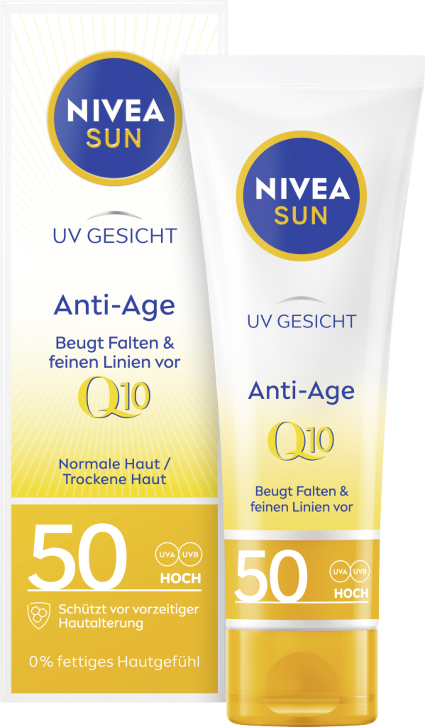 Die NIVEA SUN Anti-Age Sonnencreme für das Gesicht mit LSF 50 schützt sofort und hochwirksam vor UVA- & UVB-Strahlung, Sonnenbrand und den Effekten von blauem Licht. Der feuchtigkeitsspendende Anti-Aging Sonnenschutz mit Q10 beugt sonnenbedingter Hautalterung, wie Falten und Pigmentflecken, vor. Zusätzlich ist die leichte Textur dieser Gesichts-Sonnencreme ideal für die tägliche Anwendung & den Alltag. Die handliche Form ist perfekt für unterwegs, ob zum Wandern, Skifahren oder anderen Reisen. Die Hautverträglichkeit der NIVEA SUN Anti-Age Sonnencreme LSF 50 ist dermatologisch bestätigt. NIVEA hat sich als Ziel gesetzt, die Auswirkungen auf die Umwelt zu minimieren. Aus Rücksicht auf den Ozean ist diese Sonnencreme frei von den umweltschädlichen UV-Filtern Octocrylen, Octinoxat und Oxybenzon. Der perfekte Anti-Aging Sonnenschutz für Gesicht, Hals und Dekolleté: NIVEA SUN Anti-Aging Sonnencreme LSF 50.