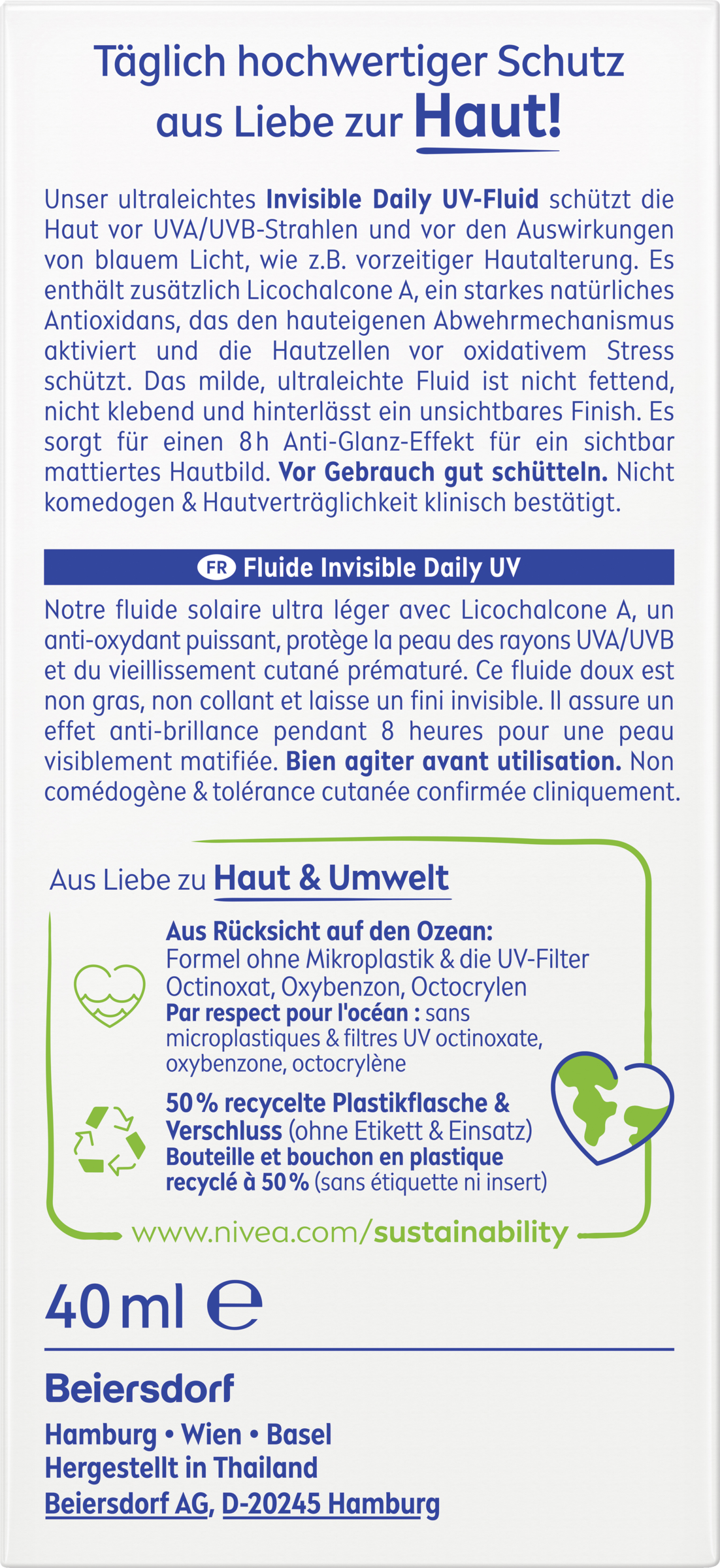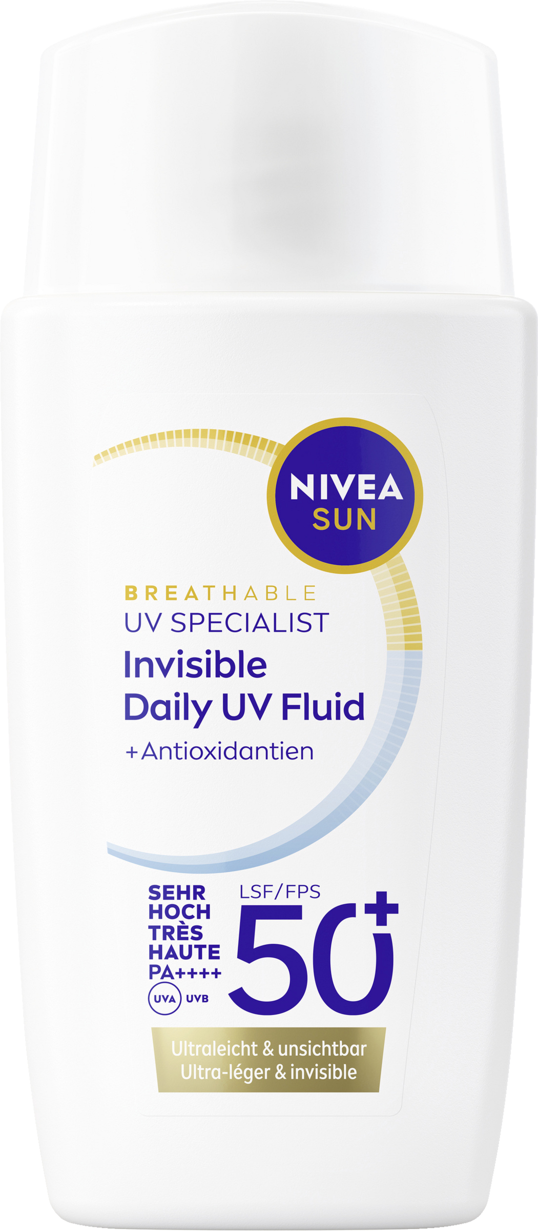 - das ultraleichte Invisible Daily UV-Fluid schützt die Haut von AUßEN vor UVA/UVB-Strahlen und vor den Auswirkungen von blauem Licht, wie z. B. vorzeitiger Hautalterung. Es schützt die Haut auch von INNEN dank eines starken natürlichen Antioxidans