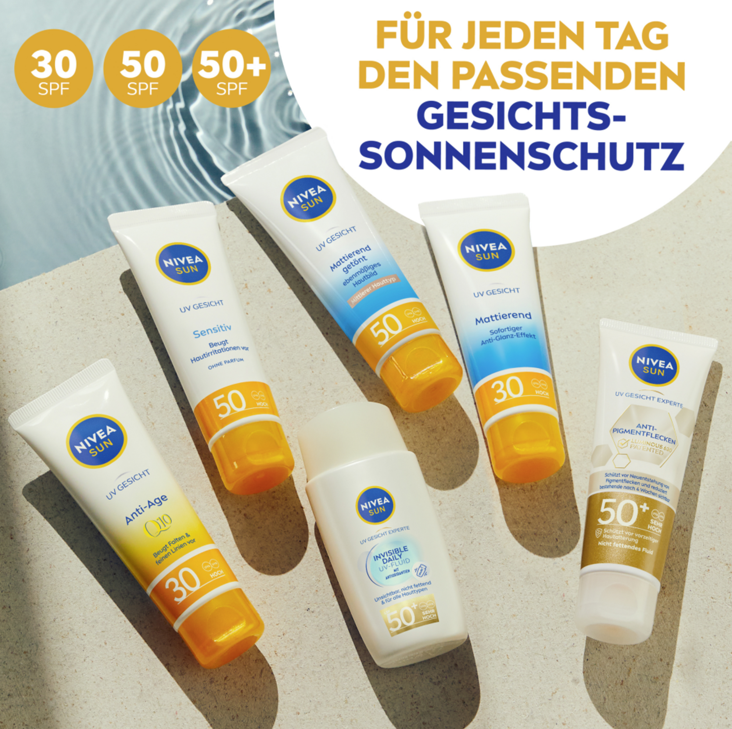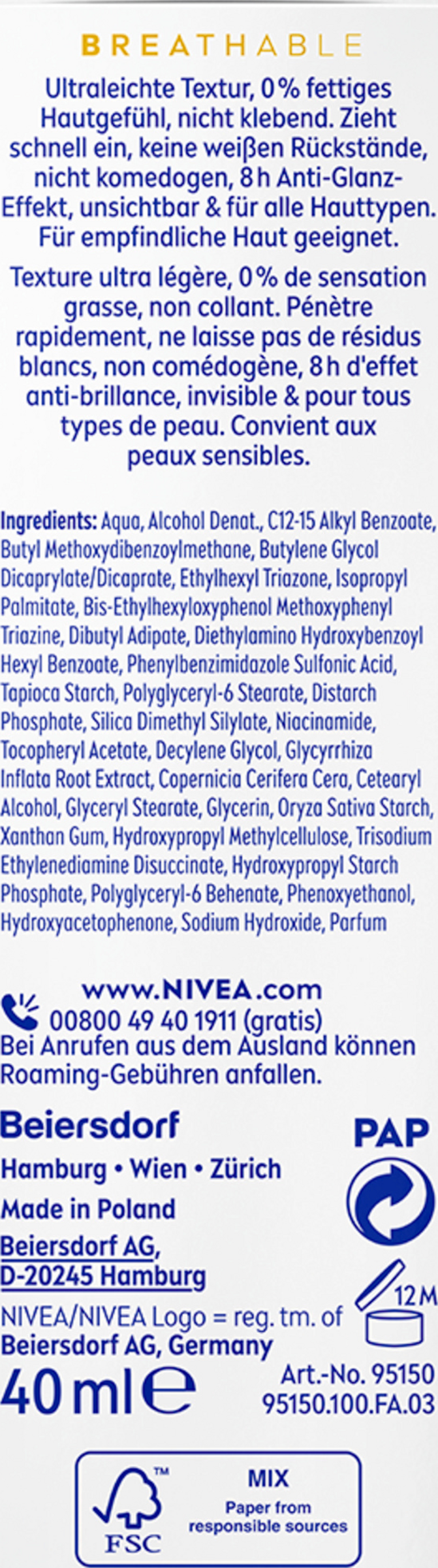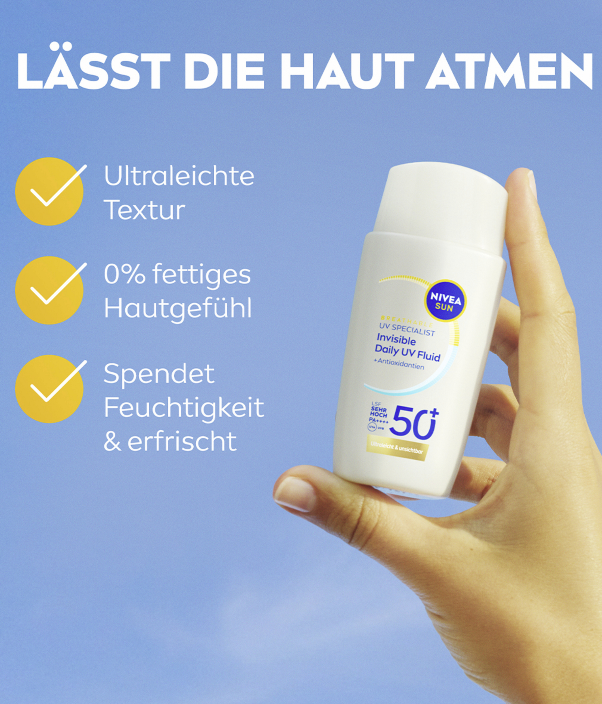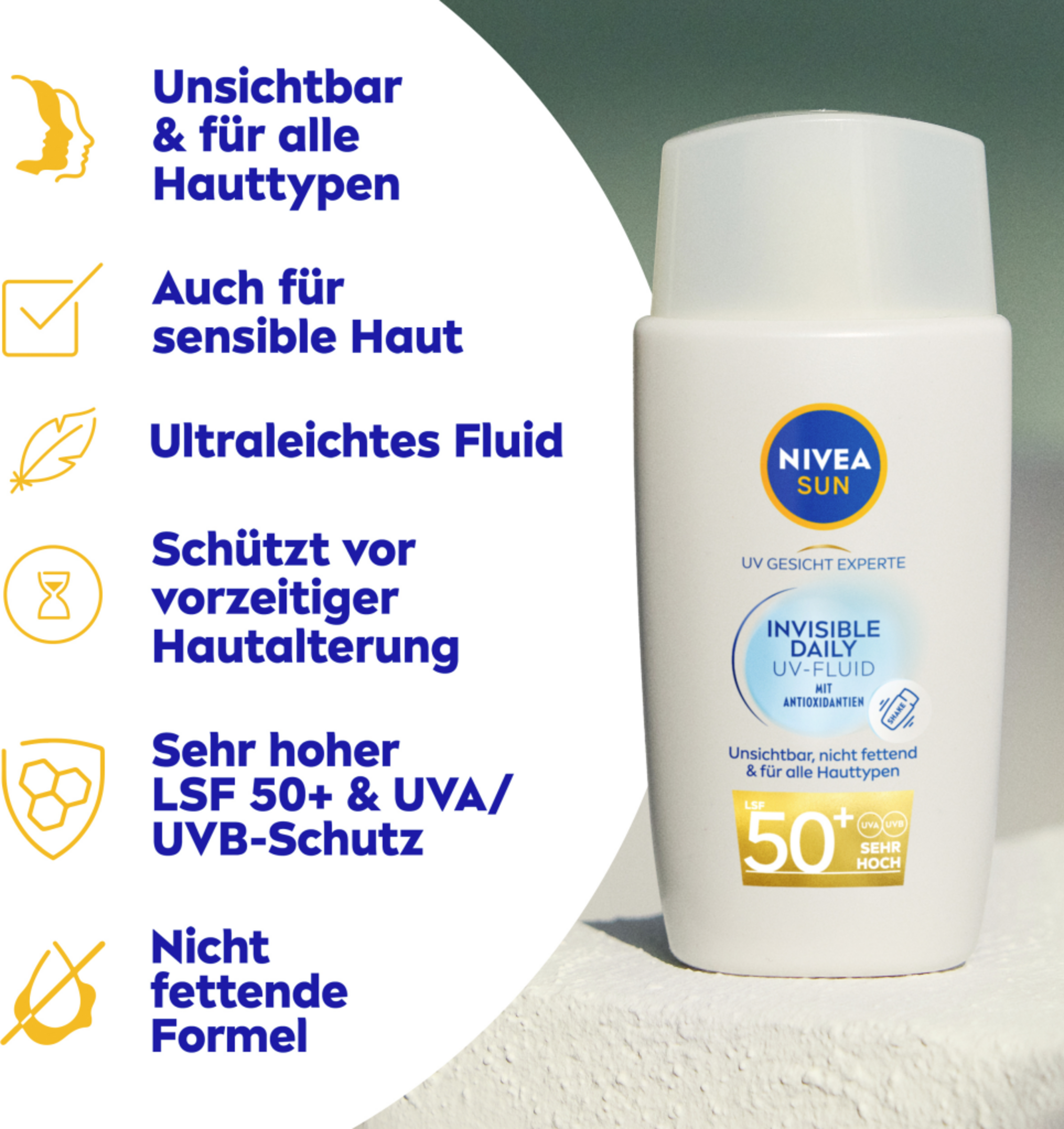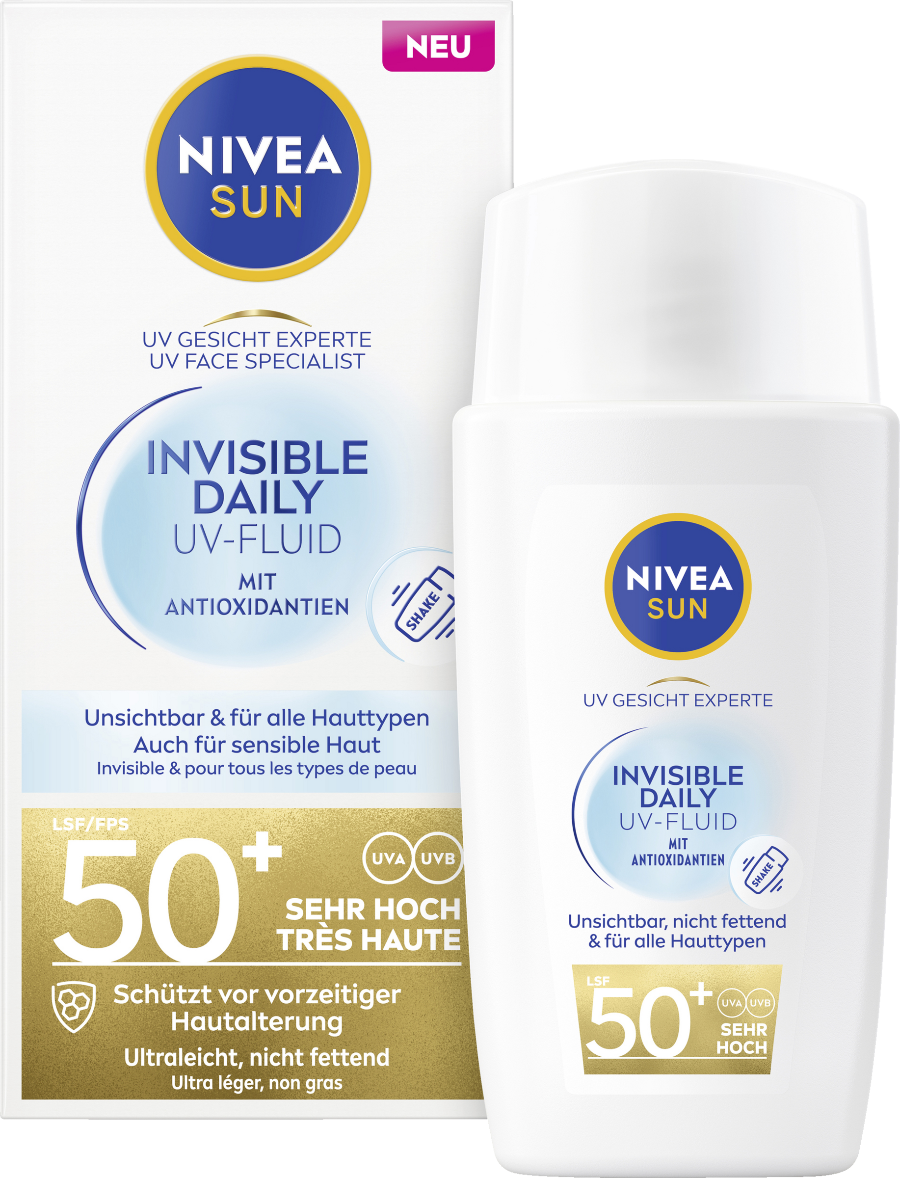 NIVEA SUN UV Gesicht Experte Invisible Daily UV Fluid SPF 50+ wurde speziell für die empfindliche Gesichtshaut entwickelt. Das ultraleichte UV-Fluid schützt die Haut von AUßEN vor UVA/UVBStrahlen und vor den Auswirkungen von blauem Licht, wie z. B. vorzeitiger Hautalterung. Das UV Schutz Fluid schützt die Haut auch von INNEN dank Licochalcone A, ein starkes natürliches Antioxidans, das den hauteigenen Abwehrmechanismen aktiviert und die Hautzellen vor oxidativem Stress schützt. Das milde, ultraleichte Fluid ist nicht fettend, nicht klebend und hinterlässt ein unsichtbares Finish. Es sorgt für einen 8h Anti-Glanz-Effekt für ein sichtbar mattiertes Hautbild, ein geschmeidiges Hautgefühl und eine gesund aussehende Haut. NIVEA SUN UV Gesicht Experte Invisible Daily UV Fluid SPF 50+ ist für alle Hauttypen, auch für sensible Haut geeignet. Vor Gebrauch gut schütteln. Nicht komedogen & Hautverträglichkeit klinisch bestätigt.