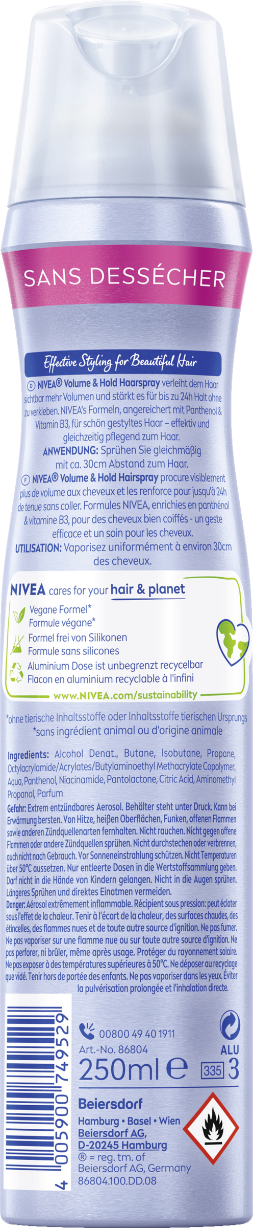 Das NIVEA Volume Care Styling Spray bietet sichtbar mehr Volumen und extra starken Halt für bis zu 24h. Dank der leistungsstarken Formel verleiht das Haarspray dem Haar Fülle und Standkraft vom Ansatz an, ohne es zu beschweren – für langanhaltendes Volumen und natürliche Bewegung. Die vegane*, silikonfreie Formel mit Panthenol & Vitamin B3 stärkt und schützt das Haar vor äußeren Schäden und Stressfaktoren.