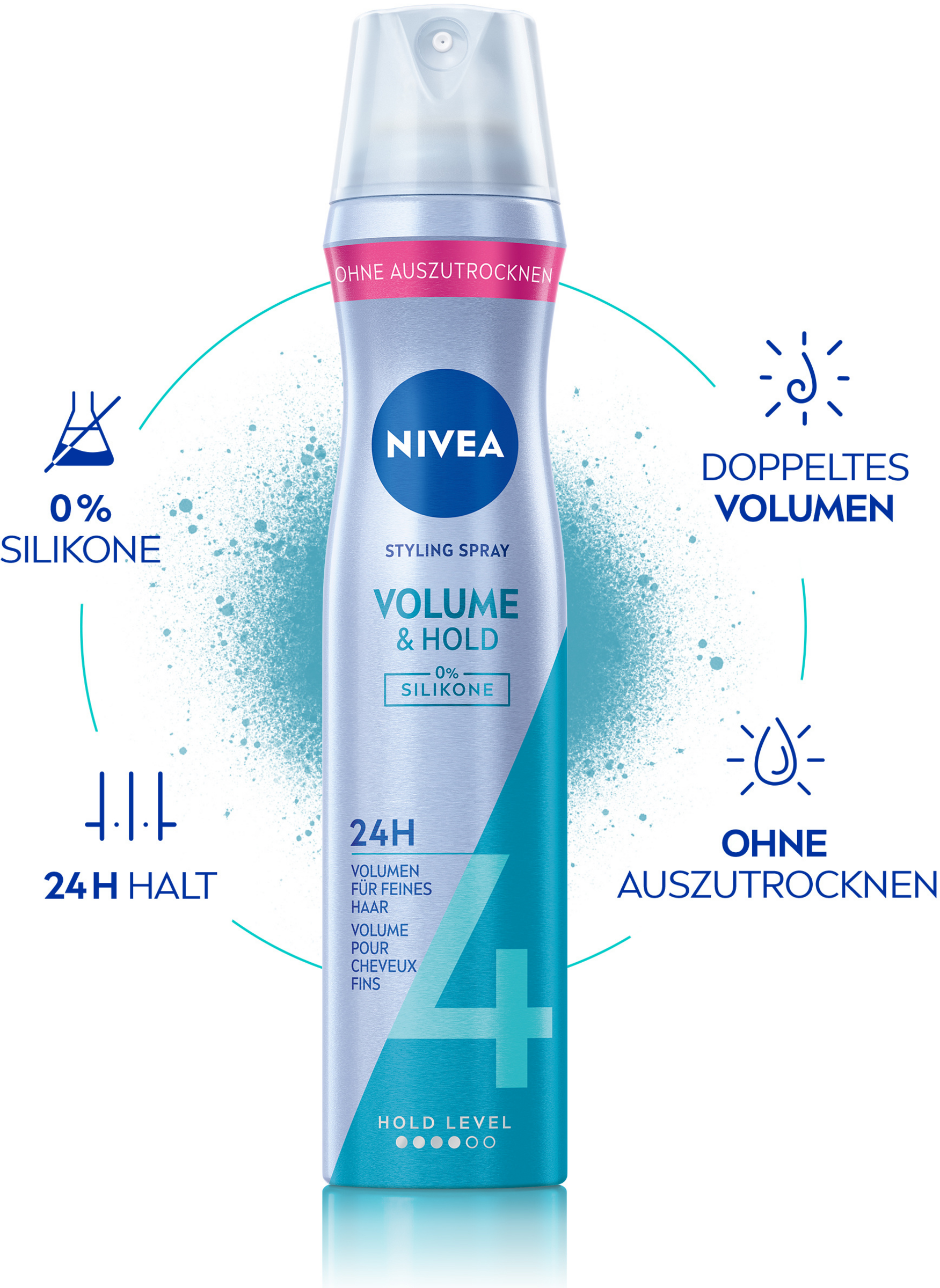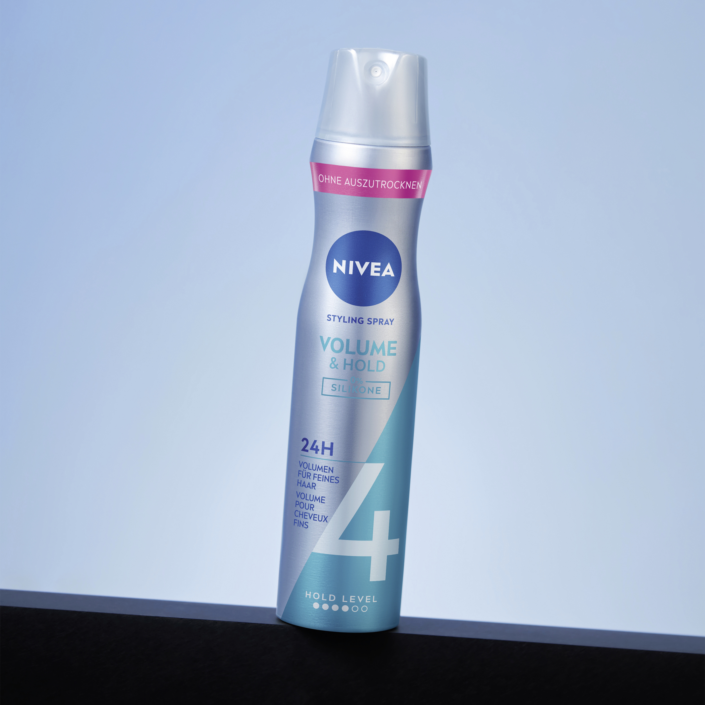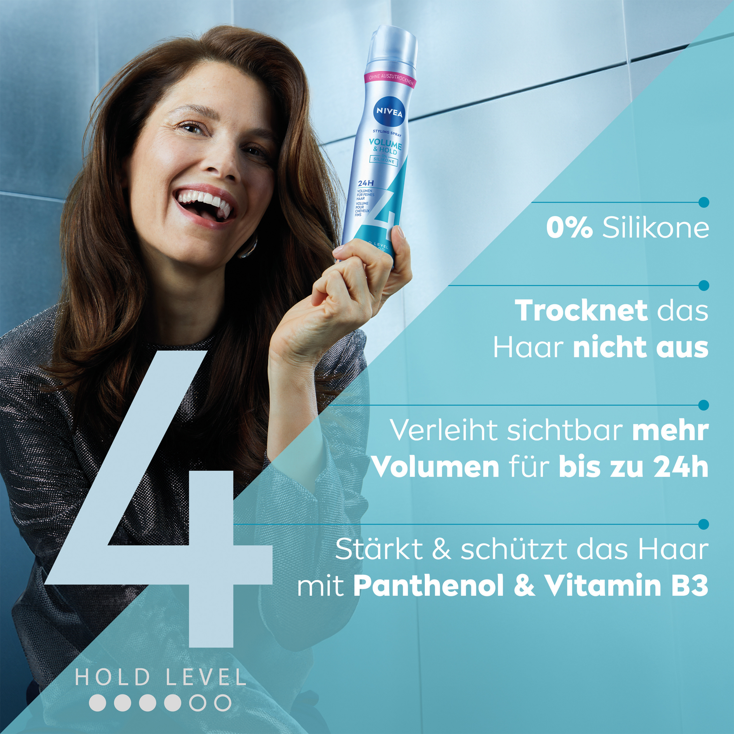 Die Stylingformel ist aktiv pflegend, trocknet nicht aus und lässt sich leicht auskämmen. Kräftig, schön gestyltes Haar mit dem NIVEA Volume Care Styling Haarspray. In Kombination mit dem Styling Mousse bieten die beiden NIVEA Produkte mit Hold Level 4 Volumen für feines Haar. Perfekt für voluminöse Styles mit überzeugendem Glanz und langer Haltbarkeit – Tag für Tag.