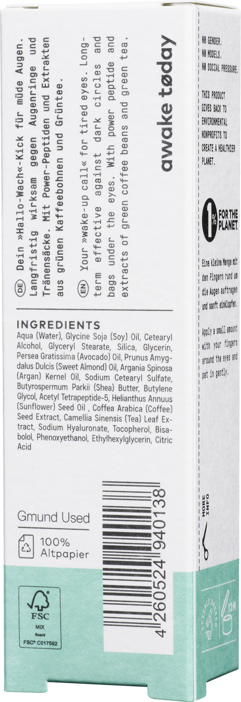 Unsere Augenpflege ist ein Alleskönner: Eine kleine Menge täglich reicht schon um Deine Augenpartie von einer sichtbaren Erschöpfung zu befreien. Der Peptidkomplex Eyeseryl® reduziert nicht nur dunkle Augenringe, sondern auch das Volumen von Tränensäcken, zudem spendet er Feuchtigkeit und wirkt Falten entgegen. Panthenol entspannt die Haut und Hyaluronsäure sorgt für die richitge Menge Feuchtigkeit. Bisabolol (als Hauptbestandteil des Kamillenöls) ist ebenfalls ein Hautberuhiger und schafft in Kombination mit Argan-, Mandel- und Avocadoöl für Geschmeidigkeit.