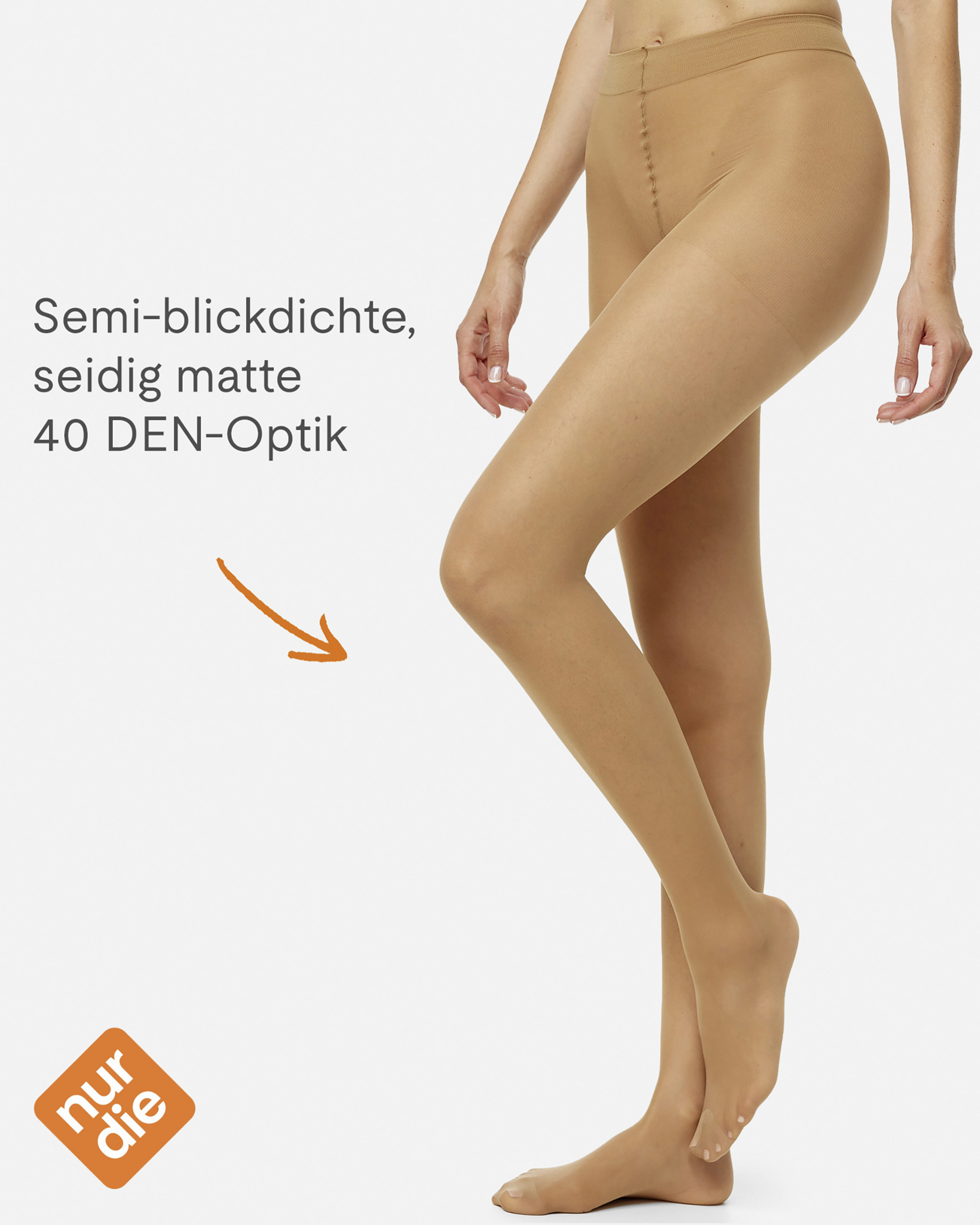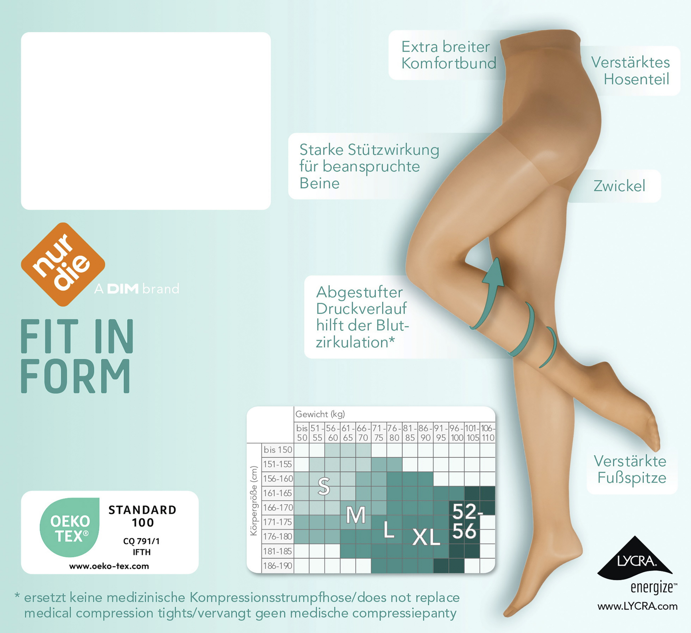 Die Fit in Form Strumpfhose von NUR DIE in semi-blickdichter und seidig matter 40 DEN-Optik unterstützt die Blutzirkulation beanspruchter Beine durch einen anatomisch abgestuften Druckverlauf. Die Feinstrumpfhose mit starker Stützwirkung sitzt perfekt durch den Einsatz der Faser LYCRA®und bietet eine bequeme Passform durch breiten Bund und Zwickel. Die Fußspitze ist für eine verlängerte Haltbarkeit verstärkt.