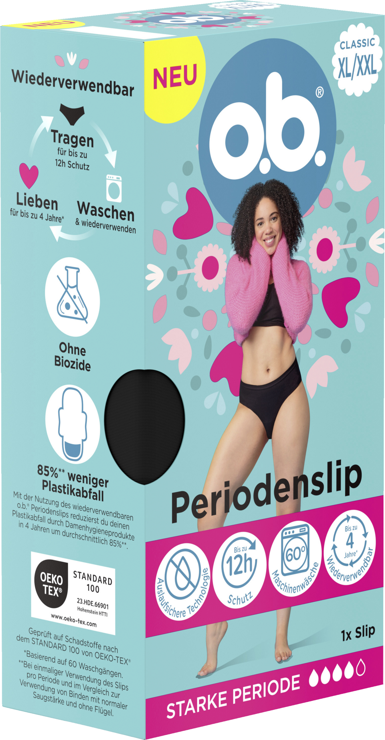 Auslaufsicher für bis zu 12 Stunden: Der o.b. Periodenslip für starke Periode mit saugstarkem Kern schützt bis zu 12 Stunden vor Auslaufen und sorgt für ein trockenes Gefühl. Dank des o.b. FormFlex Designs passt sich die Menstruationsunterwäsche deiner individuellen Körperform an, ist so komfortabel & bequem wie deine normale Unterwäsche und in den Größen XS / S, M / L, XL / XXL erhältlich. Den Periodenslip nach Gebrauch einfach mit kaltem Wasser ausspülen und in der Waschmaschine bei 60°C für mindestens 30 Minuten mit deinem Standardwaschmittel hygienisch waschen.