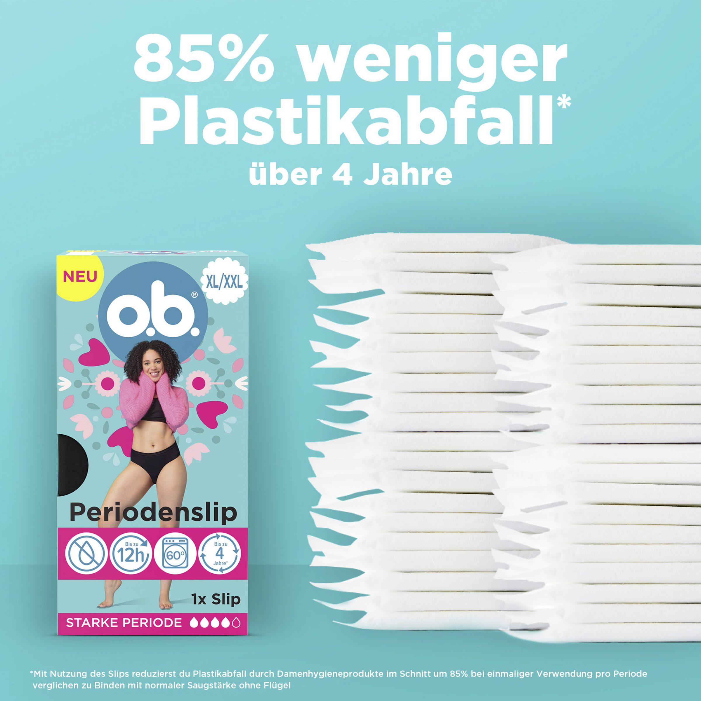 *bei einmaliger Verwendung des Slips pro Periode über 4 Jahre und im Vergleich zu Binden mit normaler Saugstärke ohne Flügel