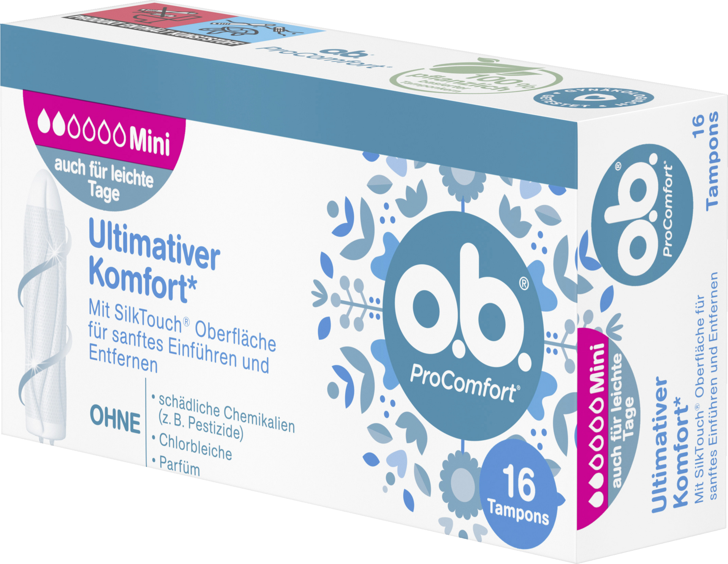 - o.b. ProComfort für ultimativen Komfort* (*innerhalb des o.b. Sortiments). Die SilkTouch Oberfläche sorgt für ein besonders sanftes Einführen und Entfernen