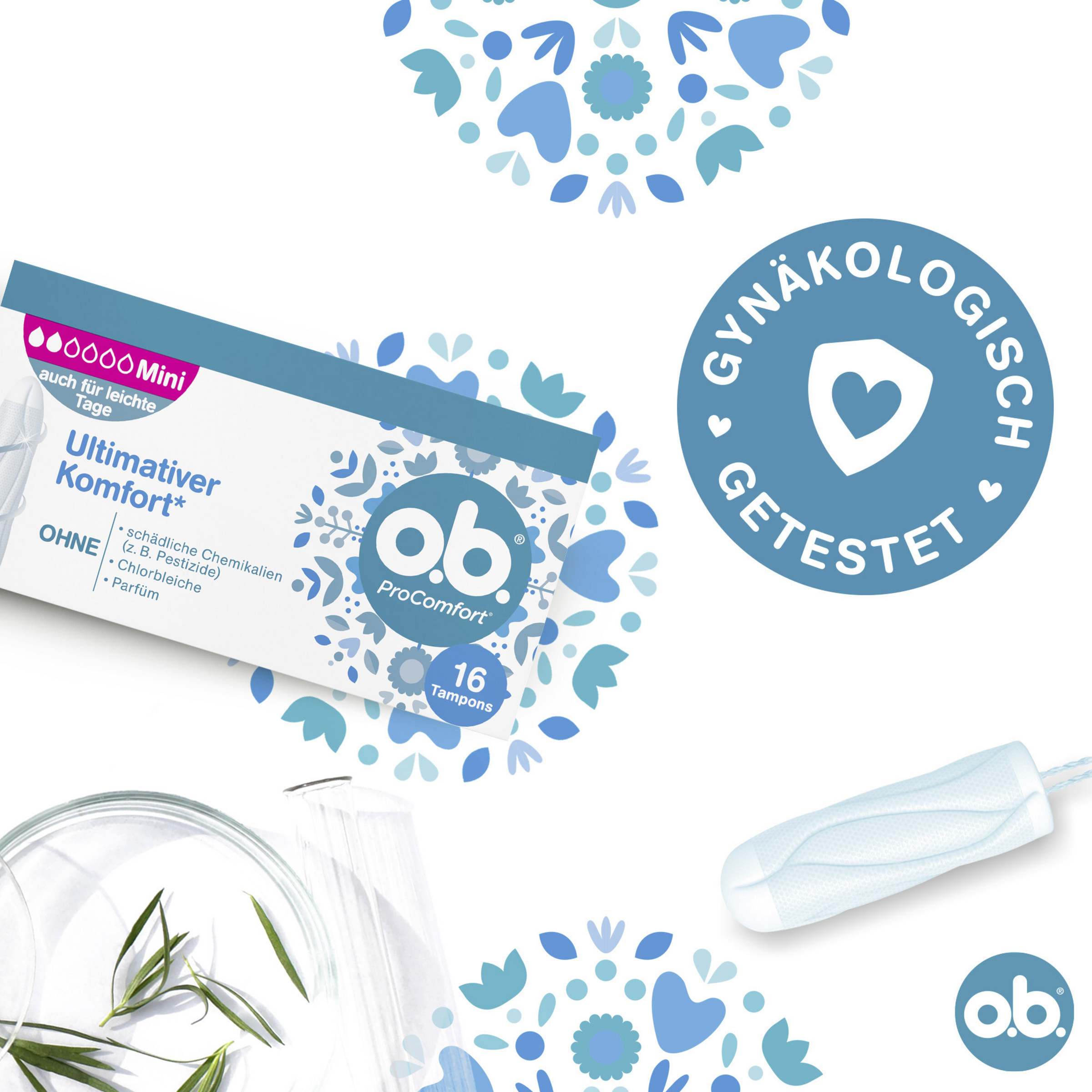 - die o.b. ProComfort Tampons enthalten einen 100% pflanzlich basierten Tamponkern und sind frei von schädlichen Chemikalien (z.B. Pestizide), Chlorbleiche und Parfüm. Außerdem sind sie gynäkologisch getestet