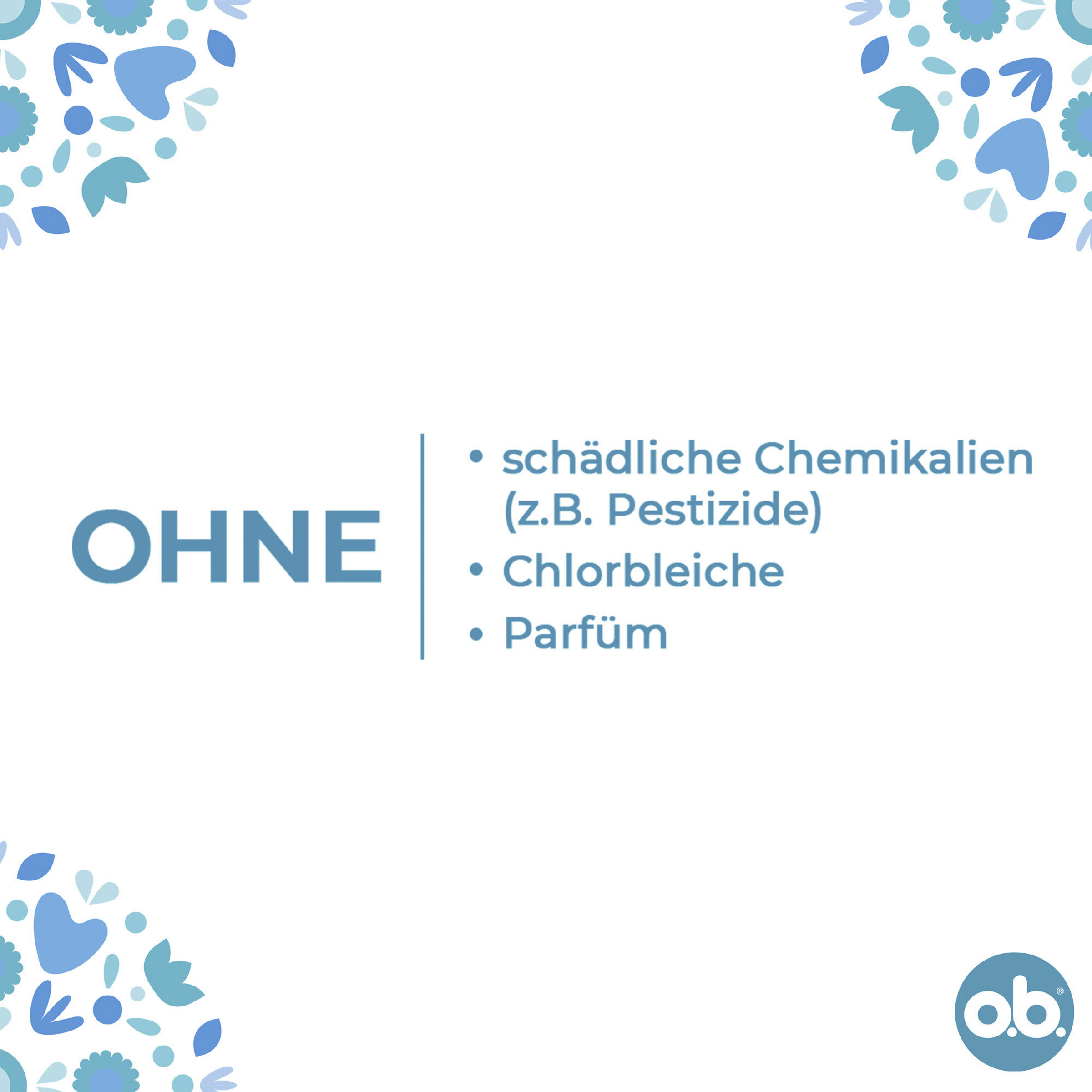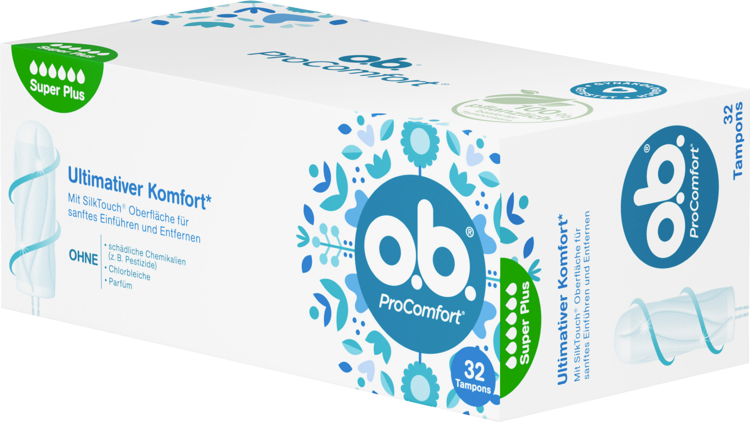 - die o.b. Original Super Plus Tampons enthalten einen 100% pflanzlich basierten Tamponkern und sind frei von schädlichen Chemikalien (z.B. Pestizide), Chlorbleiche und Parfüm. Außerdem sind sie gynäkologisch getestet
