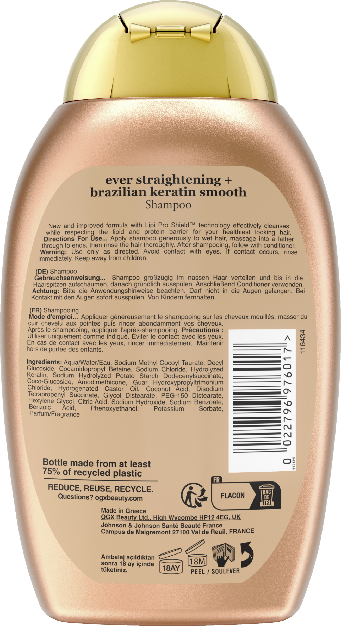 Das OGX Brazilian Keratin Smooth Shampoo mit der exotischen Rezeptur und zahlreichen Super Foods sorgt für kräftigeres, geschmeidigeres Haar und glättet die Haarstruktur. Brasilianisches Kokosnussöl, Keratin Proteine, Kokosnussbutter und Avocadoöl verleihen länger anhaltende Glätte und Geschmeidigkeit sowie einen brillanten, strahlenden Glanz. Das pflegende Keratin Shampoo ist besonders für krauses, lockiges oder welliges Haar geeignet und reinigt, pflegt & stärkt das Haar zugleich.