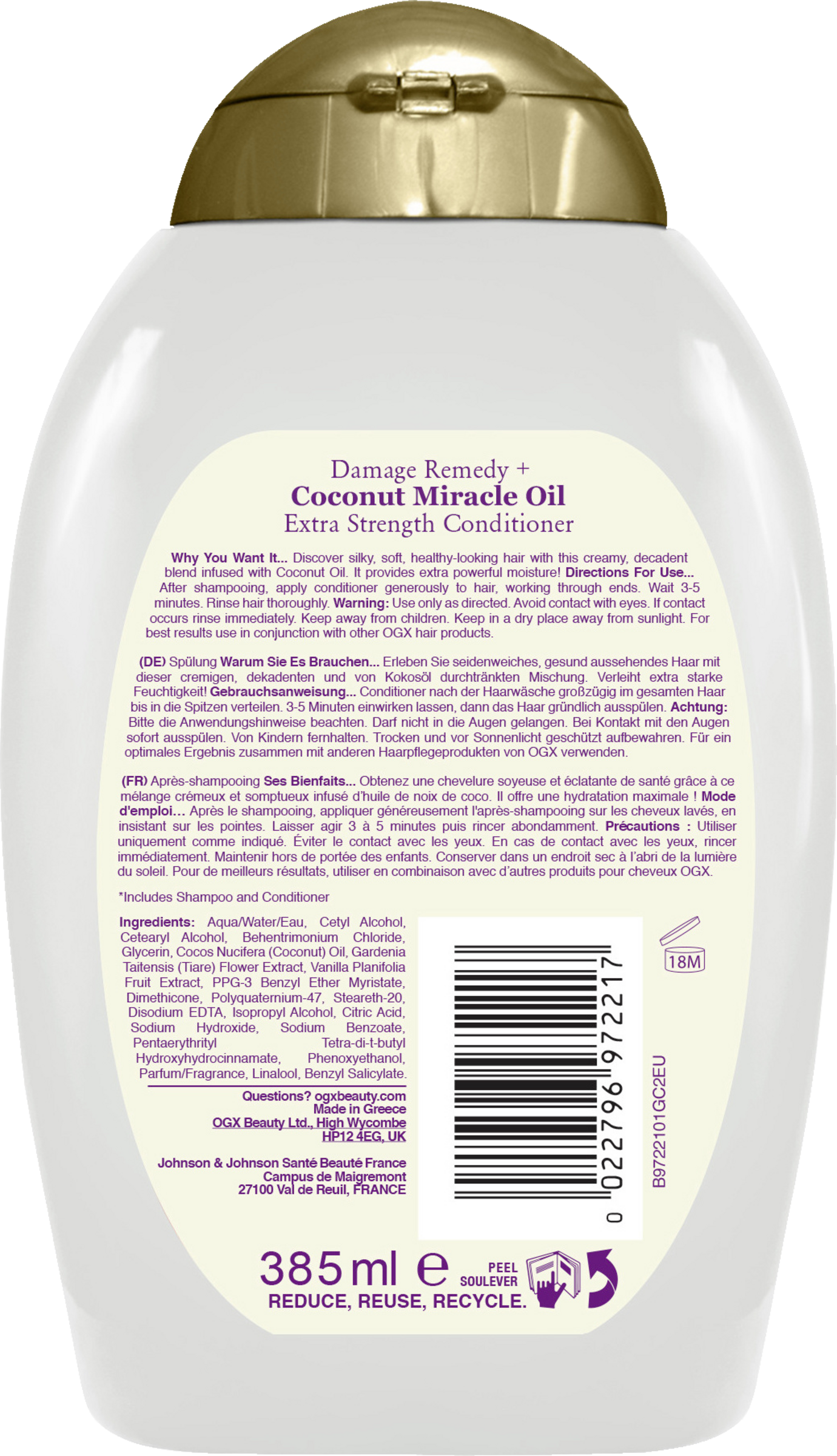 Conditioner nach der Haarwäsche großzügig im gesamten Haar bis in die Spitzen verteilen. 3 bis 5 Minuten einwirken lassen, dann das Haar gründlich ausspülen. Für ein optimales Ergebnis zusammen mit anderen Haarpflegeprodukten von OGX verwenden.