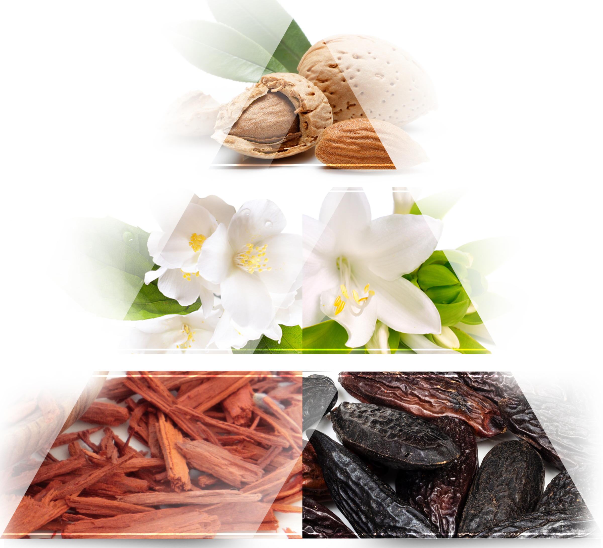 - Basisnote: Tonkabohne, Kakao, Sandelholz, Vanille, Praline, Zimt, Zedernholz, Kaschmirholz, Patchouli, Amber, Moschus