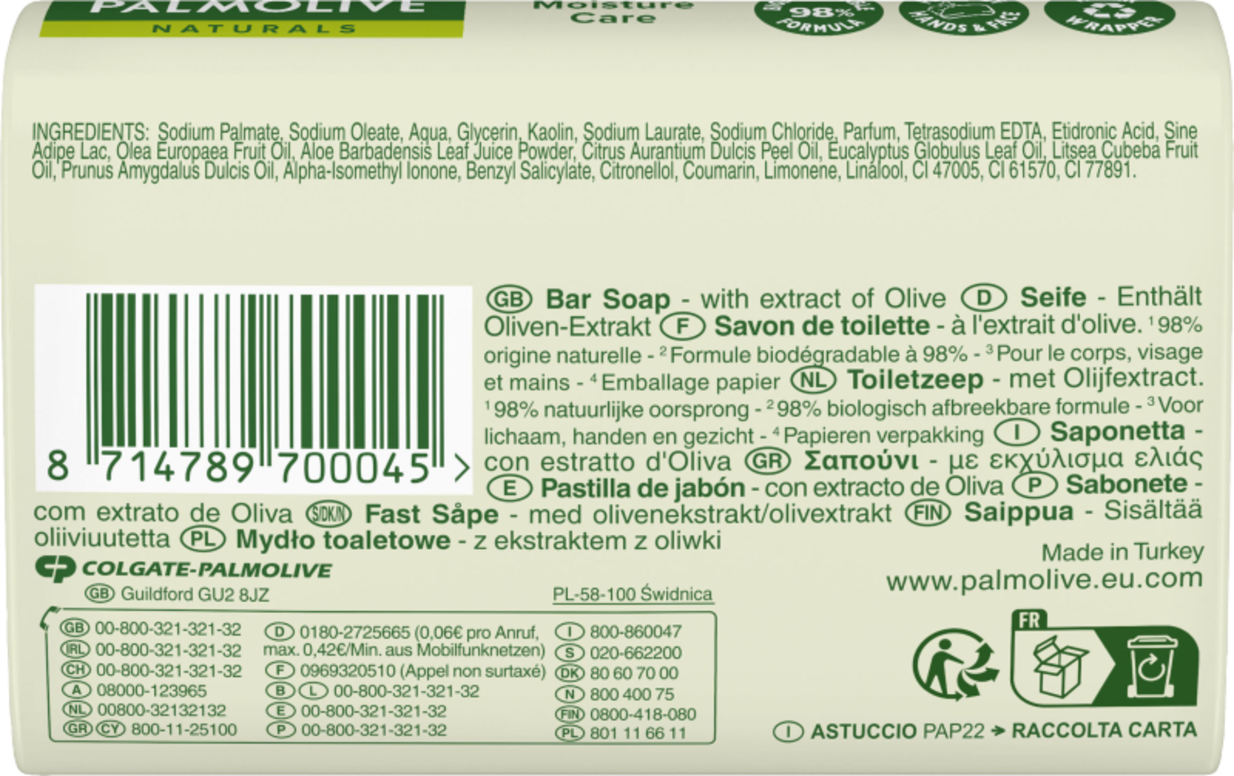 Palmolive Naturals Seife Moisture Care Olive reinigt sanft Ihre Hände, pflegt sie mit Olivenextrakt und sorgt für spürbar zarte und gepflegte Hände.