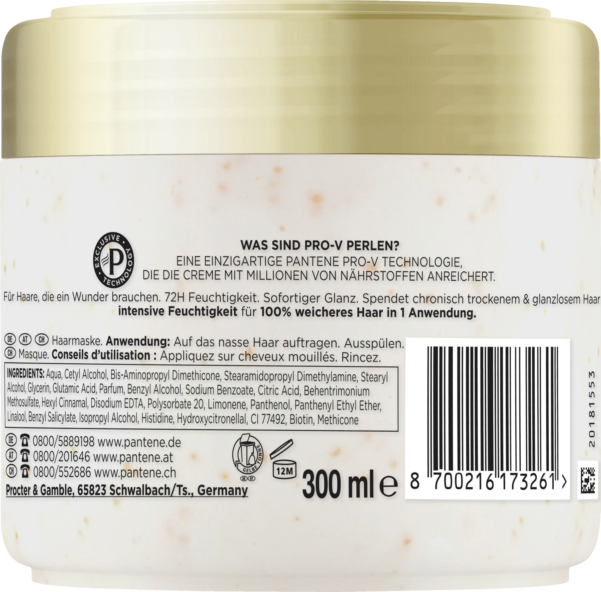- HERGESTELLT MIT +5000 PRO-V-NUTRI-PERLEN: Die hochkonzentrierte Pro-V-Formel mit Biotin nutzt eine einzigartige Pantene Pro-V-Technologie, die Millionen von Nährstoffen in der Creme freisetzt
