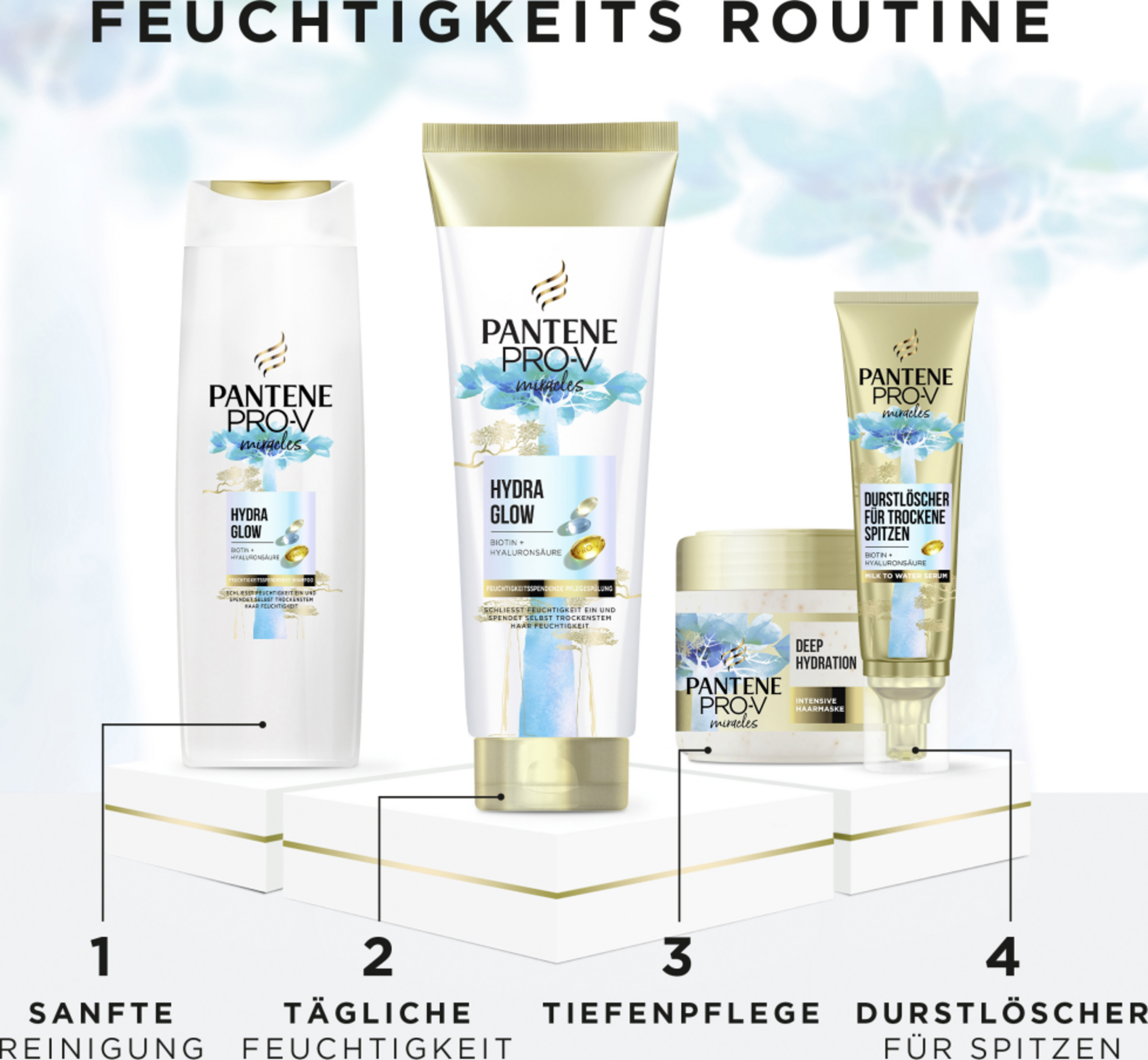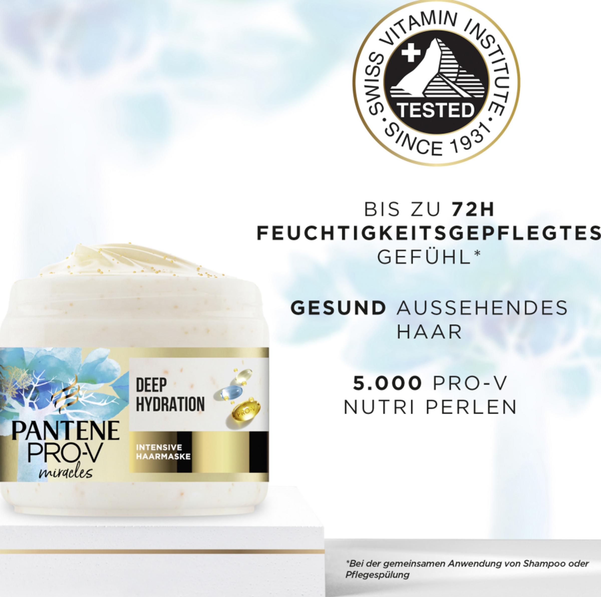 Entdecke die Intensiv Haarmaske von Pantene Pro-V mit Biotin für trockenes, geschädigtes Haar. Unser Wundermittel sorgt dafür, dass sich das Haar belebt und frisch anfühlt, 100% weicher und geschmeidiger. Unsere Haarmaske ist mit Biotin und 5.000 Pro-V Nutri-Perlen angereichert, der einzigartigen Pantene Pro-V-Technologie, die Millionen von Nährstoffen auf einmal freisetzt. Diese Behandlung lässt keine Haarsträhne unberührt, stillt den Durst deines Haars, besänftigt die Kopfhaut und verleiht einen gesunden Glanz. Spürbar weiches Haar in nur 2 Minuten, das bis zu 72 Stunden anhält. Für beste Ergebnisse, zusammen mit den anderen Haarprodukten der Miracles Hydra Glow-Serie verwenden: Shampoo, Pflegespülung, Milk to Water Serum & intensive Haarmaske - für die tägliche Anwendung geeignet.