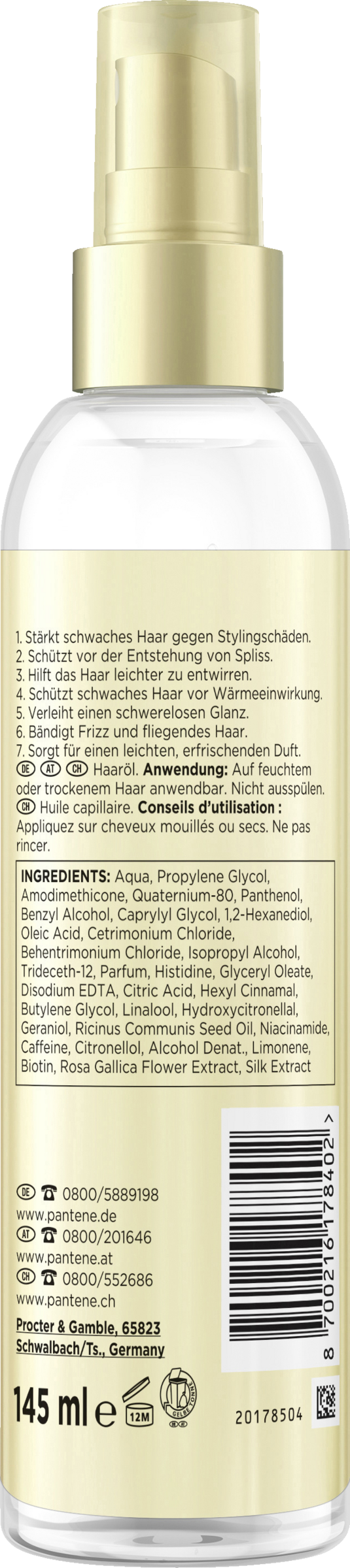 Aqua, Propylene Glycol, Amodimethicone, Quaternium-80, Panthenol, Benzyl Alcohol, Caprylyl Glycol, 1,2-Hexanediol, Oleic Acid, Cetrimonium Chloride, Behentrimonium Chloride, Isopropyl Alcohol, Trideceth-12, Parfum, Histidine, Glyceryl Oleate, Disodium EDTA, Citric Acid, Hexyl Cinnamal, Butylene Glycol, Linalool, Hydroxycitronellal, Geraniol, Ricinus Communis Seed Oil, Niacinamide, Caffeine, Citronellol, Alcohol Denat., Limonene, Biotin, Rosa Gallica Flower Extract, Silk Extract