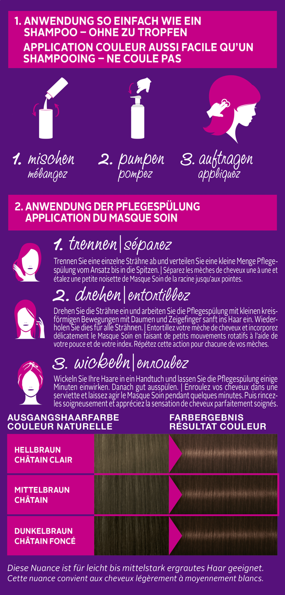 Einfach wie ein Shampoo. Kennen Sie das Geheimnis einer perfekten Coloration? Verwenden Sie Perfect Mousse Shade 465 Schokobraun. Mit seinem sanften Schaum macht Perfect Mousse das Colorieren zu Hause erstaunlich einfach.