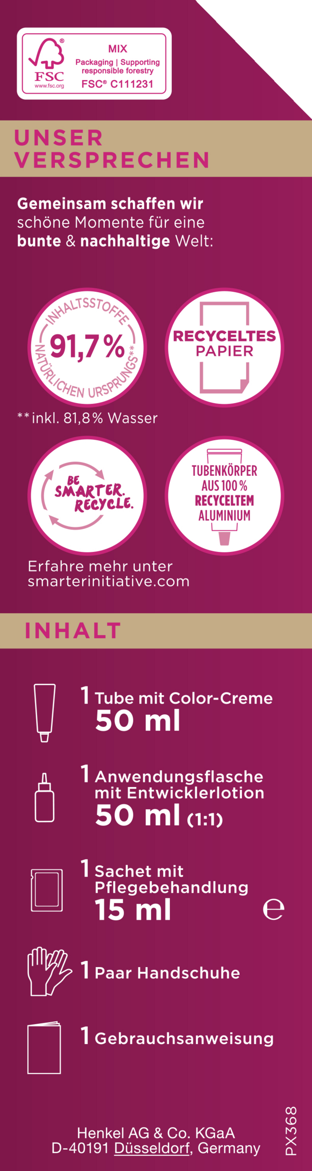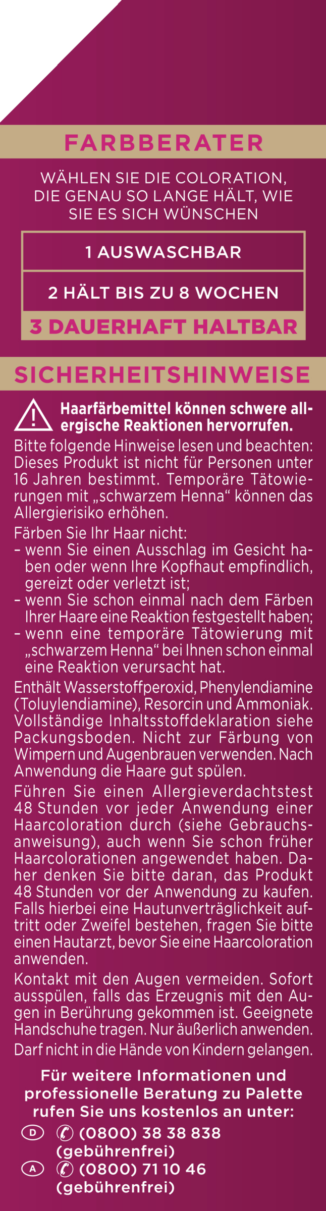 Haarfärbemittel können schwere allergische Reaktionen hervorrufen. Bitte folgende Hinweise lesen und beachten: Dieses Produkt ist nicht für Personen unter 16 Jahren bestimmt. Temporäre Tätowierungen mit „schwarzem Henna“ können das Allergierisiko erhöhen. Färben Sie Ihr Haar nicht: – wenn Sie einen Ausschlag im Gesicht haben oder wenn Ihre Kopfhaut empfindlich, gereizt oder verletzt ist; – wenn Sie schon einmal nach dem Färben Ihrer Haare eine Reaktion festgestellt haben; – wenn eine temporäre Tätowierung mit „schwarzem Henna“ bei Ihnen schon einmal eine Reaktion verursacht hat. Enthält Wasserstoffperoxid, Phenylendiamine (Toluylendiamine), Resorcin und Ammoniak. Vollständige Inhaltsstoffdeklaration siehe Packungsboden. Nicht zur Färbung von Wimpern und Augenbrauen verwenden. Nach Anwendung die Haare gut spülen. Führen Sie einen Allergieverdachtstest 48 Stunden vor jeder Anwendung einer Haarcoloration durch (siehe Gebrauchsanweisung), auch wenn Sie schon früher Haarcolorationen angewendet haben. Daher denken Sie bitte daran, das Produkt 48 Stunden vor der Anwendung zu kaufen. Falls hierbei eine Hautunverträglichkeit auftritt oder Zweifel bestehen, fragen Sie bitte einen Hautarzt, bevor Sie eine Haarcoloration anwenden. Kontakt mit den Augen vermeiden. Sofort ausspülen, falls das Erzeugnis mit den Augen in Berührung gekommen ist. Geeignete Handschuhe tragen. Nur äußerlich anwenden.