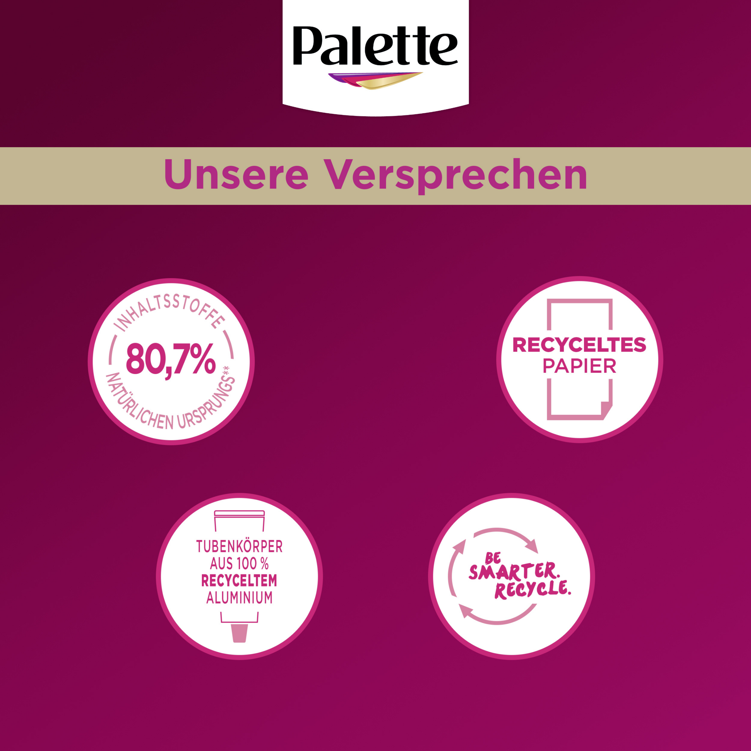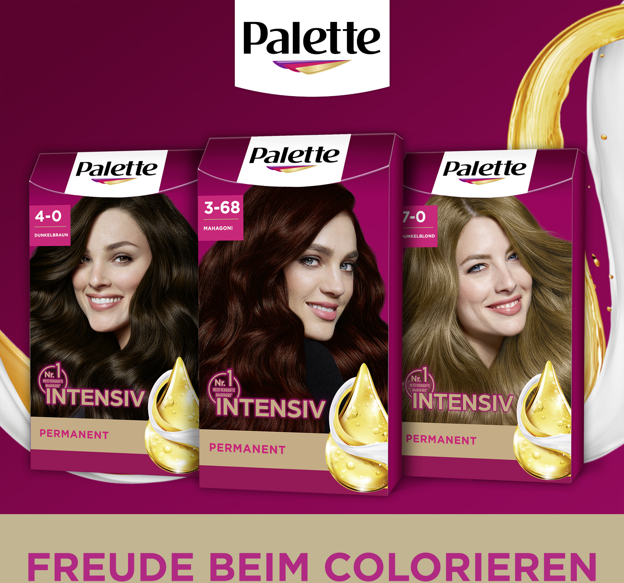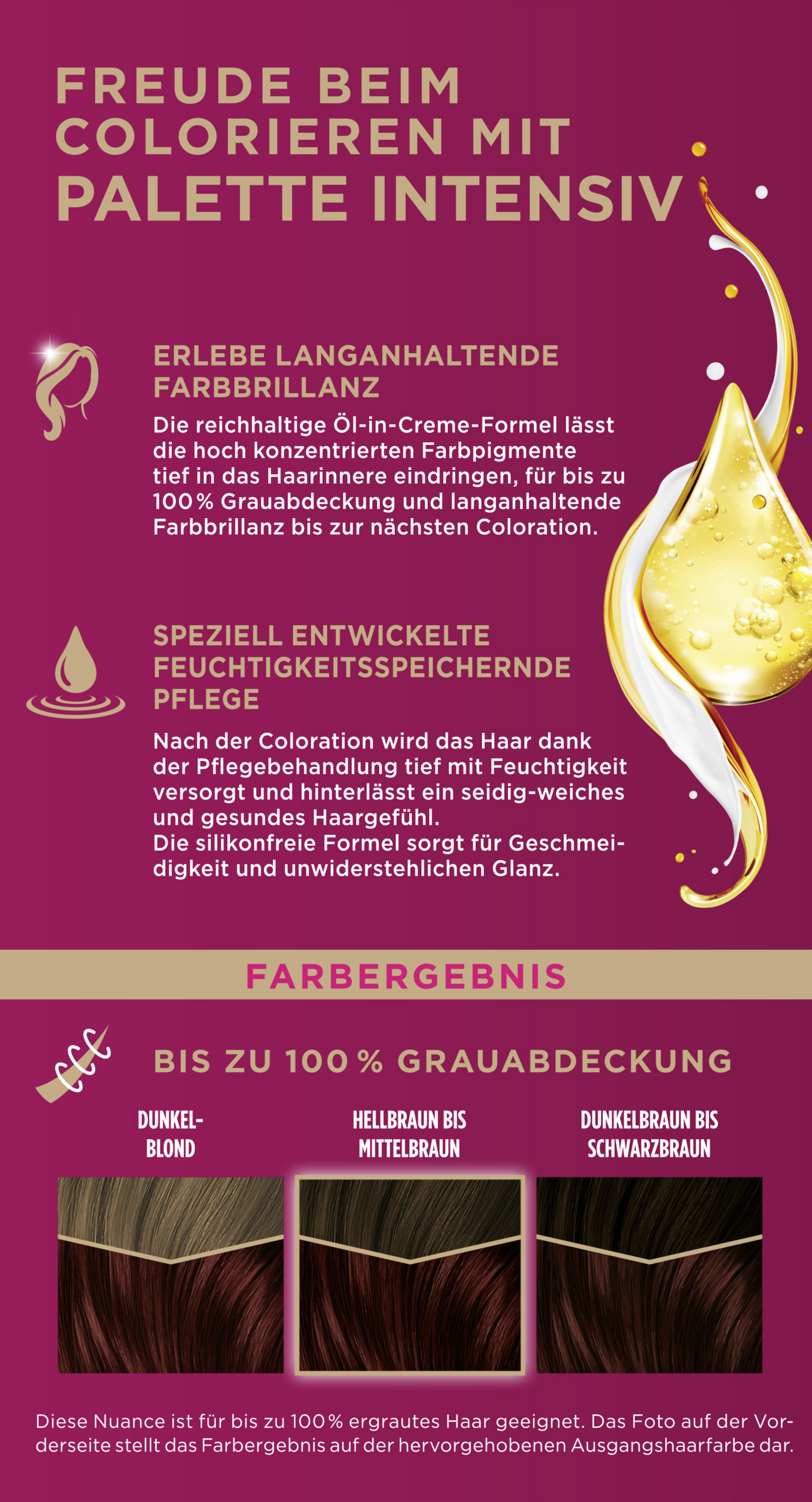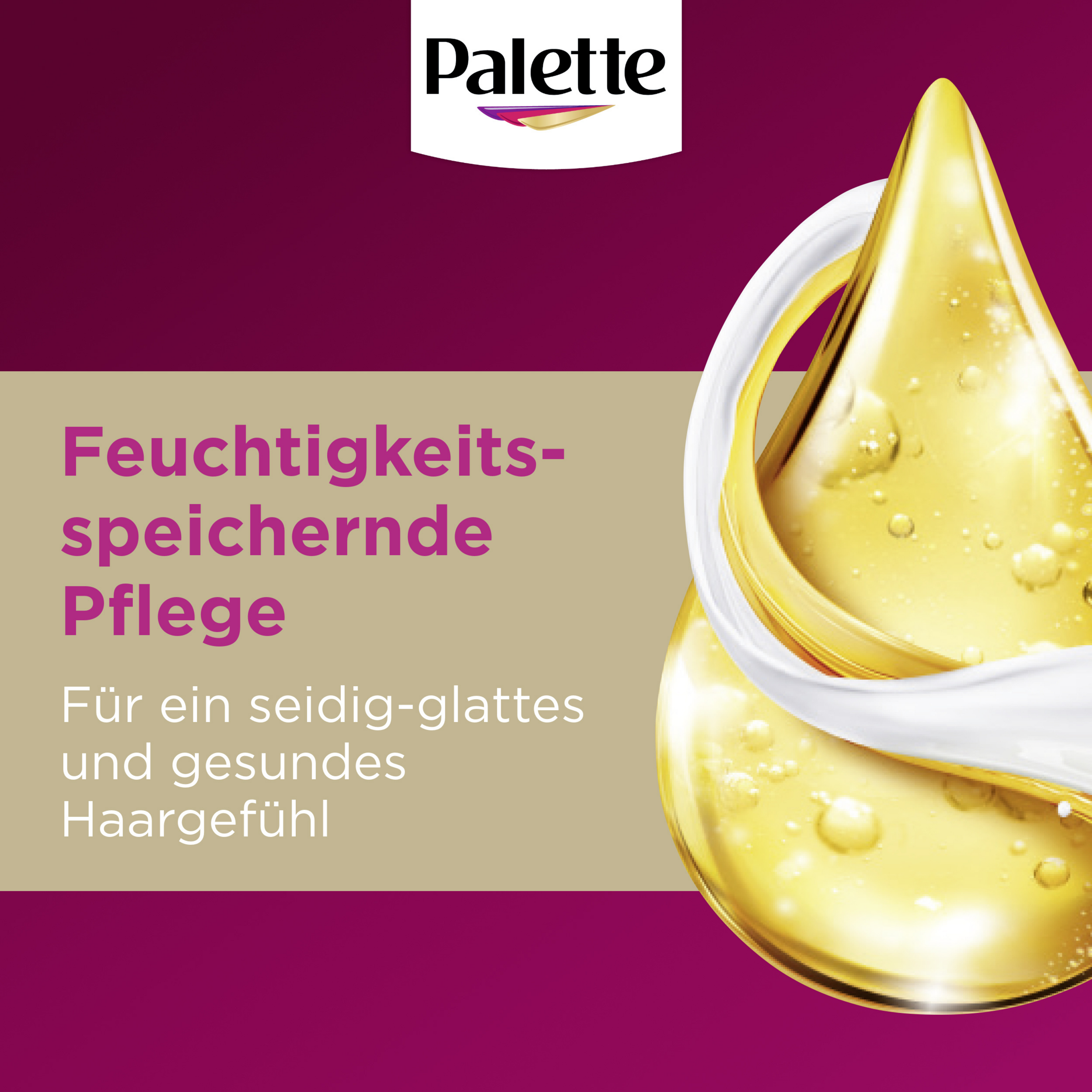 Color-Creme für leuchtende und langanhaltende Farbergebnisse Die Palette Intensiv Creme Coloration sorgt für leuchtende, langanhaltende Farbergebnisse, intensiven Farbglanz sowie perfekte Grauabdeckung. Die Color-Creme mit reichhaltiger Öl-in-Creme-Formel lässt die hoch konzentrierten Farbpigmente tief in das Haarinnere eindringen, für 100 % Grauabdeckung und eine langanhaltende Farbbrillanz bis zur nächsten Coloration. Zusätzlich ist die speziell entwickelte, feuchtigkeitsspendende Pflege der Haarfarbe silikonfrei und sorgt für Geschmeidigkeit und unwiderstehlichen Glanz. Das Haar wird dank der Pflegebehandlung tief mit Feuchtigkeit versorgt und hinterlässt ein seidig-weiches und gesundes Haargefühl.