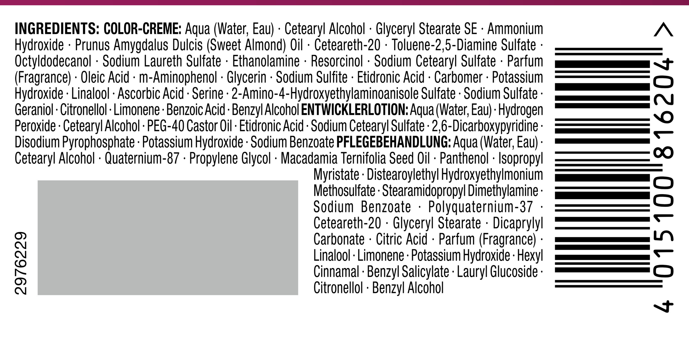 Color-Creme: Aqua (Water, Eau), Cetearyl Alcohol, Glyceryl Stearate SE, Ammonium Hydroxide, Prunus Amygdalus Dulcis (Sweet Almond) Oil, Ceteareth-20, Toluene-2,5-Diamine Sulfate, Octyldodecanol, Sodium Laureth Sulfate, Ethanolamine, Resorcinol, Sodium Cetearyl Sulfate, Parfum (Fragrance), Oleic Acid, m-Aminophenol, Glycerin, Sodium Sulfite, Etidronic Acid, Carbomer, Potassium Hydroxide, Linalool, Ascorbic Acid, Serine, 2-Amino-4-Hydroxyethylaminoanisole Sulfate, Sodium Sulfate, Geraniol, Citronellol, Limonene, Benzoic Acid, Benzyl Alcohol|