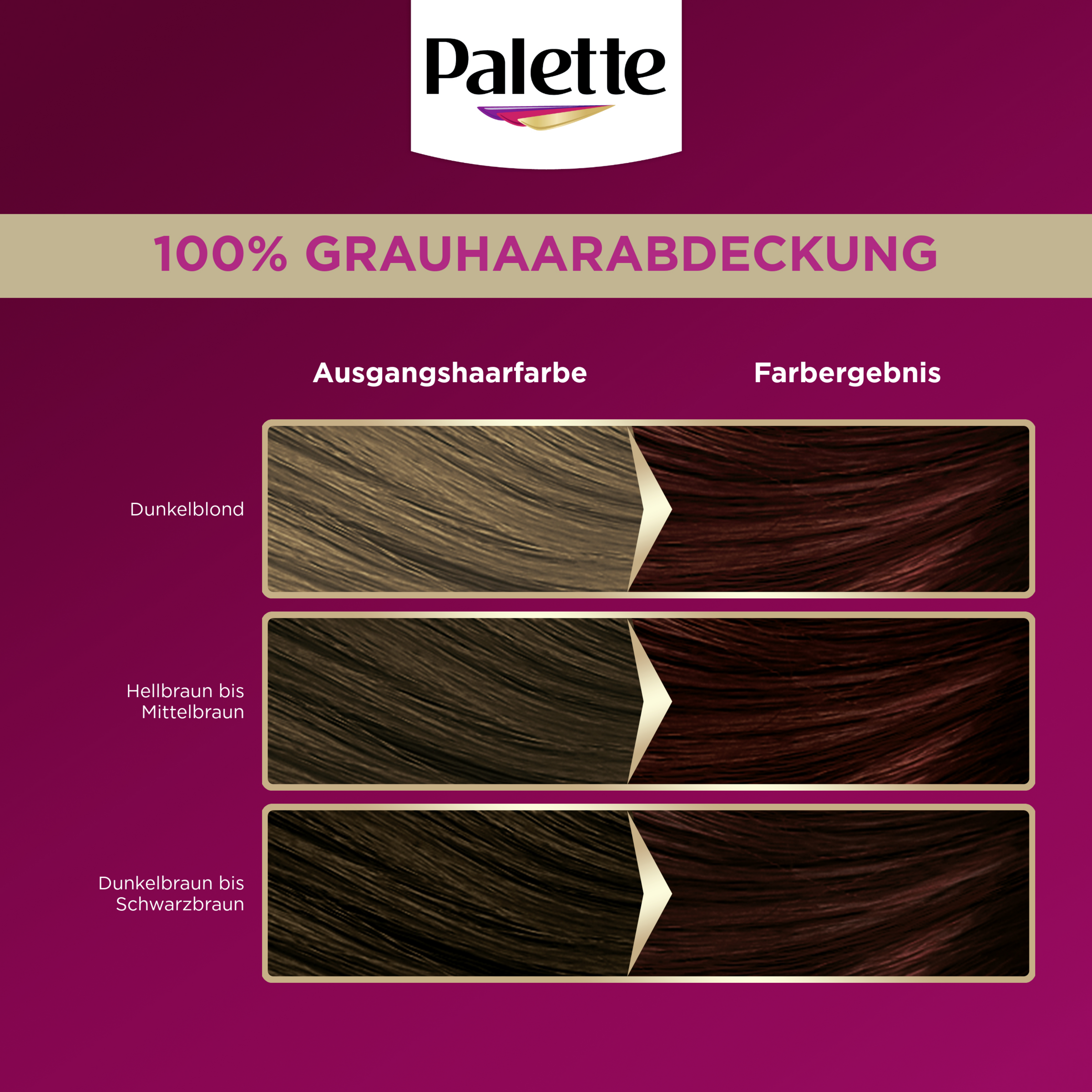 Color-Creme für leuchtende und langanhaltende Farbergebnisse. Die Palette Intensiv Creme Coloration sorgt für leuchtende, langanhaltende Farbergebnisse, intensiven Farbglanz sowie perfekte Grauabdeckung. Die Color-Creme mit reichhaltiger Öl-in-Creme-Formel lässt die hoch konzentrierten Farbpigmente tief in das Haarinnere eindringen, für 100 % Grauabdeckung und eine langanhaltende Farbbrillanz bis zur nächsten Coloration. Zusätzlich ist die speziell entwickelte, feuchtigkeitsspendende Pflege der Haarfarbe silikonfrei und sorgt für Geschmeidigkeit und unwiderstehlichen Glanz. Das Haar wird dank der Pflegebehandlung tief mit Feuchtigkeit versorgt und hinterlässt ein seidig-weiches und gesundes Haargefühl.