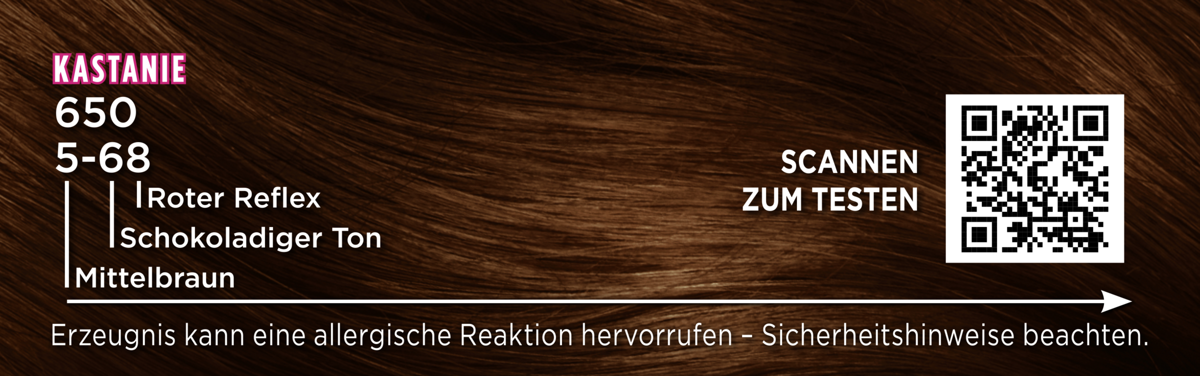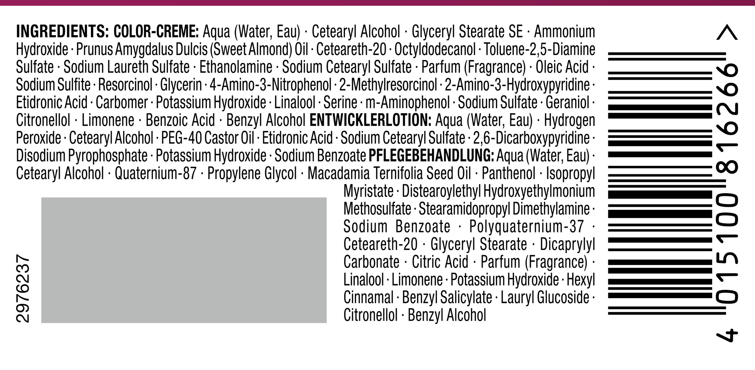 Haarfärbemittel können schwere allergische Reaktionen hervorrufen. Bitte folgende Hinweise lesen und beachten: Dieses Produkt ist nicht für Personen unter 16 Jahren bestimmt. Temporäre Tätowierungen mit „schwarzem Henna“ können das Allergierisiko erhöhen. Färben Sie Ihr Haar nicht: – wenn Sie einen Ausschlag im Gesicht haben oder wenn Ihre Kopfhaut empfindlich, gereizt oder verletzt ist, – wenn Sie schon einmal nach dem Färben Ihrer Haare eine Reaktion festgestellt haben, – wenn eine temporäre Tätowierung mit „schwarzem Henna“ bei Ihnen schon einmal eine Reaktion verursacht hat. Enthält Wasserstoffperoxid, Phenylendiamine (Toluylendiamine) und Resorcin. Vollständige Inhaltsstoffdeklaration siehe Packungsboden. Nicht zur Färbung von Wimpern und Augenbrauen verwenden. Nach Anwendung die Haare gut spülen. Führen Sie einen Allergieverdachtstest 48 Stunden vor jeder Anwendung einer Haarcoloration durch (siehe Gebrauchsanweisung), auch wenn Sie schon früher Haarcolorationen angewendet haben. Daher denken Sie bitte daran, das Produkt 48 Stunden vor der Anwendung zu kaufen. Falls hierbei eine Hautunverträglichkeit auftritt oder Zweifel bestehen, fragen Sie bitte einen Hautarzt, bevor Sie eine Haarcoloration anwenden. Kontakt mit den Augen vermeiden. Sofort ausspülen, falls das Erzeugnis mit den Augen in Berührung gekommen ist. Geeignete Handschuhe tragen. Nur äußerlich anwenden.