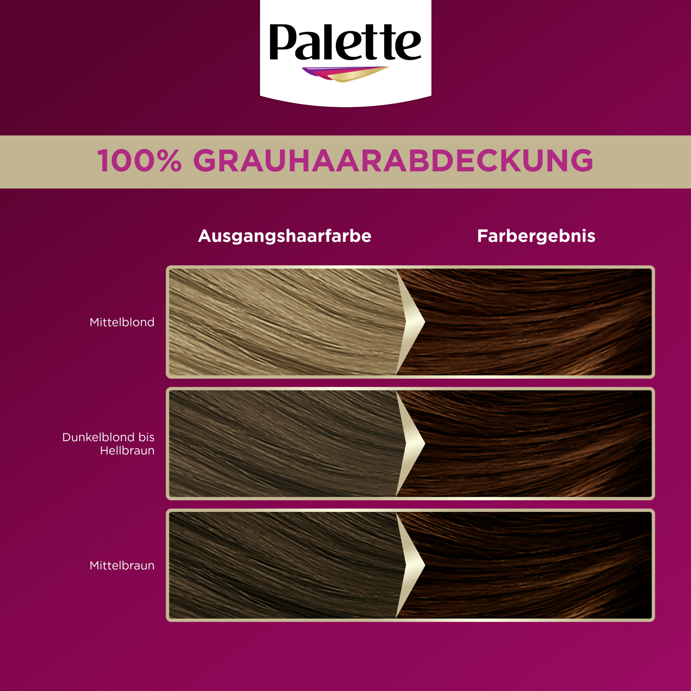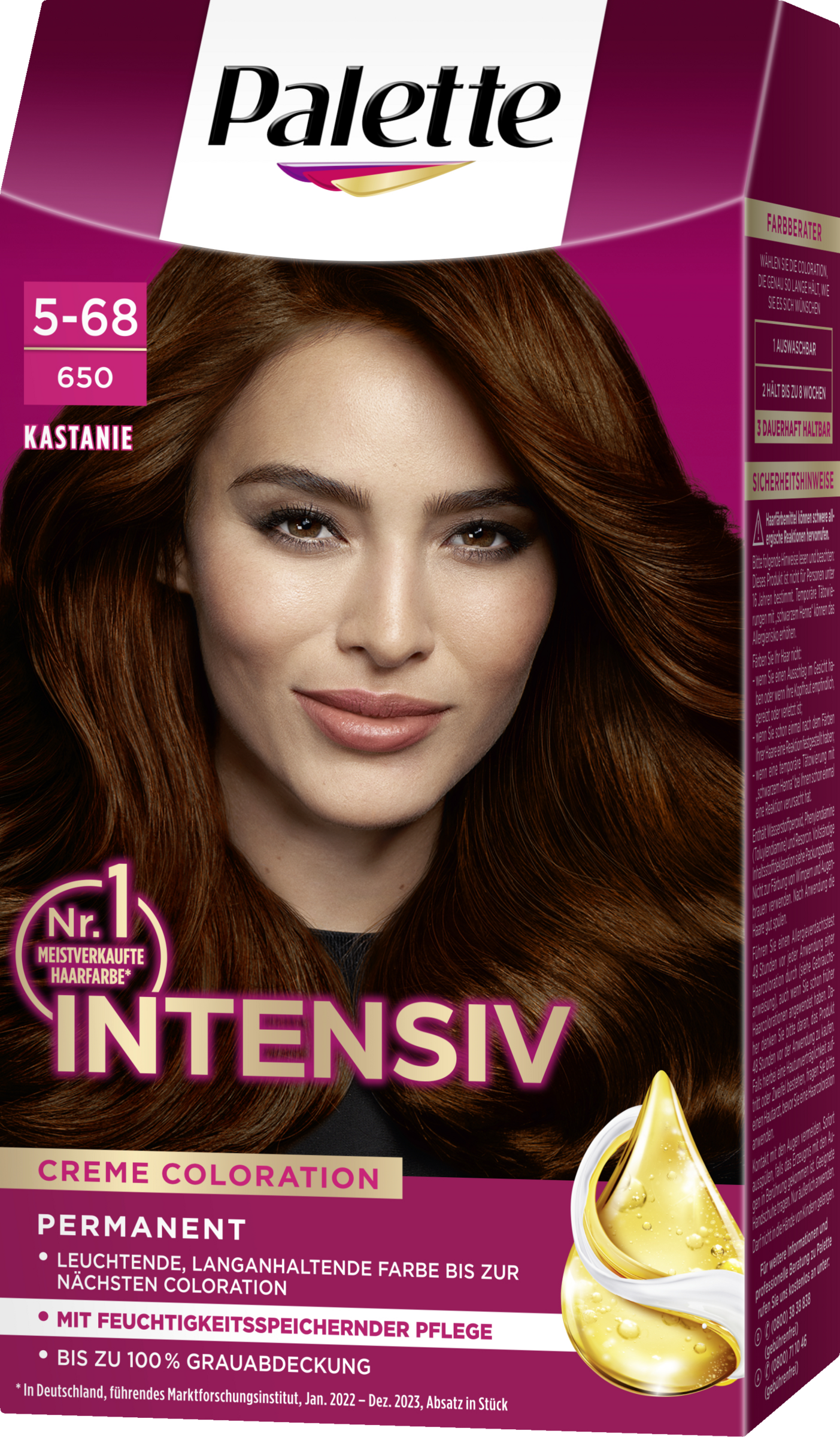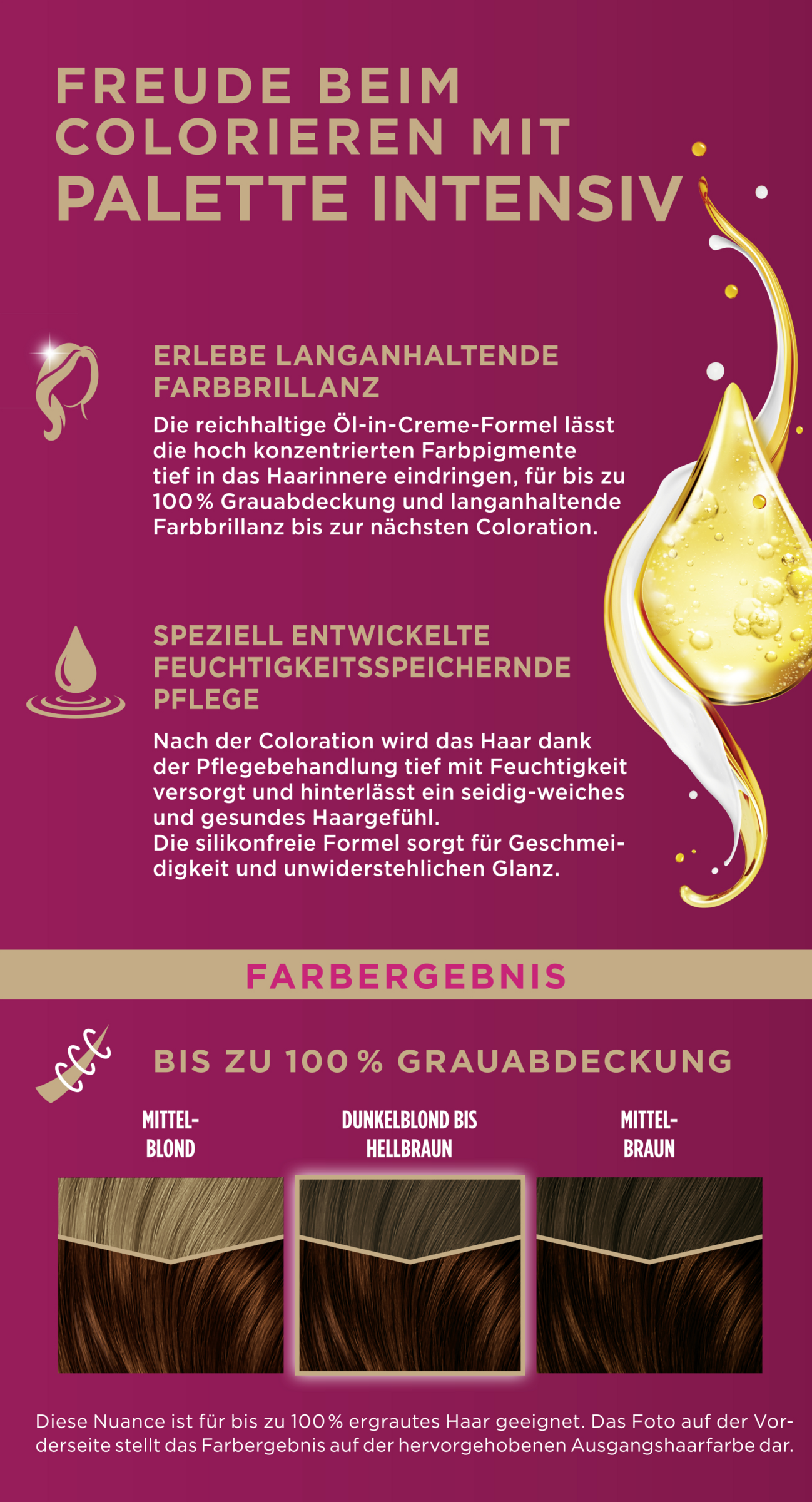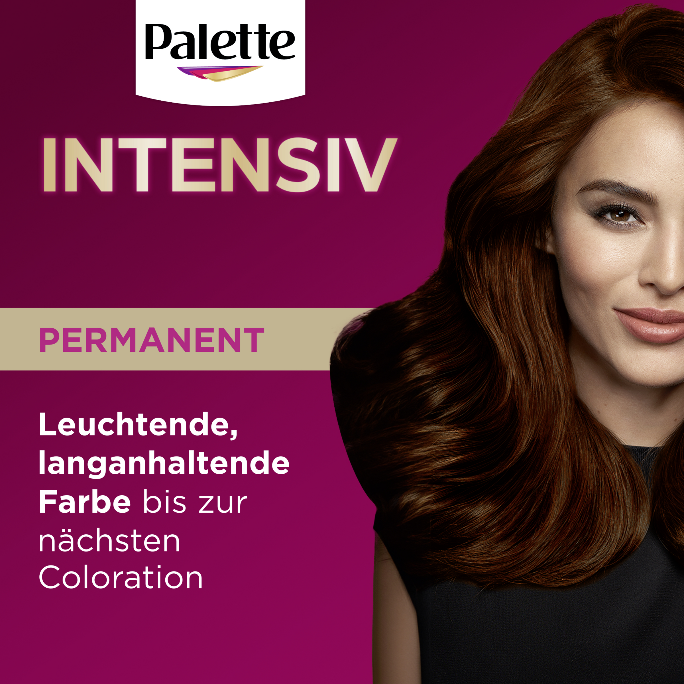 Color-Creme für leuchtende und langanhaltende Farbergebnisse. Die Palette Intensiv Creme Coloration sorgt für leuchtende, langanhaltende Farbergebnisse, intensiven Farbglanz sowie perfekte Grauabdeckung. Die Color-Creme mit reichhaltiger Öl-in-Creme-Formel lässt die hoch konzentrierten Farbpigmente tief in das Haarinnere eindringen, für 100 % Grauabdeckung und eine langanhaltende Farbbrillanz bis zur nächsten Coloration. Zusätzlich ist die speziell entwickelte, feuchtigkeitsspendende Pflege der Haarfarbe silikonfrei und sorgt für Geschmeidigkeit und unwiderstehlichen Glanz. Das Haar wird dank der Pflegebehandlung tief mit Feuchtigkeit versorgt und hinterlässt ein seidig-weiches und gesundes Haargefühl.