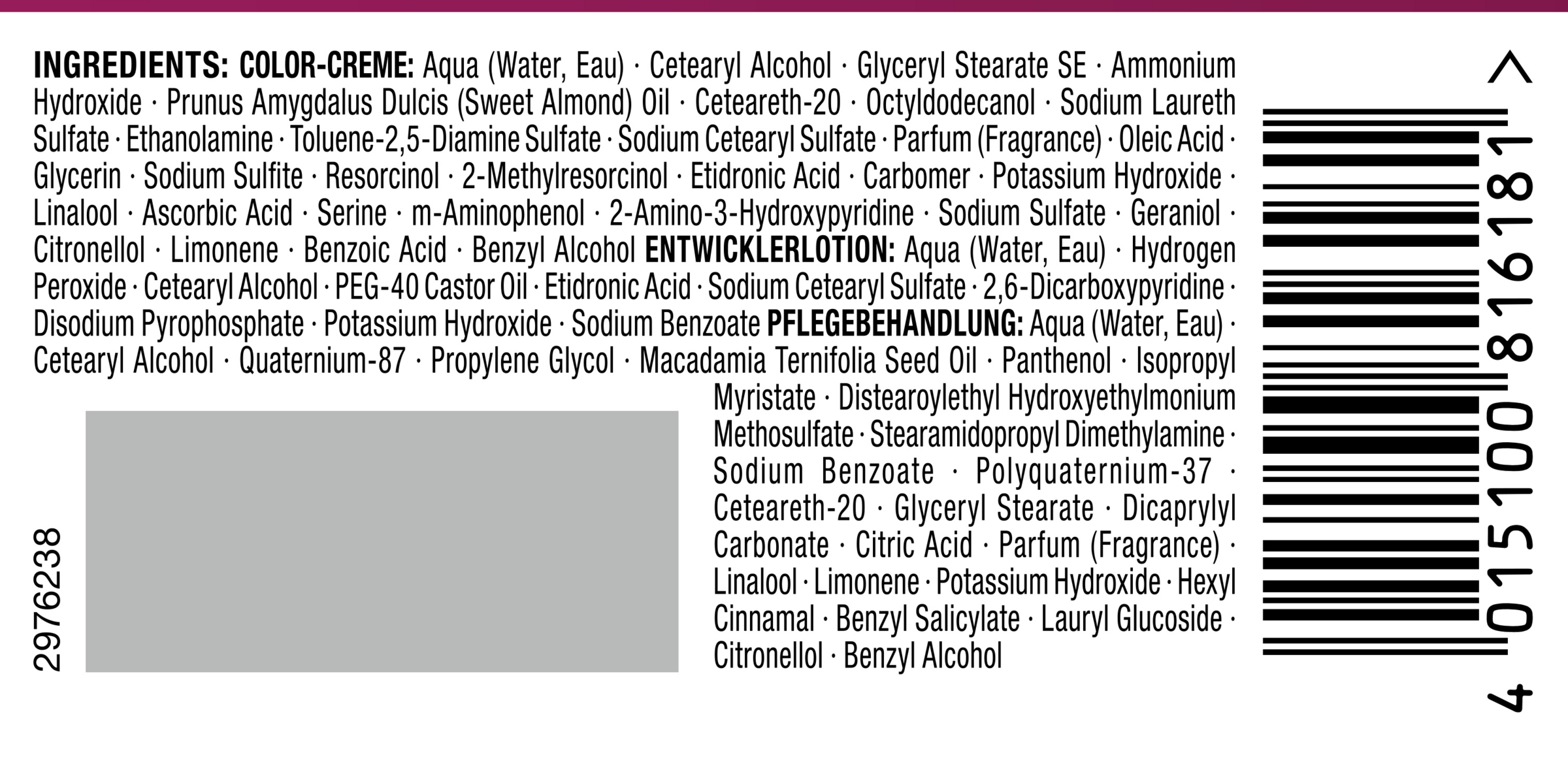 Color-Creme: Aqua (Water, Eau), Cetearyl Alcohol, Glyceryl Stearate SE, Ammonium Hydroxide, Prunus Amygdalus Dulcis (Sweet Almond) Oil, Ceteareth-20, Octyldodecanol, Sodium Laureth Sulfate, Ethanolamine, Toluene-2,5-Diamine Sulfate, Sodium Cetearyl Sulfate, Parfum (Fragrance), Oleic Acid, Glycerin, Sodium Sulfite, Resorcinol, 2-Methylresorcinol, Etidronic Acid, Carbomer, Potassium Hydroxide, Linalool, Ascorbic Acid, Serine, m-Aminophenol, 2-Amino-3-Hydroxypyridine, Sodium Sulfate, Geraniol, Citronellol, Limonene, Benzoic Acid, Benzyl Alcohol|