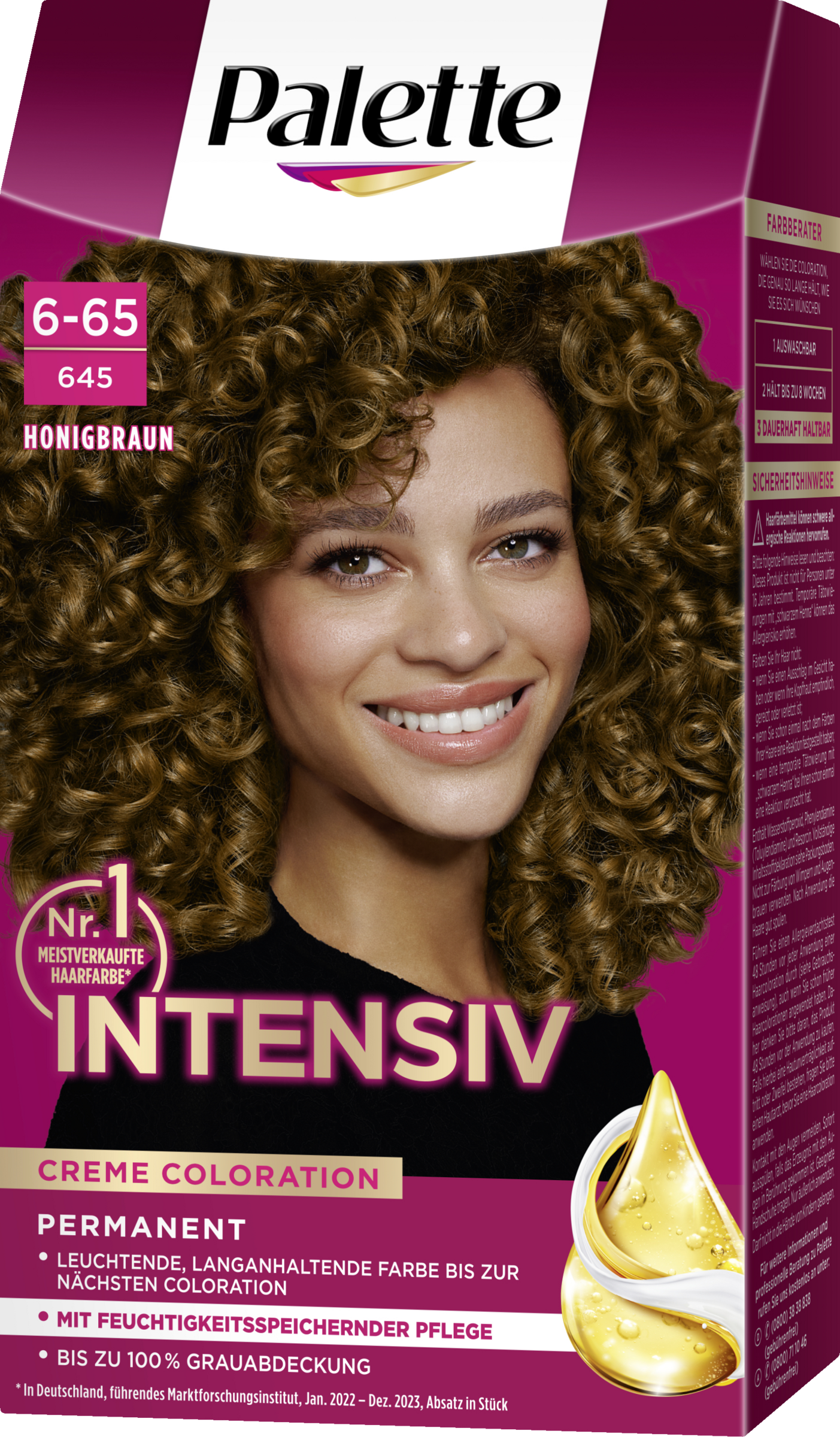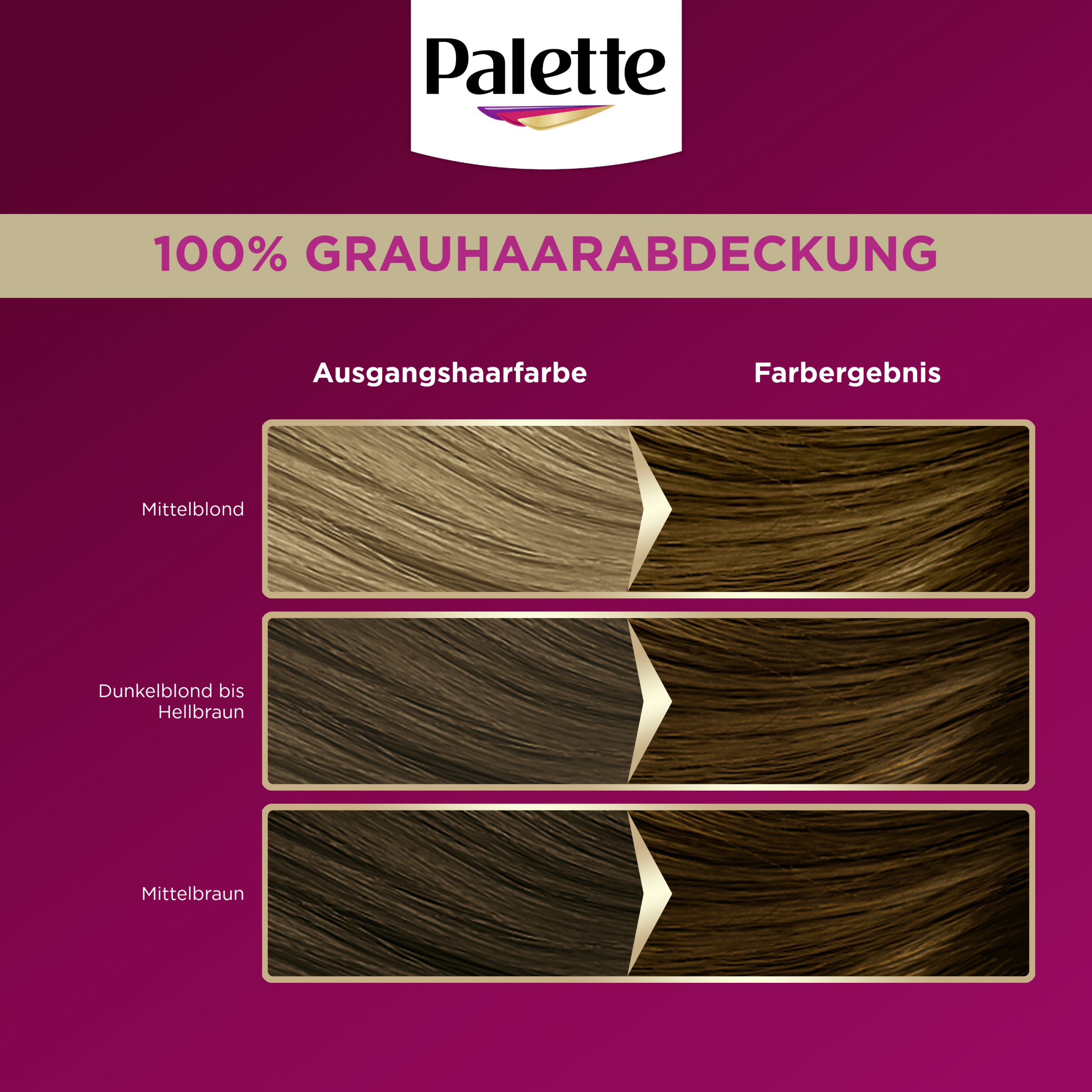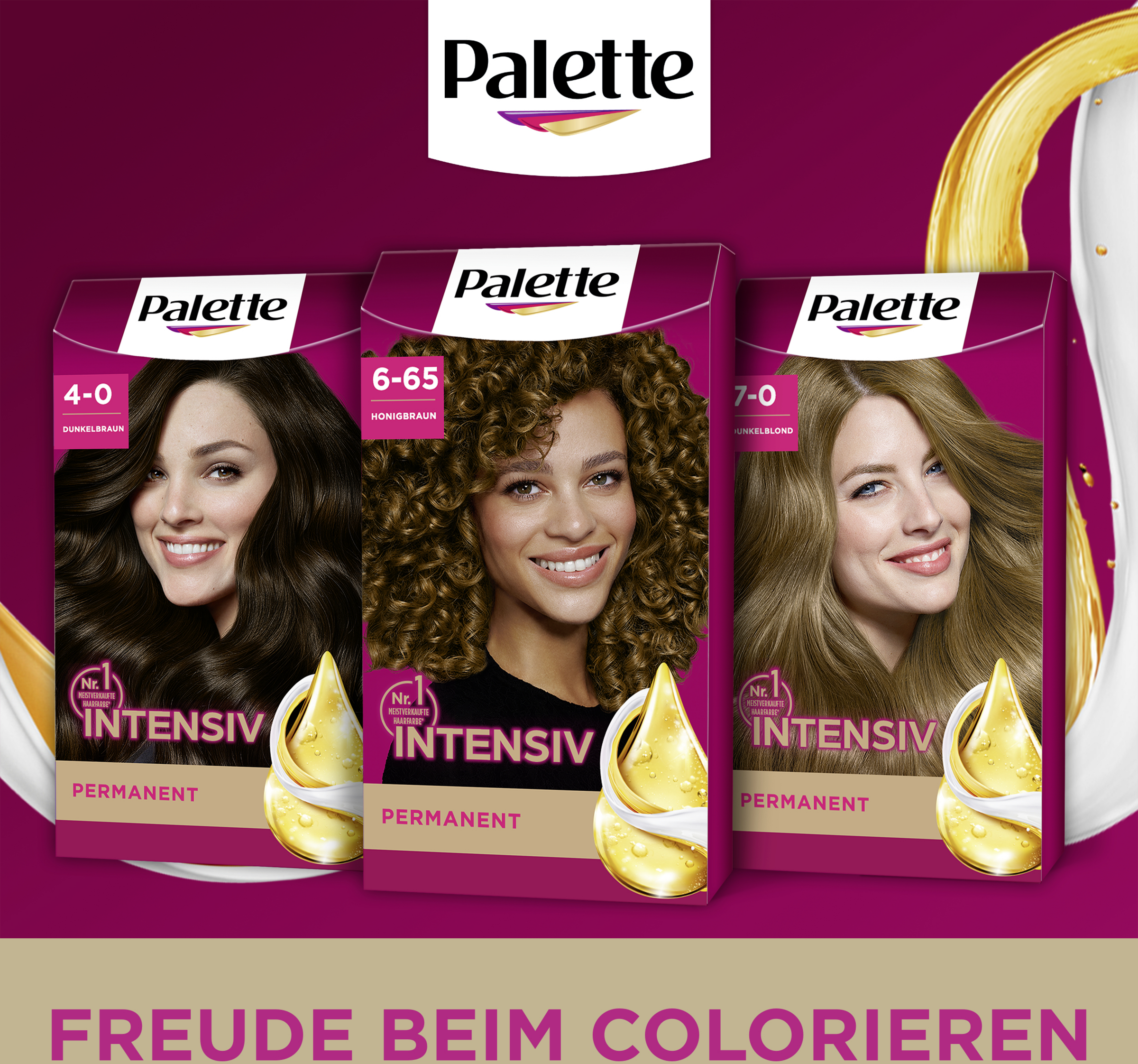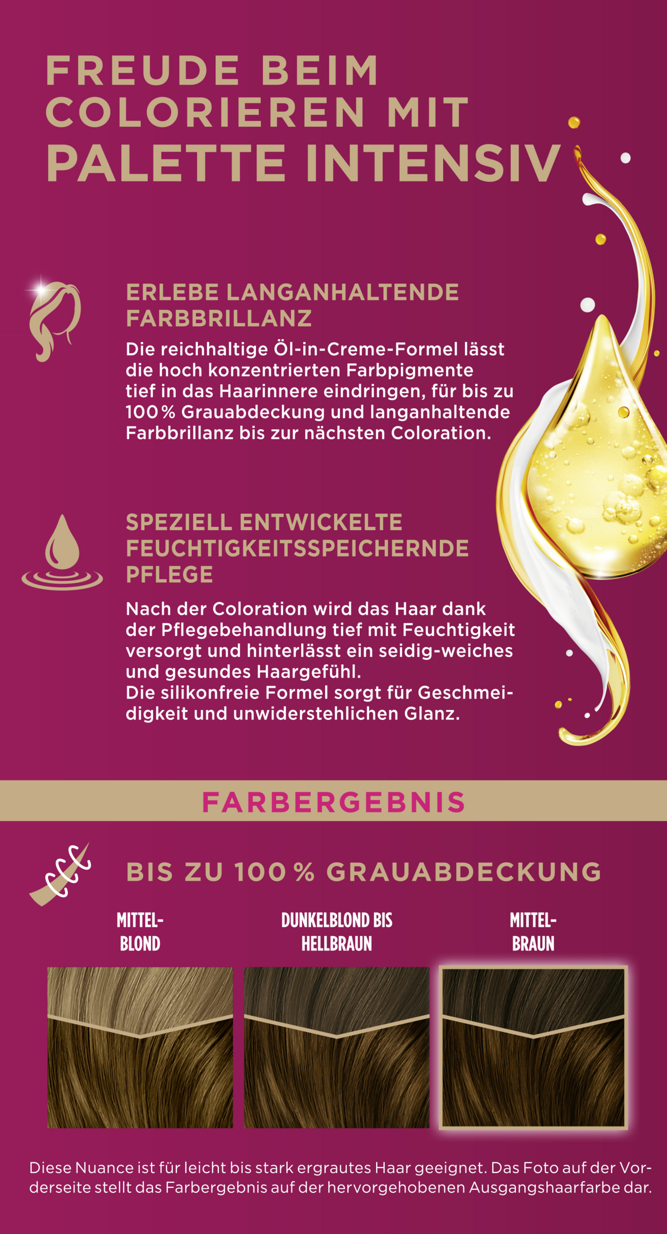 Color-Creme für leuchtende und langanhaltende Farbergebnisse. Die Palette Intensiv Creme Coloration sorgt für leuchtende, langanhaltende Farbergebnisse, intensiven Farbglanz sowie perfekte Grauabdeckung. Die Color-Creme mit reichhaltiger Öl-in-Creme-Formel lässt die hoch konzentrierten Farbpigmente tief in das Haarinnere eindringen, für 100 % Grauabdeckung und eine langanhaltende Farbbrillanz bis zur nächsten Coloration. Zusätzlich ist die speziell entwickelte, feuchtigkeitsspendende Pflege der Haarfarbe silikonfrei und sorgt für Geschmeidigkeit und unwiderstehlichen Glanz. Das Haar wird dank der Pflegebehandlung tief mit Feuchtigkeit versorgt und hinterlässt ein seidig-weiches und gesundes Haargefühl.