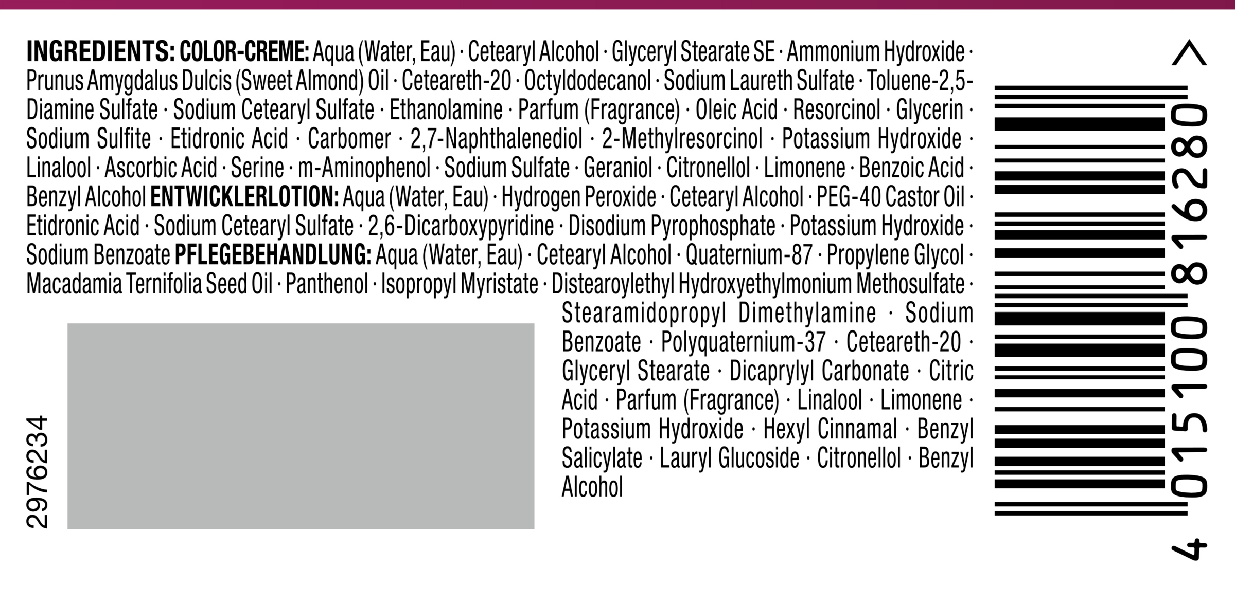 Color-Creme: Aqua (Water, Eau), Cetearyl Alcohol, Glyceryl Stearate SE, Ammonium Hydroxide, Prunus Amygdalus Dulcis (Sweet Almond) Oil, Ceteareth-20, Octyldodecanol, Sodium Laureth Sulfate, Toluene-2,5-Diamine Sulfate, Sodium Cetearyl Sulfate, Ethanolamine, Parfum (Fragrance), Oleic Acid, Resorcinol, Glycerin, Sodium Sulfite, Etidronic Acid, Carbomer, 2,7-Naphthalenediol, 2-Methylresorcinol, Potassium Hydroxide, Linalool, Ascorbic Acid, Serine, m-Aminophenol, Sodium Sulfate, Geraniol, Citronellol, Limonene, Benzoic Acid, Benzyl Alcohol|