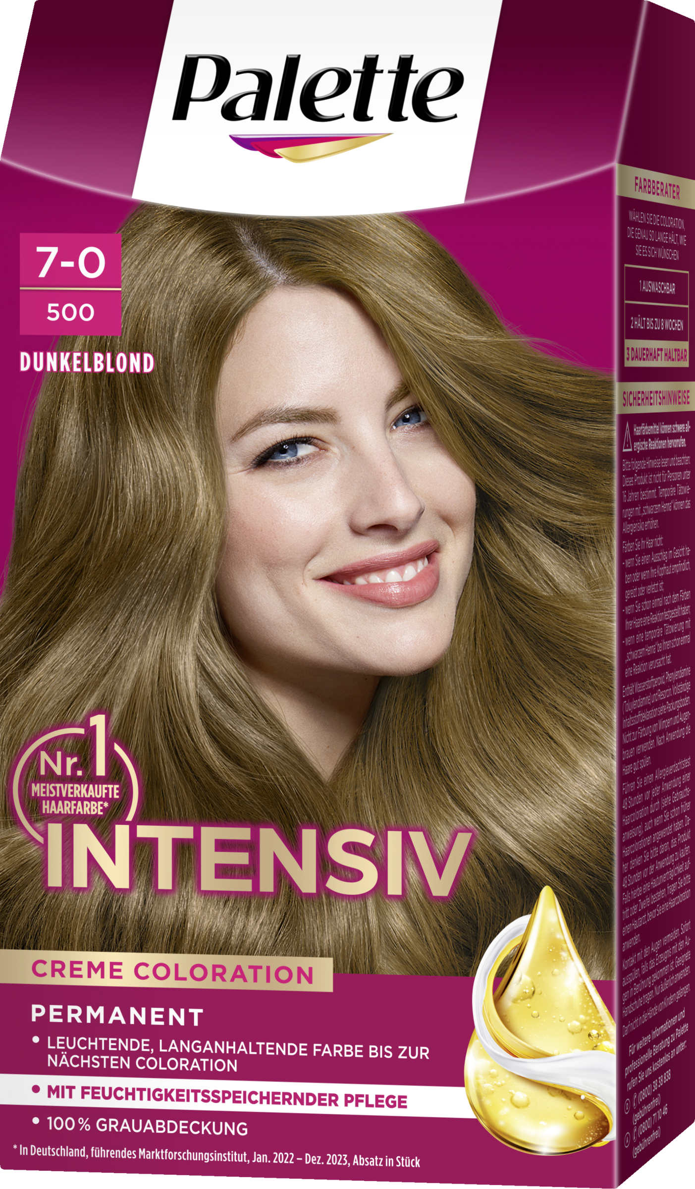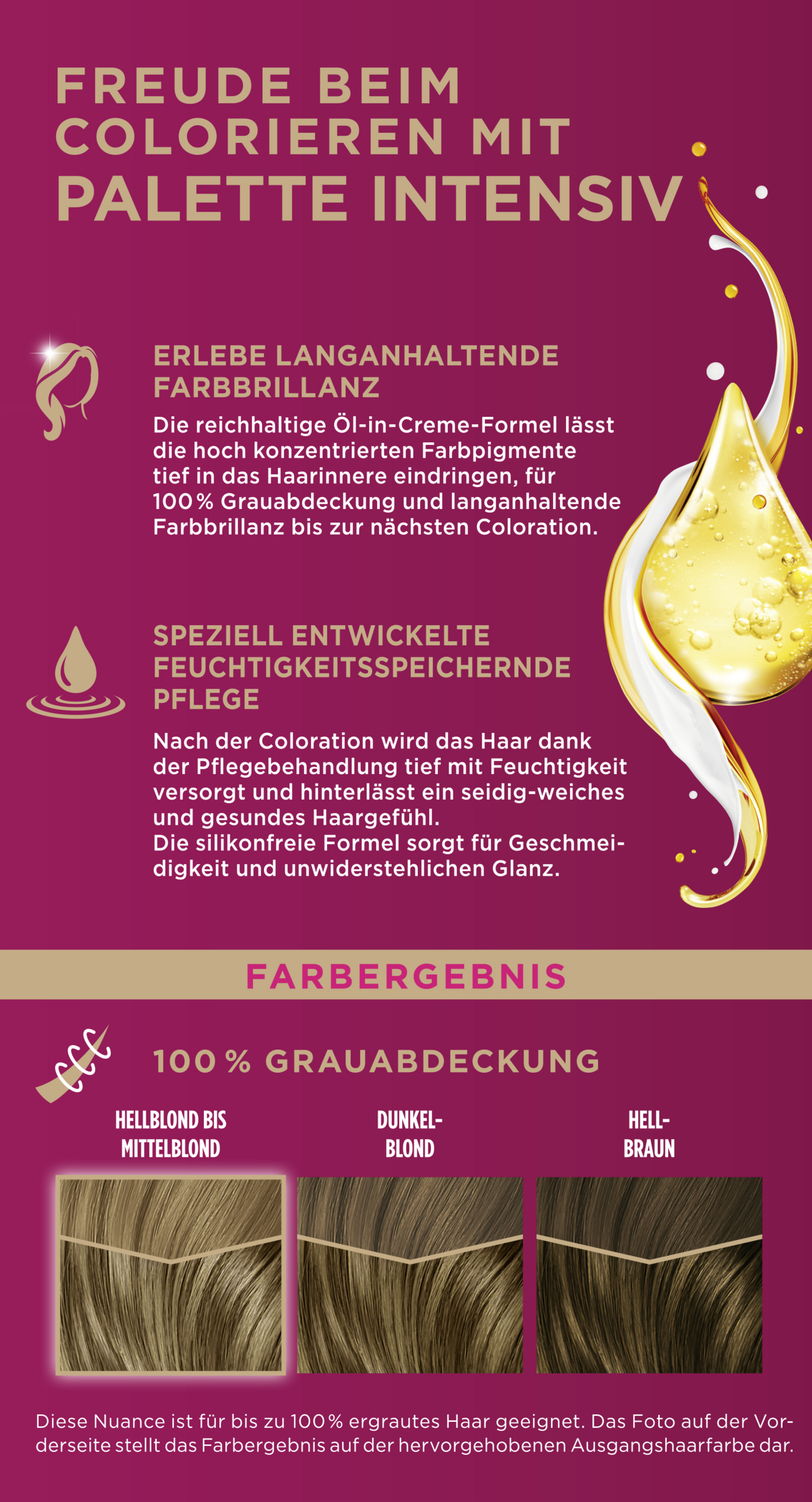 Color-Creme für leuchtende und langanhaltende Farbergebnisse. Die Palette Intensiv Creme Coloration sorgt für leuchtende, langanhaltende Farbergebnisse, intensiven Farbglanz sowie perfekte Grauabdeckung. Die Color-Creme mit reichhaltiger Öl-in-Creme-Formel lässt die hoch konzentrierten Farbpigmente tief in das Haarinnere eindringen, für 100 % Grauabdeckung und eine langanhaltende Farbbrillanz bis zur nächsten Coloration. Zusätzlich ist die speziell entwickelte, feuchtigkeitsspendende Pflege der Haarfarbe silikonfrei und sorgt für Geschmeidigkeit und unwiderstehlichen Glanz. Das Haar wird dank der Pflegebehandlung tief mit Feuchtigkeit versorgt und hinterlässt ein seidig-weiches und gesundes Haargefühl.