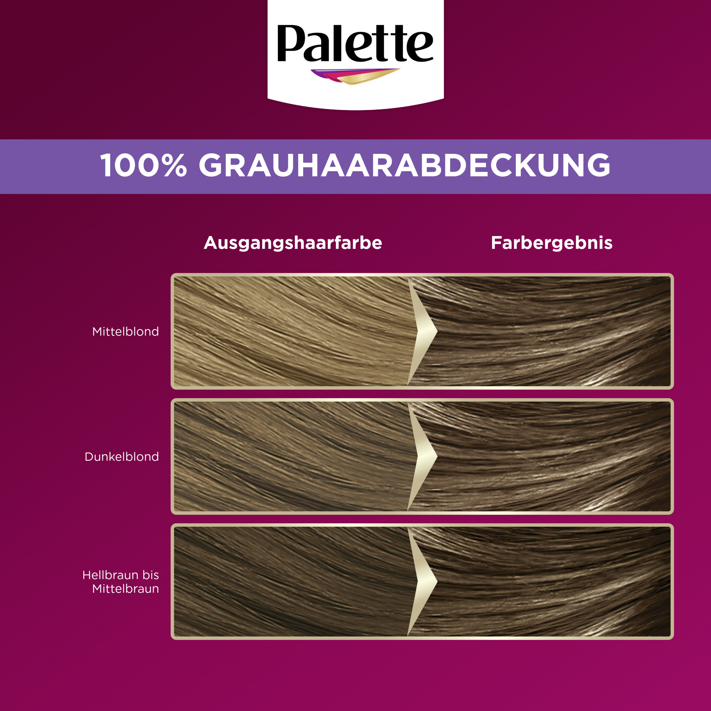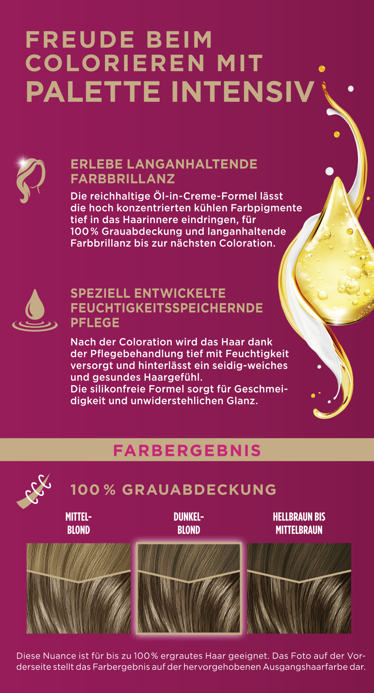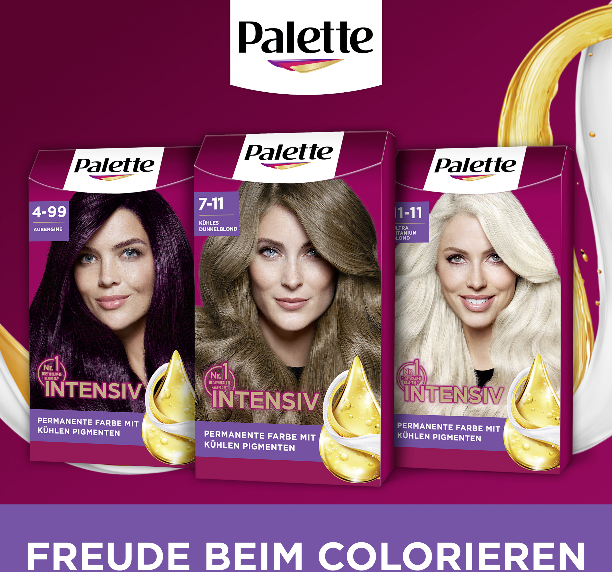 Color-Creme für leuchtende und langanhaltende Farbergebnisse. Die Palette Intensiv Creme Coloration sorgt für leuchtende, langanhaltende Farbergebnisse, intensiven Farbglanz sowie perfekte Grauabdeckung. Die Color-Creme mit reichhaltiger Öl-in-Creme-Formel lässt die hoch konzentrierten Farbpigmente tief in das Haarinnere eindringen, für 100 % Grauabdeckung und eine langanhaltende Farbbrillanz bis zur nächsten Coloration. Zusätzlich ist die speziell entwickelte, feuchtigkeitsspendende Pflege der Haarfarbe silikonfrei und sorgt für Geschmeidigkeit und unwiderstehlichen Glanz. Das Haar wird dank der Pflegebehandlung tief mit Feuchtigkeit versorgt und hinterlässt ein seidig-weiches und gesundes Haargefühl.