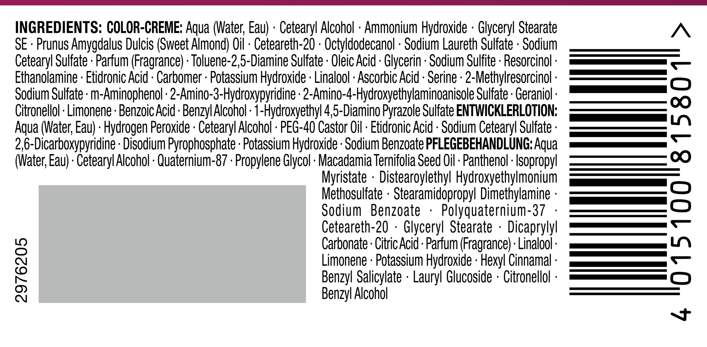 Color-Creme: Aqua (Water, Eau), Cetearyl Alcohol, Ammonium Hydroxide, Glyceryl Stearate SE, Prunus Amygdalus Dulcis (Sweet Almond) Oil, Ceteareth-20, Octyldodecanol, Sodium Laureth Sulfate, Sodium Cetearyl Sulfate, Parfum (Fragrance), Toluene-2,5-Diamine Sulfate, Oleic Acid, Glycerin, Sodium Sulfite, Resorcinol, Ethanolamine, Etidronic Acid, Carbomer, Potassium Hydroxide, Linalool, Ascorbic Acid, Serine, 2-Methylresorcinol, Sodium Sulfate, m-Aminophenol, 2-Amino-3-Hydroxypyridine, 2-Amino-4-Hydroxyethylaminoanisole Sulfate, Geraniol, Citronellol, Limonene, Benzoic Acid, Benzyl Alcohol, 1-Hydroxyethyl 4,5-Diamino Pyrazole Sulfate|
