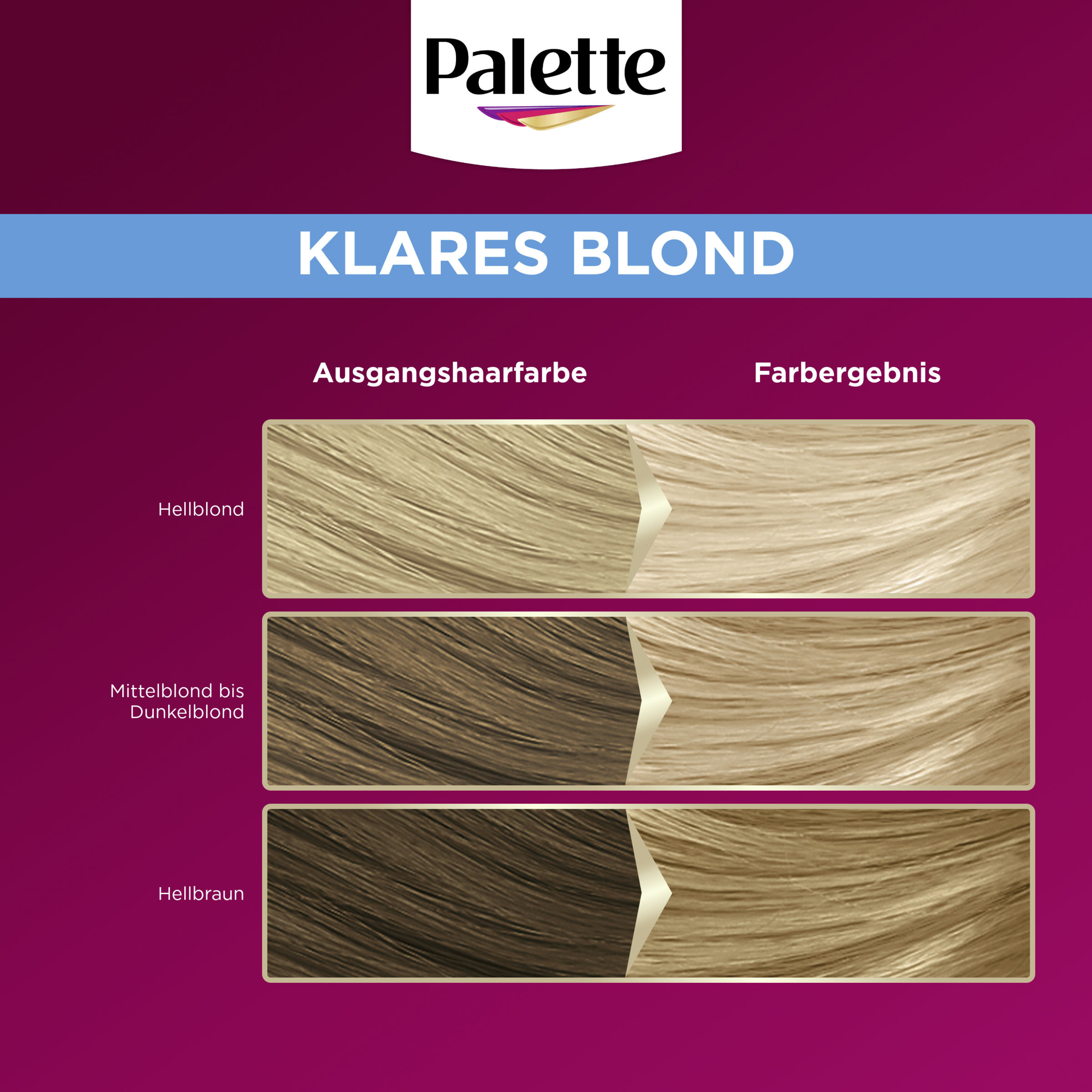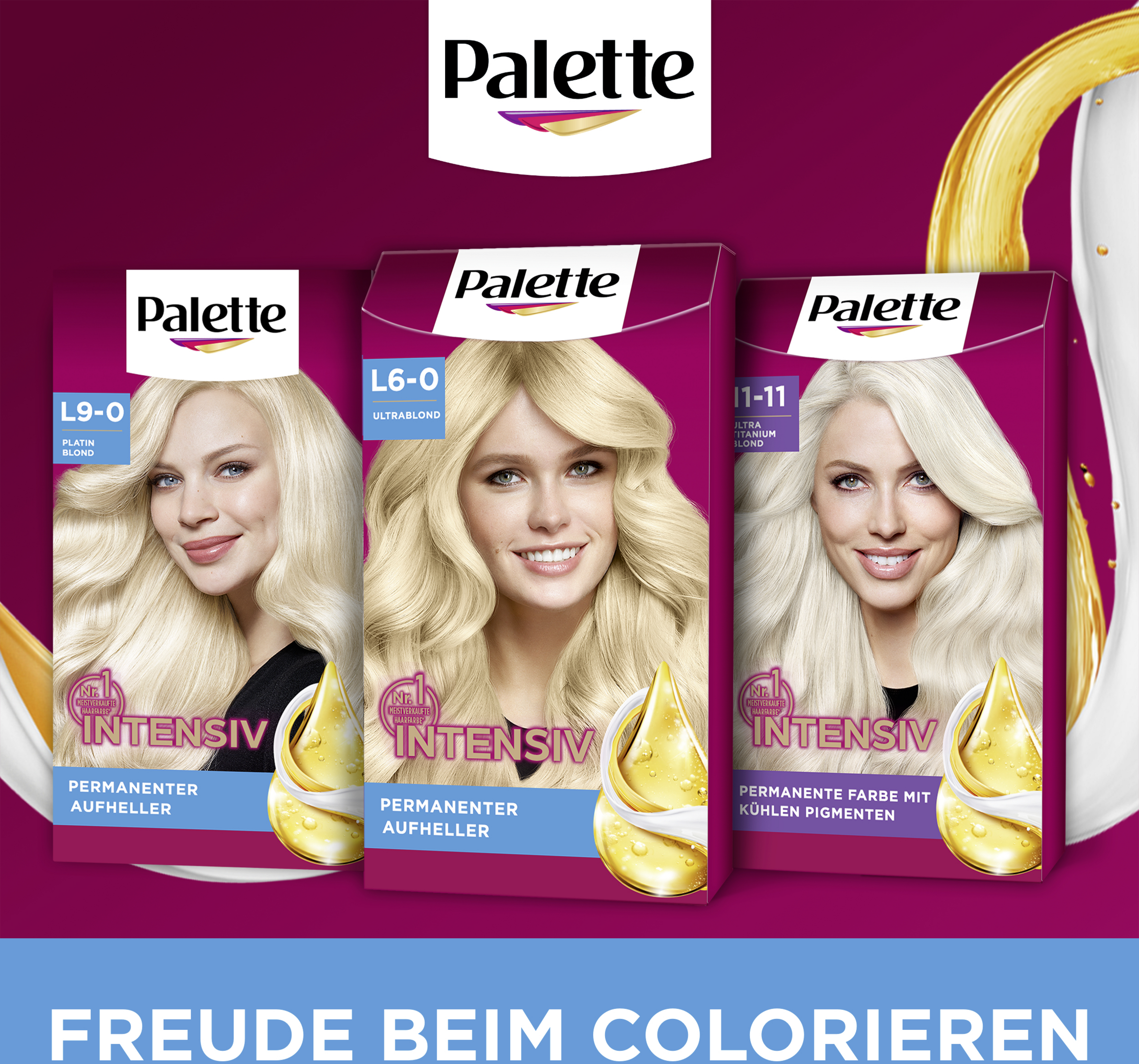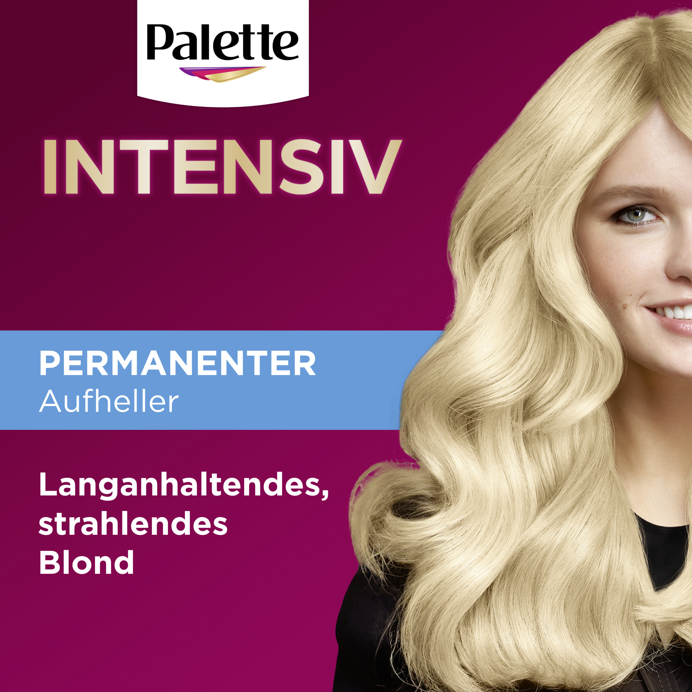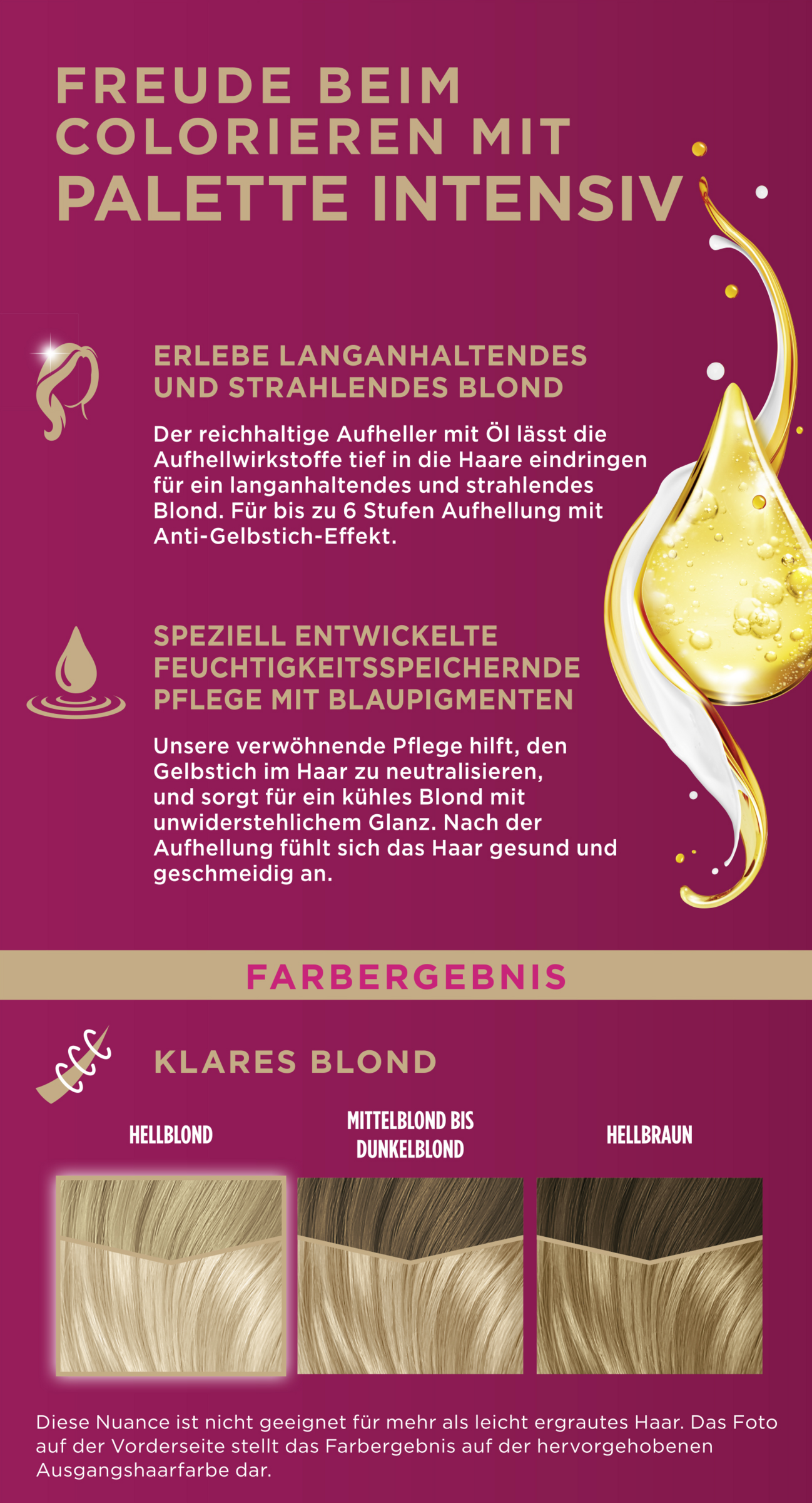 Palette Intensiv Creme Coloration – Permanenter AufhellerDie Palette Intensiv Creme Coloration verleiht ein langanhaltendes, strahlendes Blond. Der Aufheller mit Öl, lässt die Aufhellwirkstoffe tief in die Haare eindringen für ein langanhaltendes und strahlendes Blond und bis zu 6 Stufen Aufhellung. Zusätzlich hilft unsere speziell entwickelte, feuchtigkeitsspeichernde Pflege dank der enthaltenen Blaupigmente dabei, den Gelbstich im Haar zu neutralisieren und sorgt für ein kühles Blond mit unwiderstehlichem Glanz. Nach der Aufhellung fühlt sich das Haar gesund und geschmeidig an.Die permanente Haarfarbe kommt in einer recycelten Aluminiumtube, mit recyceltem Papier und besteht aus min. 76 % Inhaltsstoffen natürlichen Ursprungs (inkl. Wasser). Die Produktvorteile im Detail: Strahlendes, langanhaltendes Blond Anti-Gelbstich-Effekt Feuchtigkeitsspeichernde Pflege mit Blaupigmenten Bis zu 6 Stufen Aufhellung Anwendungshinweis: Diese Nuance ist für eine hellblonde bis hellbraune Naturhaarfarbe geeignet. Diese Nuance wird für ergrautes Haar nicht empfohlen. Die genaue Anwendung entnehmen Sie bitte der Packungsbeilage.