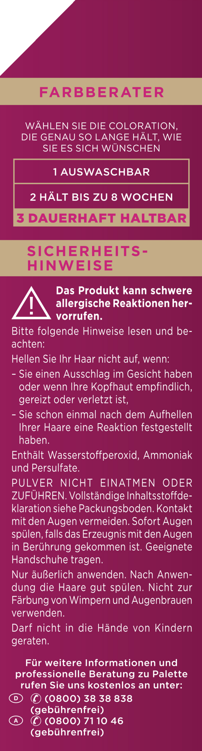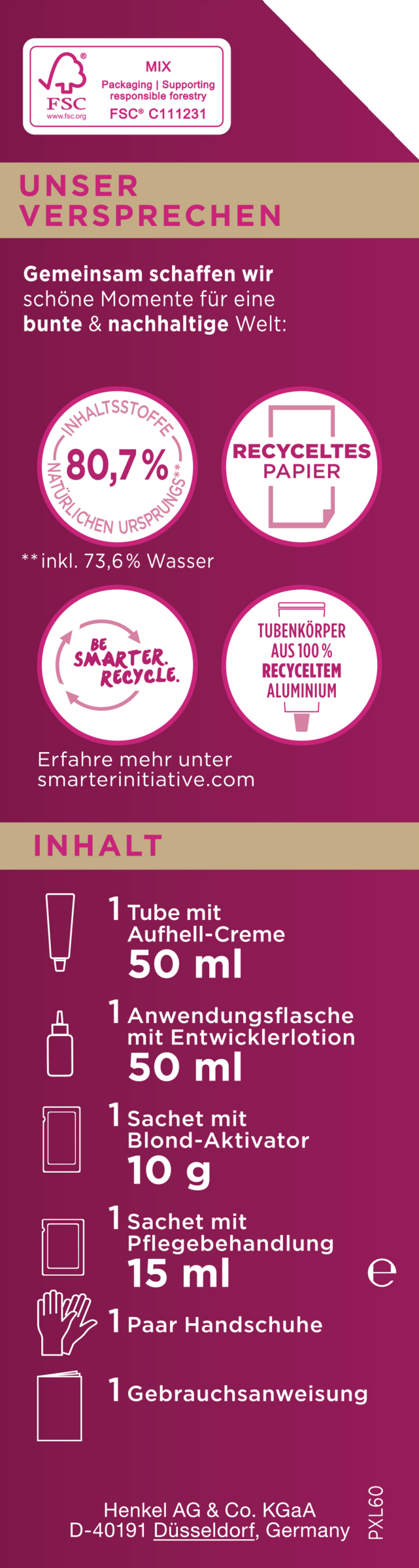 Enthält Wasserstoffperoxid, Ammoniak und Persulfate. PULVER NICHT EINATMEN ODER ZUFÜHREN. Vollständige Inhaltsstoffdeklaration siehe Packungsboden. Kontakt mit den Augen vermeiden. Sofort Augen spülen, falls das Erzeugnis mit den Augen in Berührung gekommen ist. Geeignete Handschuhe tragen. Nur äußerlich anwenden. Nach Anwendung die Haare gut spülen. Nicht zur Färbung von Wimpern und Augenbrauen verwenden.