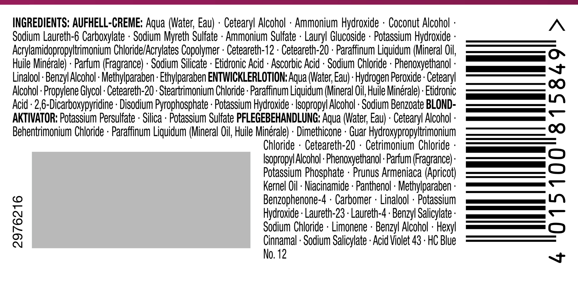 Aufhell-Creme: Aqua (Water, Eau), Cetearyl Alcohol, Ammonium Hydroxide, Coconut Alcohol, Sodium Laureth-6 Carboxylate, Sodium Myreth Sulfate, Ammonium Sulfate, Lauryl Glucoside, Potassium Hydroxide, Acrylamidopropyltrimonium Chloride/Acrylates Copolymer, Ceteareth-12, Ceteareth-20, Paraffinum Liquidum (Mineral Oil, Huile Minérale), Parfum (Fragrance), Sodium Silicate, Etidronic Acid, Ascorbic Acid, Sodium Chloride, Phenoxyethanol, Linalool, Benzyl Alcohol, Methylparaben, Ethylparaben