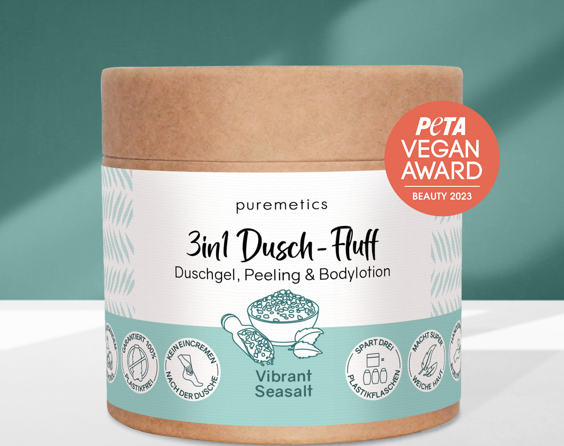 Die Verpackung ist biologisch abbaubar und besteht aus Kraftkarton mit einer wasserdichten Membran. Bewahre sie bitte trotzdem trocken auf. Am besten entnimmst du vor dem Duschen etwas Dusch-Fluff mit einem Löffel oder Schälchen für den Nassraum.