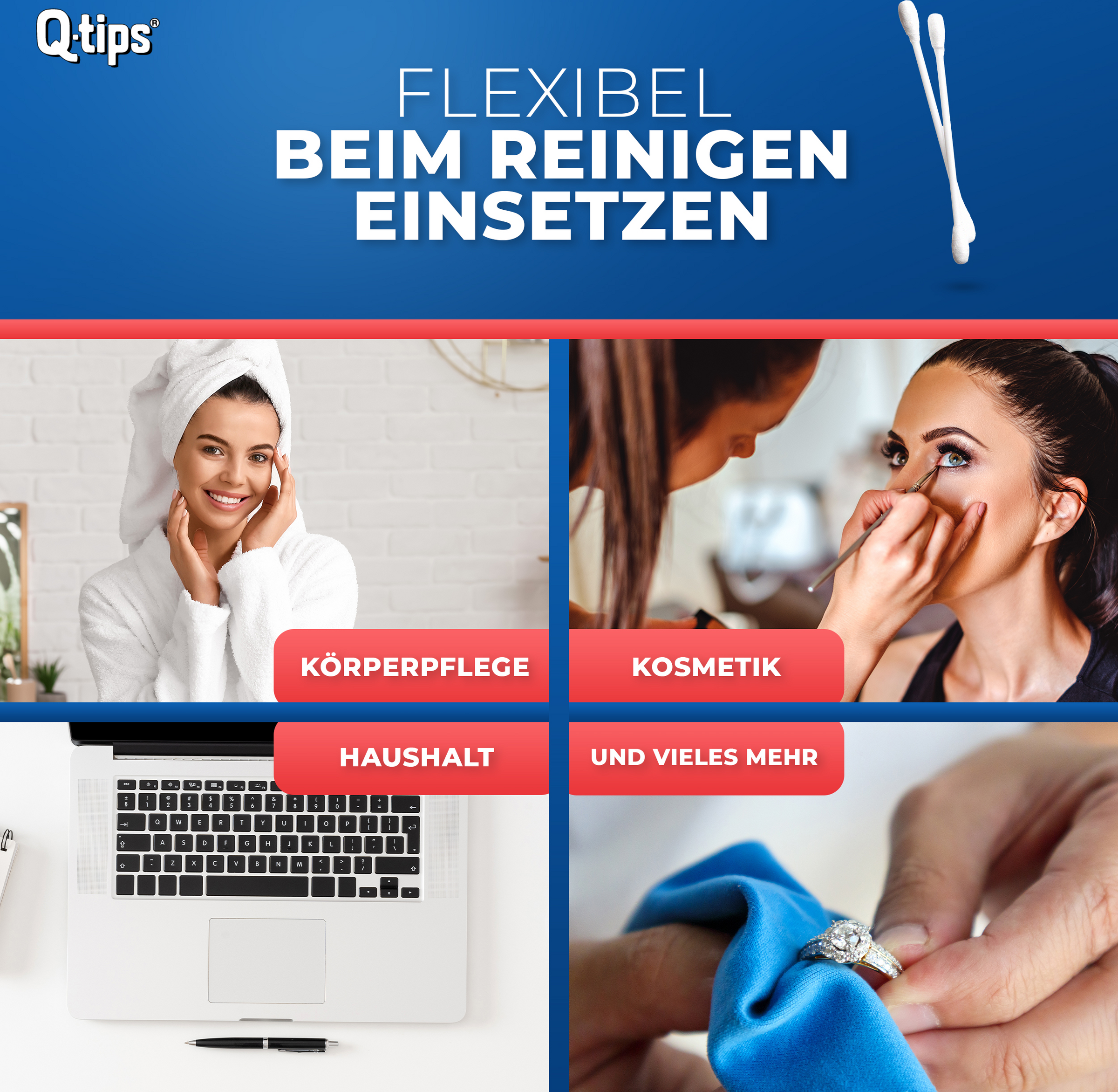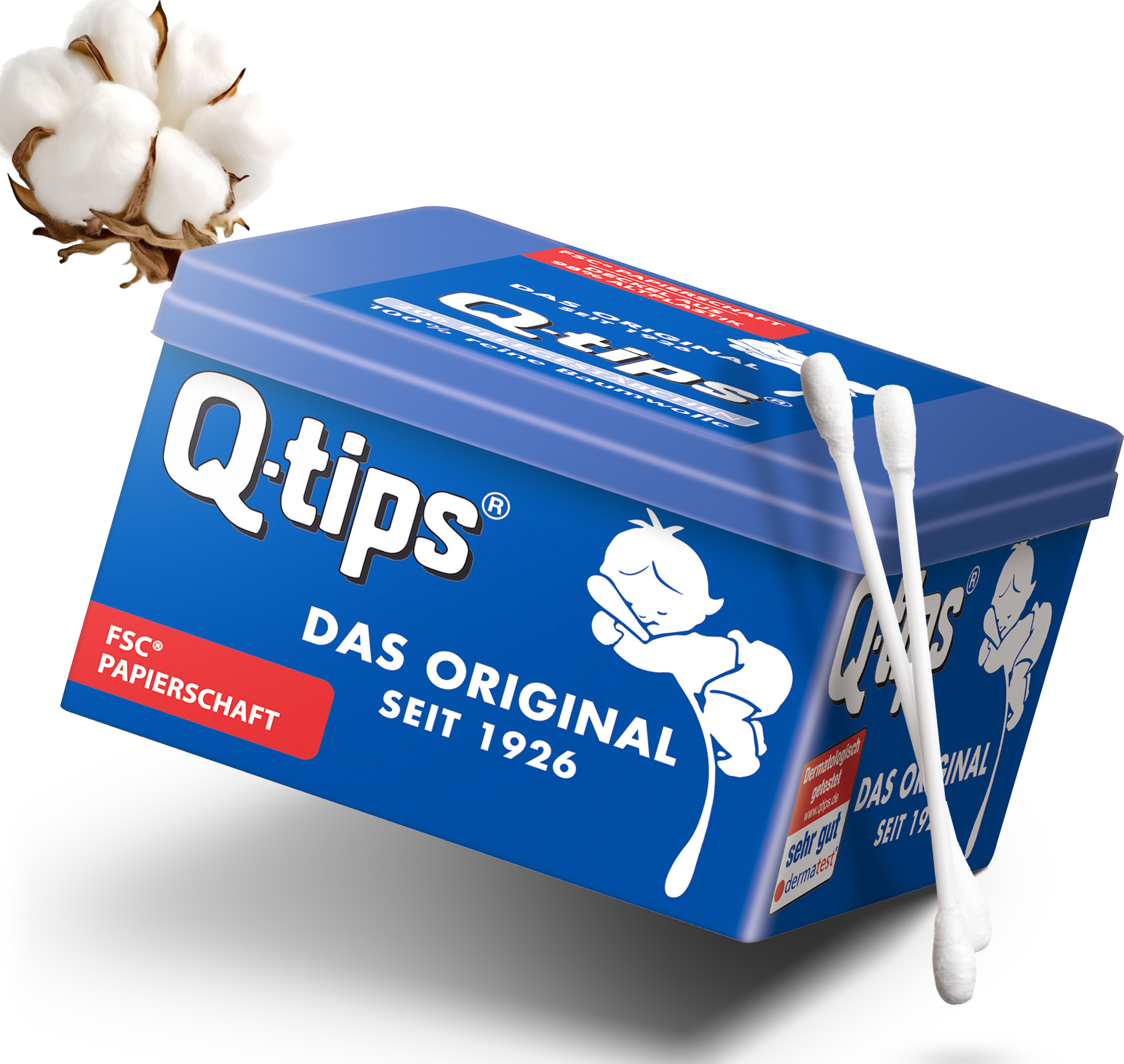 Q-tips® Pflegestäbchen sind wattesanft, hygienisch und haben Tupfer aus 100% Baumwolle.