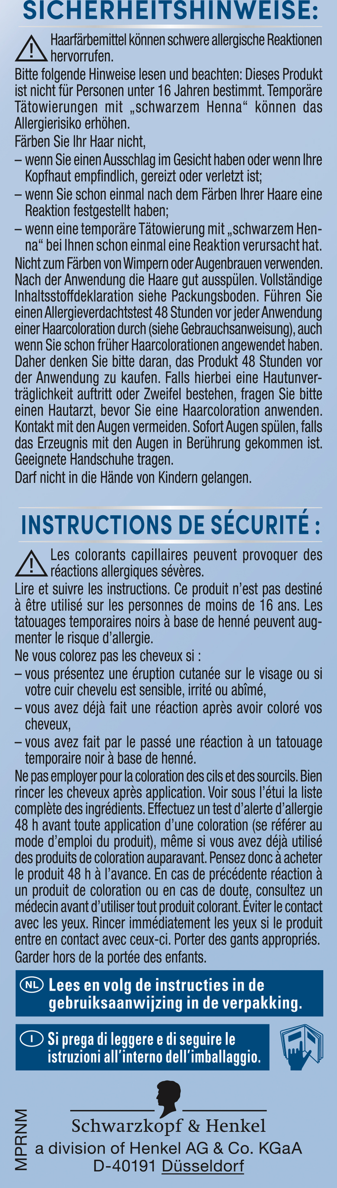 Nicht zum Färben von Wimpern und Augenbrauen verwenden. Nach der Anwendung die Haare gut ausspülen. Vollständige Inhaltsstoffdeklaration siehe Packungsboden. Führen Sie einen Allergieverdachtstest 48 Stunden vor jeder Anwendung einer Haarcoloration durch (siehe Gebrauchsanweisung), auch wenn Sie schon früher Haarcolorationen angewendet haben. Daher denken Sie bitte daran, das Produkt 48 Stunden vor der Anwendung zu kaufen. Falls hierbei eine Hautunverträglichkeit auftritt oder Zweifel bestehen, fragen Sie bitte einen Hautarzt, bevor Sie eine Haarcoloration anwenden. Kontakt mit den Augen vermeiden. Sofort Augen spülen, falls das Erzeugnis mit den Augen in Berührung gekommen ist. Geeignete Handschuhe tragen.