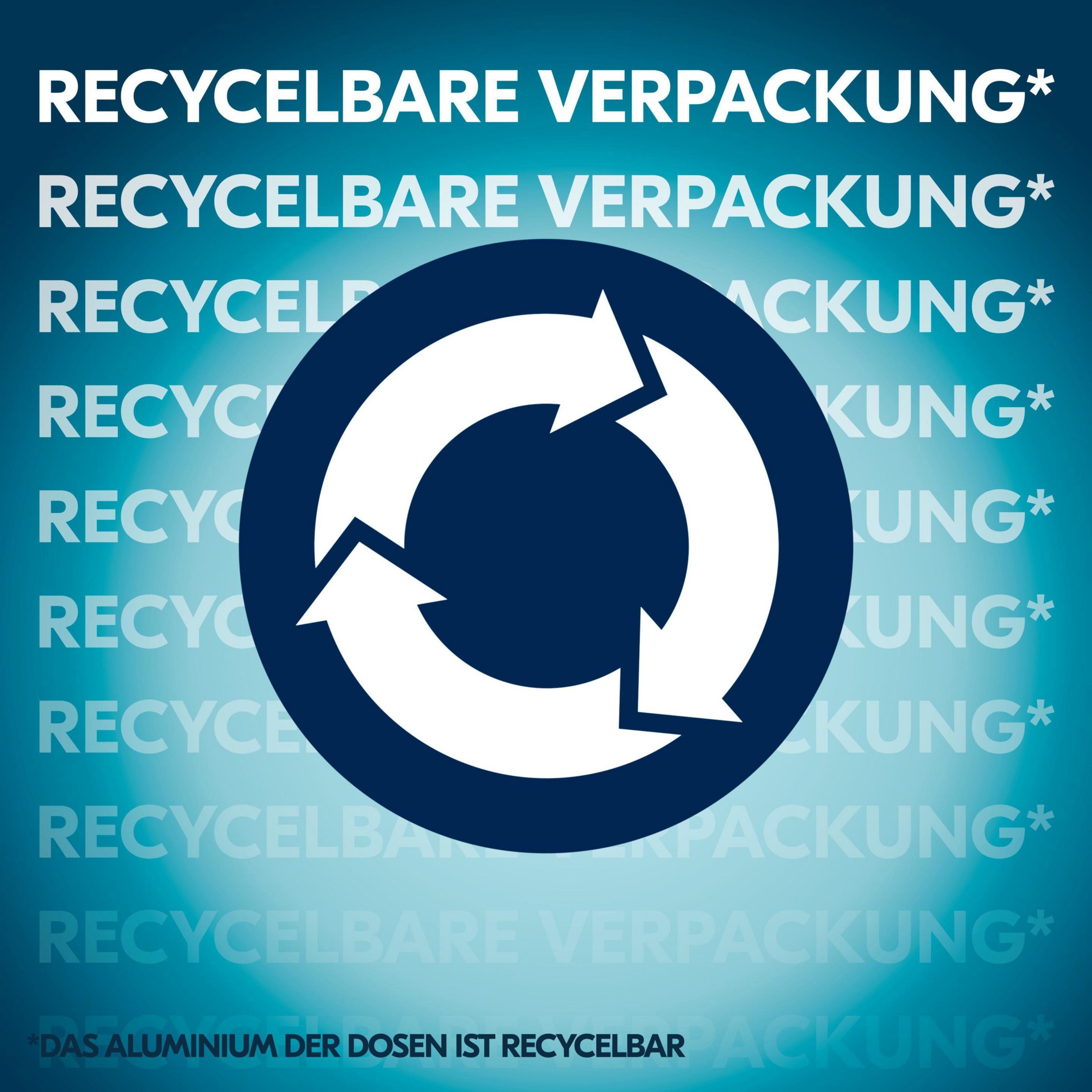 Für eine nachhaltige Zukunft ist das Aluminium der Verpackung des Deodorants unendlich recycelbar und wurde mit 100% Ökostrom produziert. Nach der Entleerung bitte in die Wertstoffsammlung (in der EU) geben.
