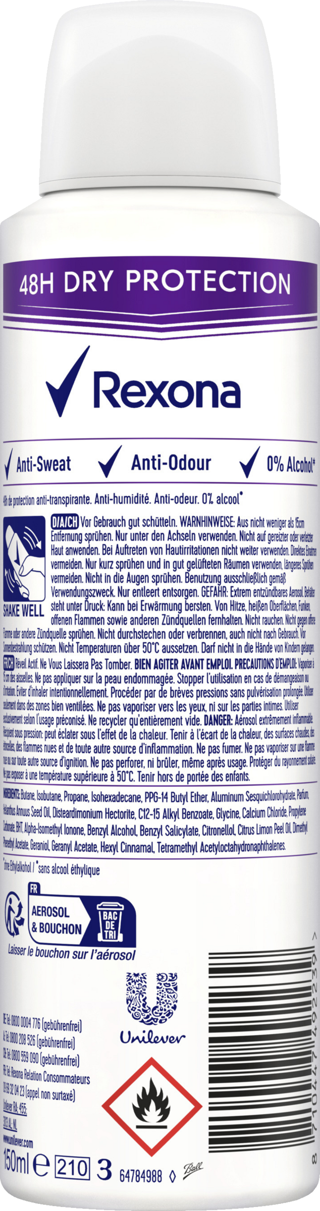 Butane, Isobutane, Propane, Cyclopentasiloxane, Aluminum Chlorohydrate, Parfum, PPG-14 Butyl Ether, Disteardimonium Hectorite, BHT, Propylene Carbonate, Dimethiconol, Caprylic/Capric Triglyceride, Gelatin Crosspolymer, Cellulose Gum, Sodium Benzoate, Hydrated Silica, Aqua, Sodium Starch Octenylsuccinate, Maltodextrin, Hydrolysed Corn Starch Octenylsuccinate, Silica, Alpha-Isomethyl Ionone, Benzyl Alcohol, Benzyl Salicylate, Citronellol, Geraniol, Hexyl Cinnamal, Limonene.