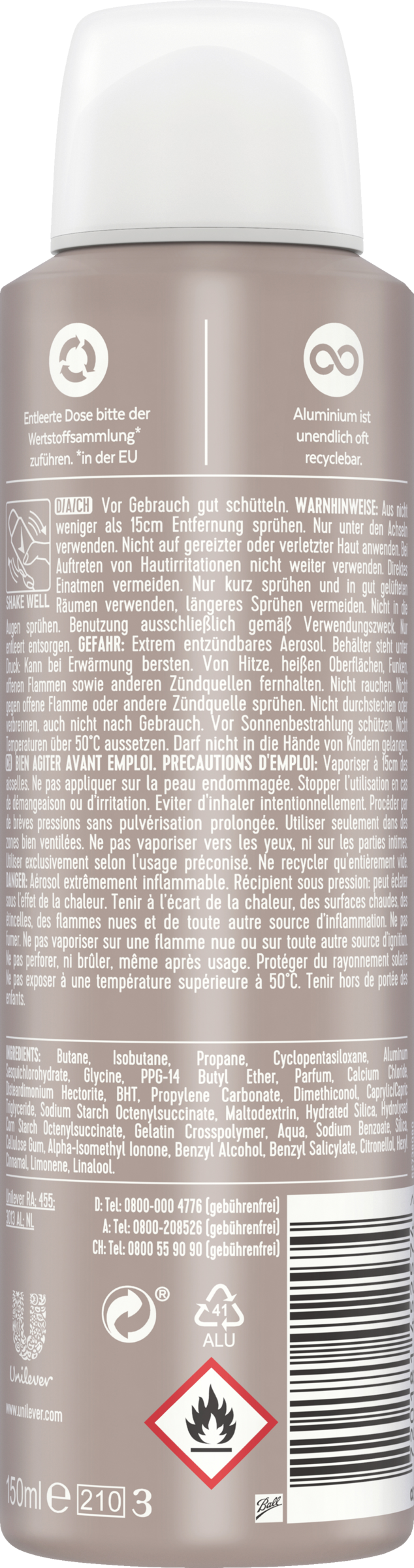 Butane, Isobutane, Propane, Cyclopentasiloxane, Aluminum Sesquichlorohydrate, Glycine, PPG-14 Butyl Ether, Parfum, Calcium Chloride, Disteardimonium Hectorite, BHT, Propylene Carbonate, Dimethiconol, Caprylic/Capric Triglyceride, Sodium Starch Octenylsuccinate, Maltodextrin, Hydrated Silica, Hydrolysed Corn Starch Octenylsuccinate, Gelatin Crosspolymer, Aqua, Sodium Benzoate, Silica, Cellulose Gum, Alpha-Isomethyl Ionone, Benzyl Alcohol, Benzyl Salicylate, Citronellol, Hexyl Cinnamal, Limonene, Linalool.