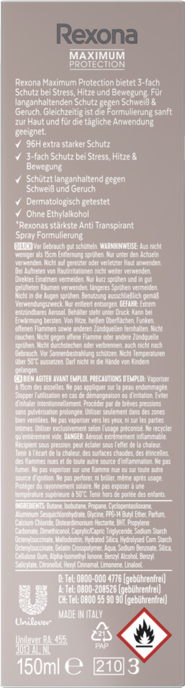 - Rexona Maximum Protection Deospray Clean Fresh bietet bis zu 96 Stunden extra starken und langanhaltenden Schutz vor Schweiß und Körpergeruch