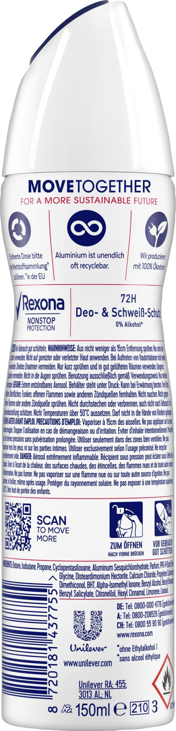 Hier helfen Deodorants und Anti Transpirante. Und so funktioniert es: Die aktiven Bestandteile in Anti Transpiranten verteilen sich auf der Hautoberfläche und bilden in Verbindung mit der körpereigenen Feuchtigkeit eine Art Gel. Dieses legt sich über die Schweißdrüsen und bietet so 72 Stunden zuverlässigen Schutz. Anwendungshinweis: Das Rexona Anti Transpirant Spray schütteln, um die Inhaltsstoffe zu aktivieren. Dann aus einem Abstand von 15 cm gleichmäßig in kurzen Stößen auf die Achseln sprühen. Schon ist man bereit, frisch in den Tag zu starten. Das Aluminium der Metalldose ist unendlich oft recyclebar. Nach der Entleerung bitte in die Wertstoffsammlung geben (gilt in der EU). Unsere Werke produzieren mit 100% Ökostrom. Alle Produkte von Rexona sind darauf ausgerichtet, Probleme mit Schweiß zu bekämpfen und/oder Körpergeruch zu unterbinden. Rexona hat es sich zur Aufgabe gemacht, so viel wie möglich über das Thema Schwitzen in Erfahrung zu bringen. Alle Erkenntnisse fließen dann sofort in neue, innovative Produktideen ein, um effektive Produkte zu entwickeln. Also völlig egal, ob man gerade einen Berg erklimmen möchte oder einfach nur zum Bus rennt, ein wichtiger Vortrag oder ein Date ansteht, ein Deo von Rexona wirkt gegen die Probleme der Transpiration. Rexona lässt Dich nicht im Stich!
