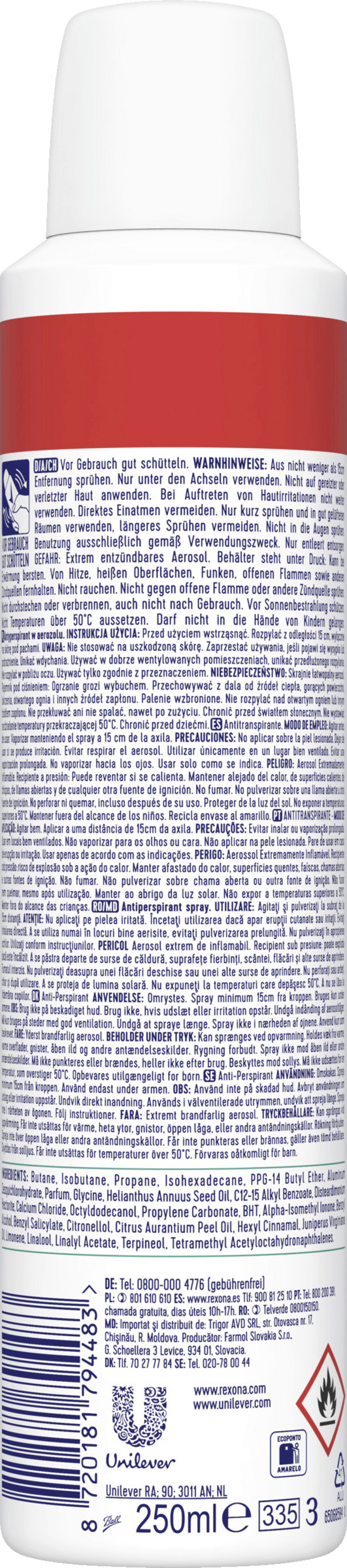 Das Rexona Nonstop Protection Anti Transpirant Spray XXL Shower Fresh schützt bis zu 72 Stunden vor Schweiß und Körpergeruch. Das Deospray mit patentierter Technologie sorgt dank effektivem und schweißhemmendem Wirkstoff für zuverlässigen Schutz. Dazu verleiht das Deodorant Frauen einen frischen, dezenten Duft für ein Wie-frisch-geduscht-Gefühl. Jeden Tag langanhaltende Frische und selbstbewusstes Auftreten mit Rexona. Das Wichtigste gleich zu Anfang: Schwitzen ist etwas völlig Normales. Das kann unter anderem folgende Gründe haben: Hohe Temperaturen, sportliche Betätigung, Stress – in all diesen Situationen wird der Körper durch das Schwitzen abgekühlt. Dabei entsteht nur 1% des Körperschweißes unter den Achseln – doch gerade dort können Schweißgeruch und Flecken sehr unangenehm und lästig werden. Hier helfen Deodorants und Anti Transpirante. Und so funktioniert es: Die aktiven Bestandteile in Anti Transpiranten verteilen sich auf der Hautoberfläche und bilden in Verbindung mit der körpereigenen Feuchtigkeit eine Art Gel. Dieses legt sich über die Schweißdrüsen und bietet so 72 Stunden zuverlässigen Schutz. Anwendungshinweis: Das Rexona Anti Transpirant Spray schütteln, um die Inhaltsstoffe zu aktivieren. Dann aus einem Abstand von 15 cm gleichmäßig in kurzen Stößen auf die Achseln sprühen. Schon ist man bereit, frisch in den Tag zu starten. Das Aluminium der Metalldose ist unendlich oft recycelbar. Nach der Entleerung bitte in die Wertstoffsammlung geben (gilt in der EU). Unsere Werke produzieren mit 100% Ökostrom. Alle Produkte von Rexona sind darauf ausgerichtet, Probleme mit Schweiß zu bekämpfen und/oder Körpergeruch zu unterbinden. Rexona hat es sich zur Aufgabe gemacht, so viel wie möglich über das Thema Schwitzen in Erfahrung zu bringen. Alle Erkenntnisse fließen dann sofort in neue, innovative Produktideen ein, um effektive Produkte zu entwickeln. Also völlig egal, ob man gerade einen Berg erklimmen möchte oder einfach nur zum Bus rennt, ein wichtiger Vortrag oder ein Date ansteht, ein Deo von Rexona wirkt gegen die Probleme der Transpiration. Rexona lässt Dich nicht im Stich